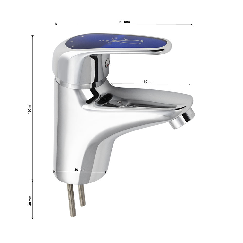 Смеситель для раковины, хромированный, с коротким изливом, литой корпус, синяя ручка с узором, шаровый, Материал изготовления — ЦАМ (цинк-алюминий-медь) + нержавеющая сталь. Крепление на шпильках, картридж d = 40 мм. Аэратор для экономии воды. Габаритные размеры: высота 150 мм, длина 140 мм, длина излива 90 мм, диаметр посадочного седла 50 мм, длина резьбы 40 мм, длина подводки 400 мм. Вес - 1,100 кг, объём - 0,00200 м3. В комплекте паспорт, корпус, подводка 1/2, крепеж, набор прокладок.