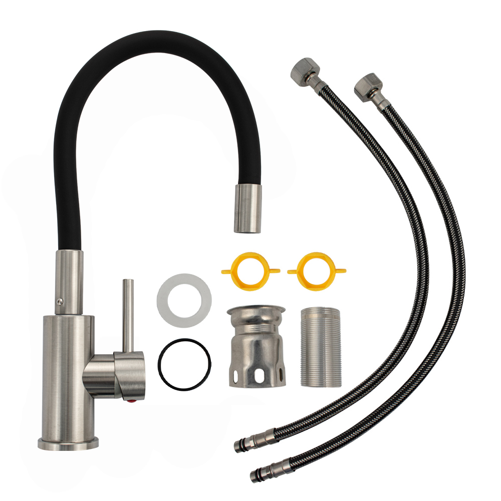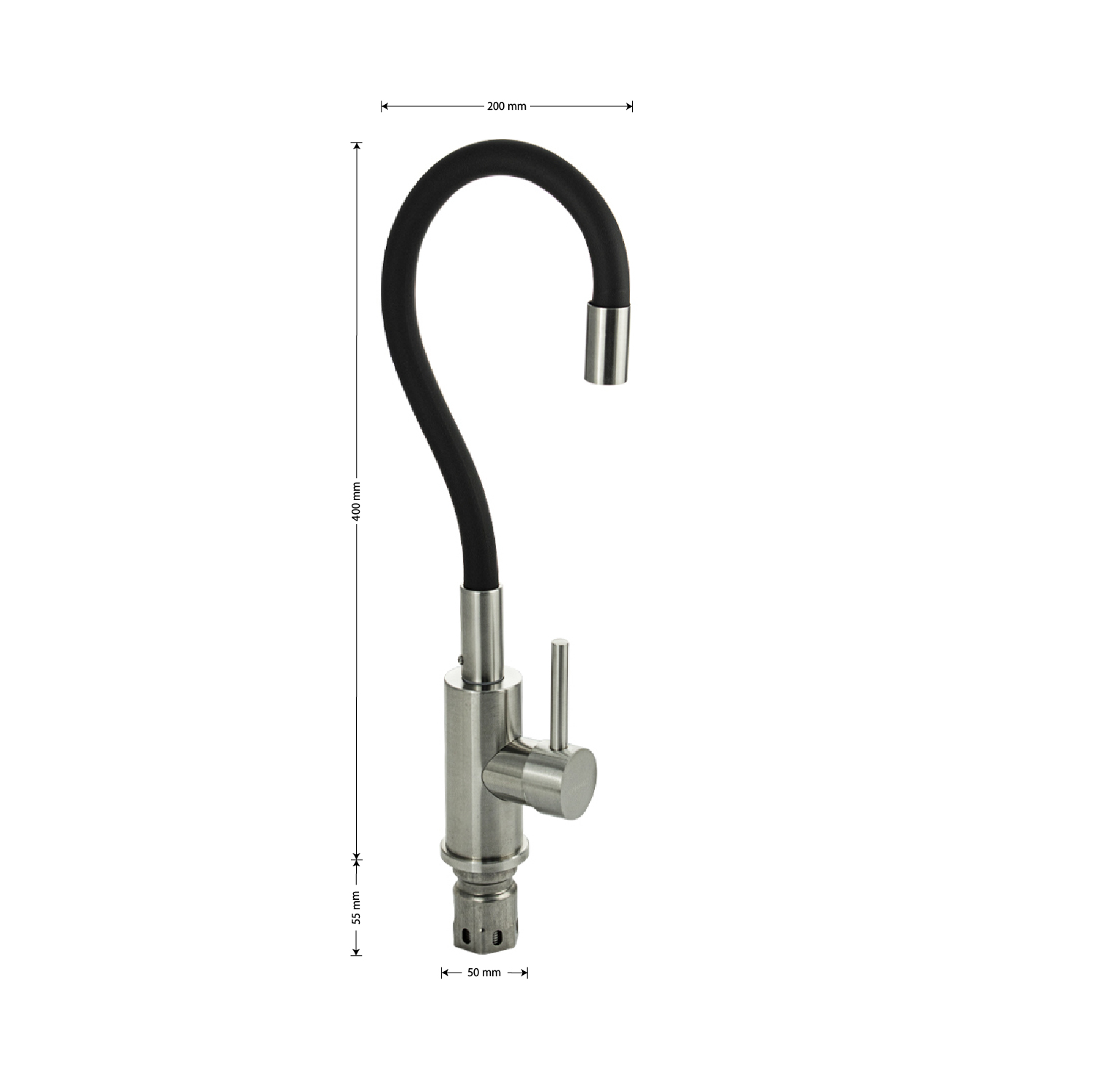 Смеситель для кухонной мойки и раковин, литой матовый корпус, из нержавеющей стали марки 304, с высоким гибким изливом, чёрного цвета, с аэратором для экономии воды, шаровый. Крепление резьба - гайка, картридж d = 25 мм, ручка литая. Такая модель может использоваться на домашней кухне, на даче, в медицинских учреждениях и общественных местах. Габаритные размеры: высота до 400 мм, длина до 200 мм, диаметр посадочного седла 50 мм, длина резьбы 55 мм, длина подводки 450 мм. Вес - 1.28 кг, объём - 0.00385 м3. В комплекте паспорт, корпус с изливом, подводка 1/2, крепеж, набор прокладок.