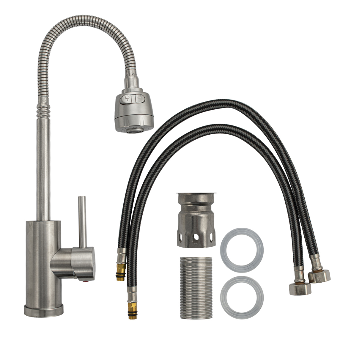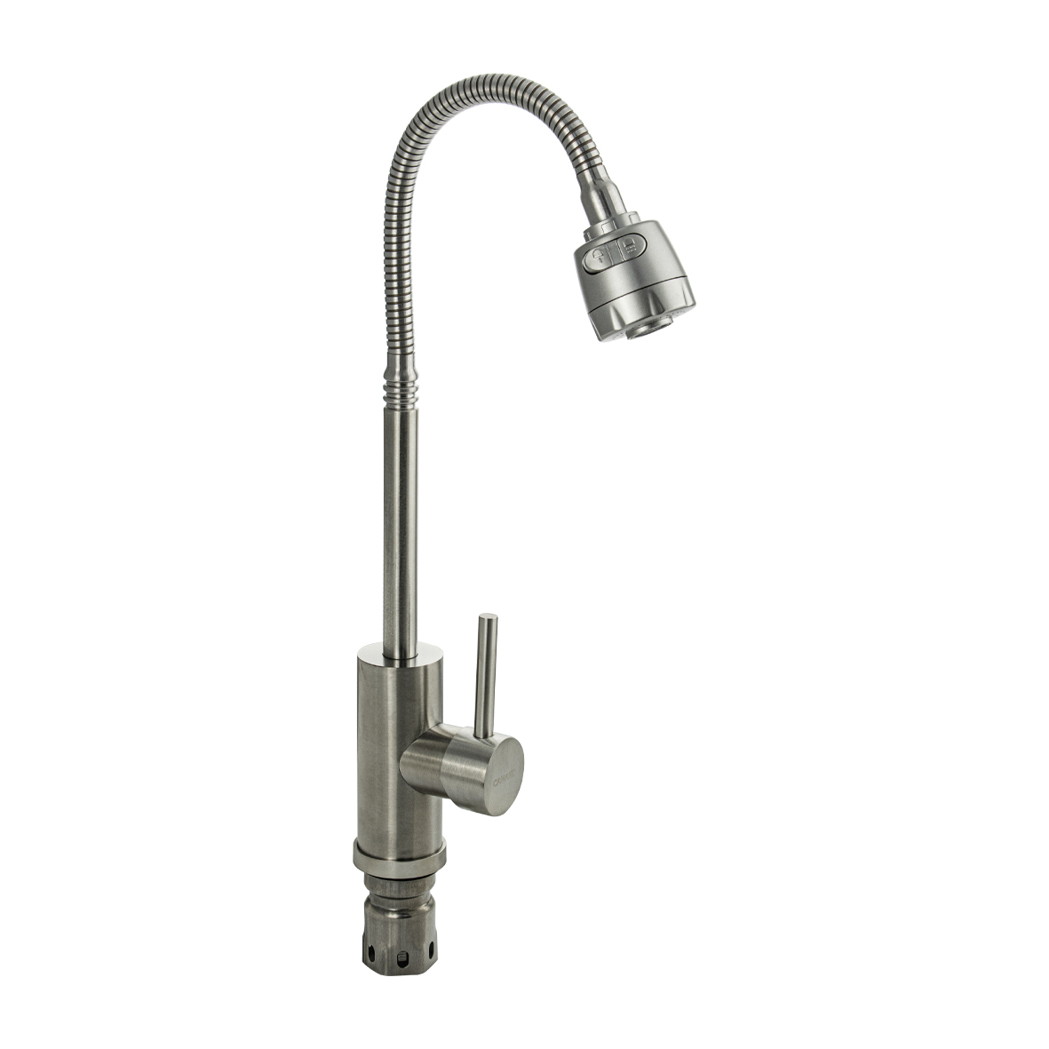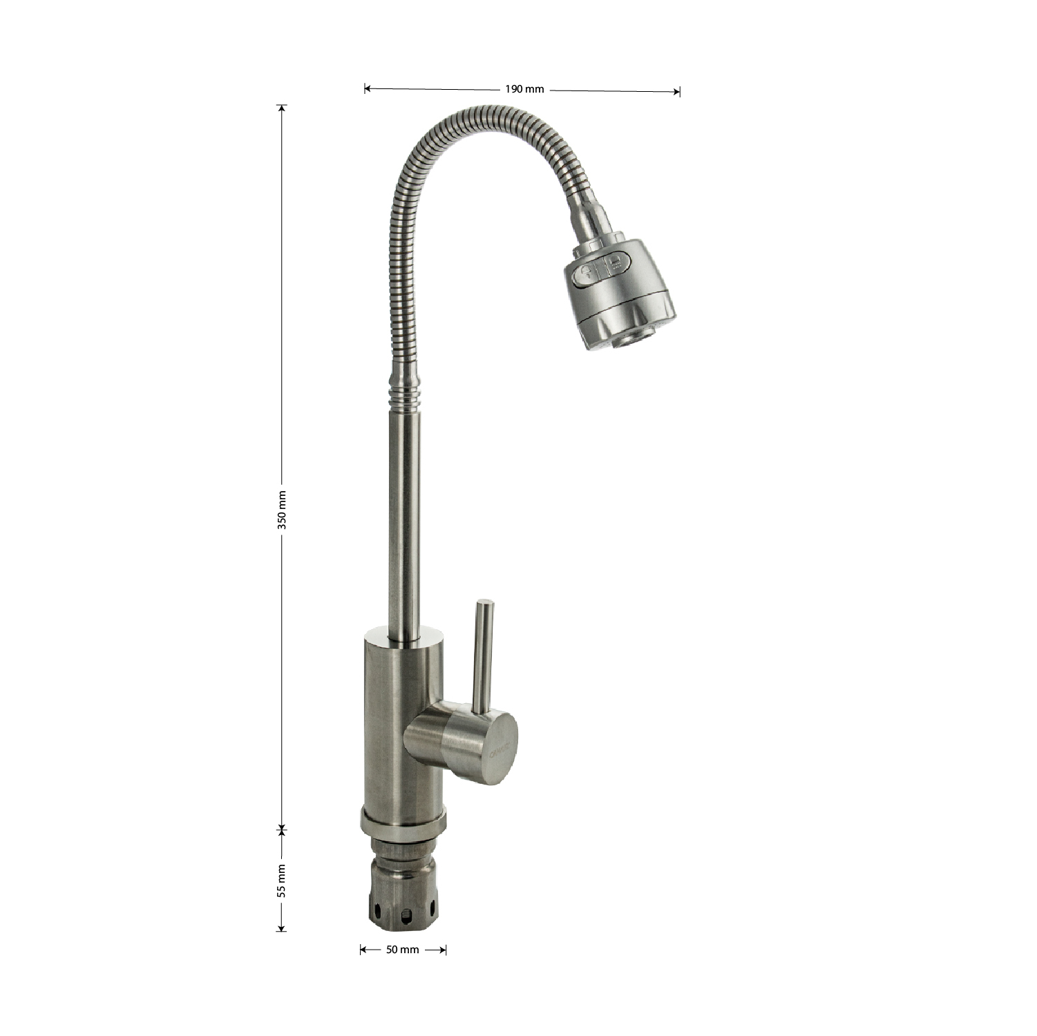 Смеситель для кухонной мойки и раковин, литой матовый корпус, из нержавеющей стали марки 304, с высоким гибким изливом, с большим двухрежимным аэратором для экономии воды, шаровый. Крепление резьба - гайка, картридж d = 25 мм, ручка литая. Такая модель может использоваться на домашней кухне, на даче, в медицинских учреждениях и общественных местах. Габаритные размеры: высота 350 мм, длина 190 мм, диаметр посадочного седла 50 мм, длина резьбы 55 мм, длина подводки 500 мм. Вес - 1,09 кг, объём - 0,00385 м3. В комплекте паспорт, корпус с изливом, подводка 1/2, крепеж, набор прокладок.