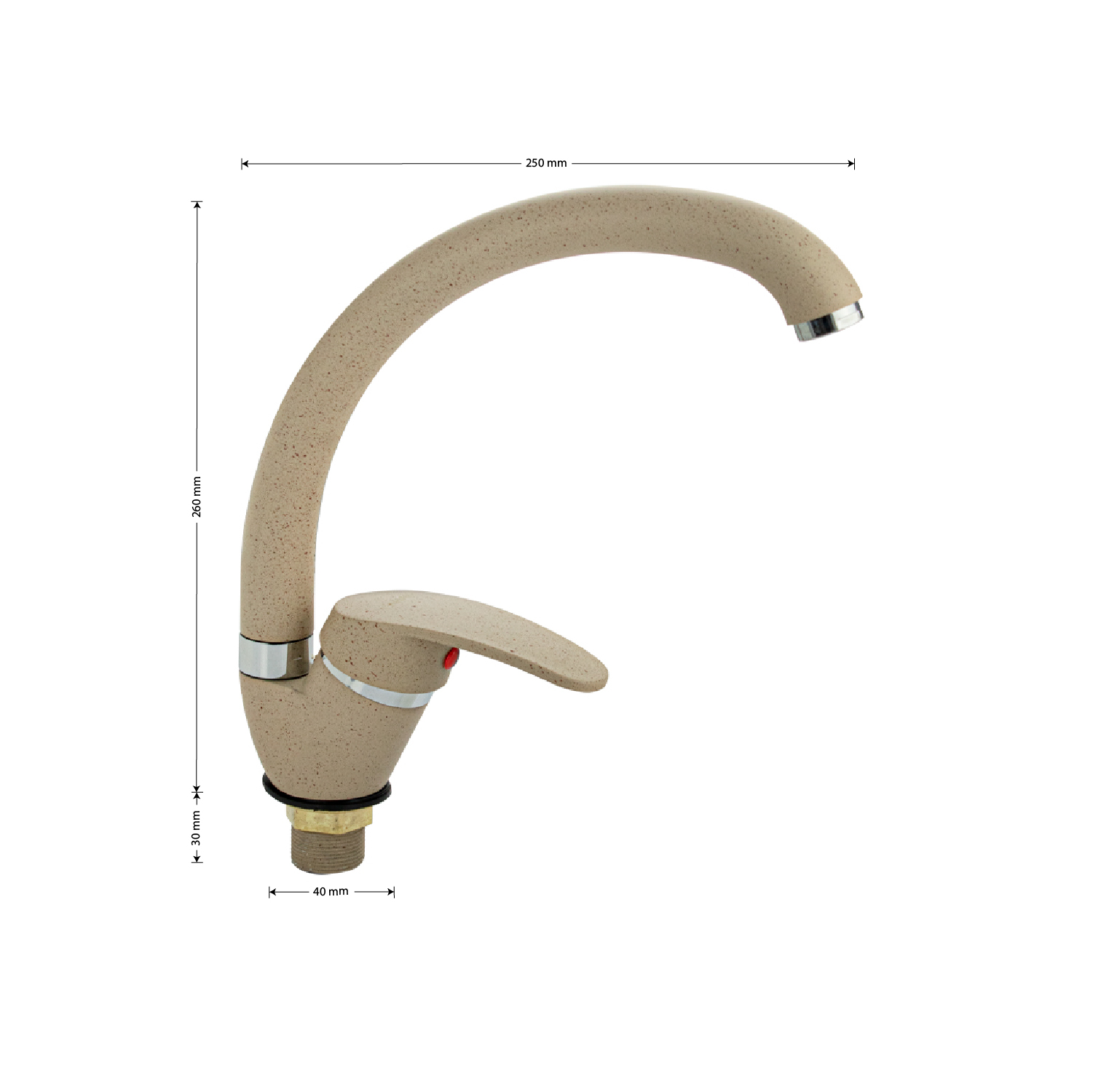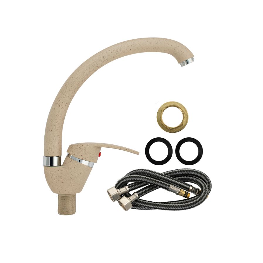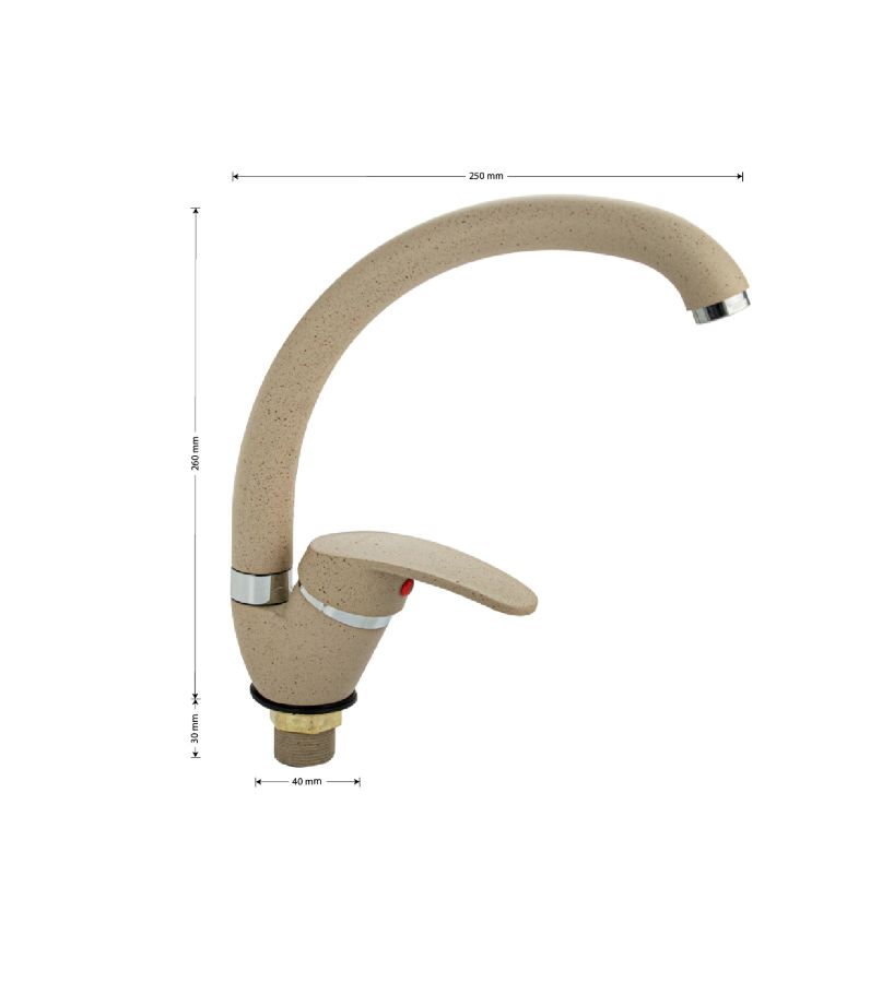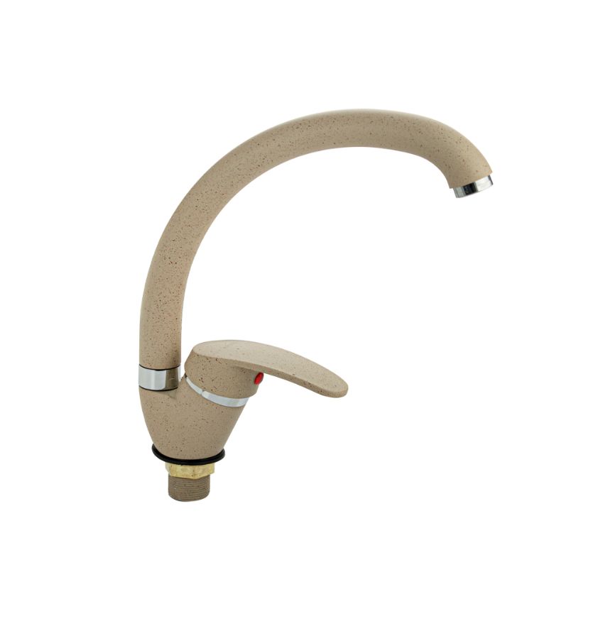 Смеситель для кухонной мойки и раковин, литой матовый корпус, из нержавеющей стали и аллюминия, с С - образным изливом, шаровый. Цвет бежевая эмаль с вкраплениями. Крепление резьба - гайка, картридж d = мм, ручка литая. Аэратор для экономии воды. Такая модель может использоваться на домашней кухне, на даче, в медицинских учреждениях и общественных местах. Габаритные размеры: высота 260 мм, длина 250 мм, диаметр посадочного седла 40 мм, длина резьбы 30 мм, длина подводки 400 мм. Вес - 0,65 кг, объём - 0,00357 м3. В комплекте паспорт, корпус с изливом, подводка 1/2, крепеж, набор прокладок.