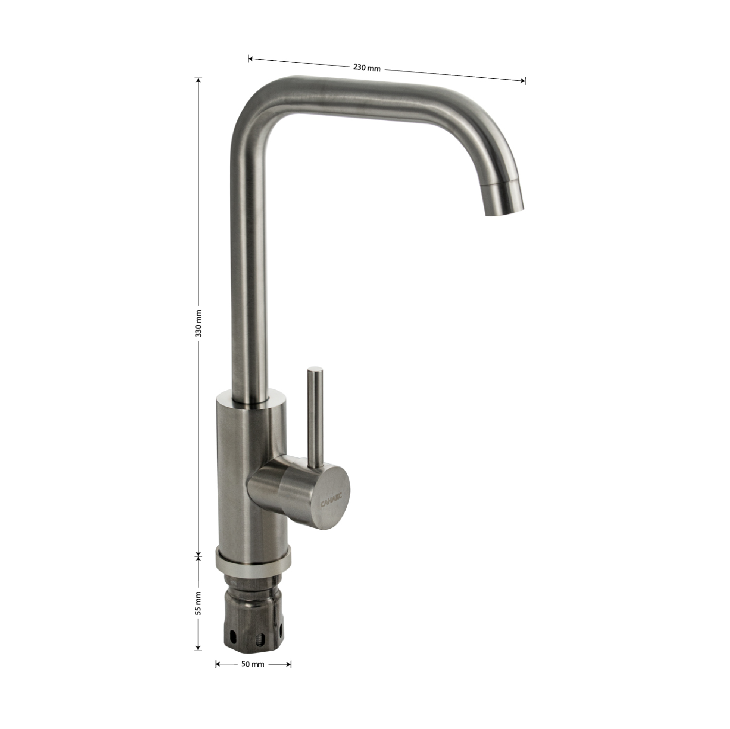 Смеситель для кухонной мойки и раковин, литой матовый корпус, из нержавеющей стали марки 304, с высоким П-образным изливом, шаровый, Крепление резьба - гайка, картридж d = 25 мм, ручка литая. Аэратор для экономии воды. Такая модель может использоваться на домашней кухне, на даче, в медицинских учреждениях и общественных местах. Габаритные размеры: высота 330 мм, длина 230 мм, диаметр посадочного седла 50 мм, длина резьбы 55 мм, длина подводки 500 мм. Вес - 1 кг, объём - 0.00516 м3. В комплекте паспорт, корпус с изливом, подводка 1/2, крепеж, набор прокладок.