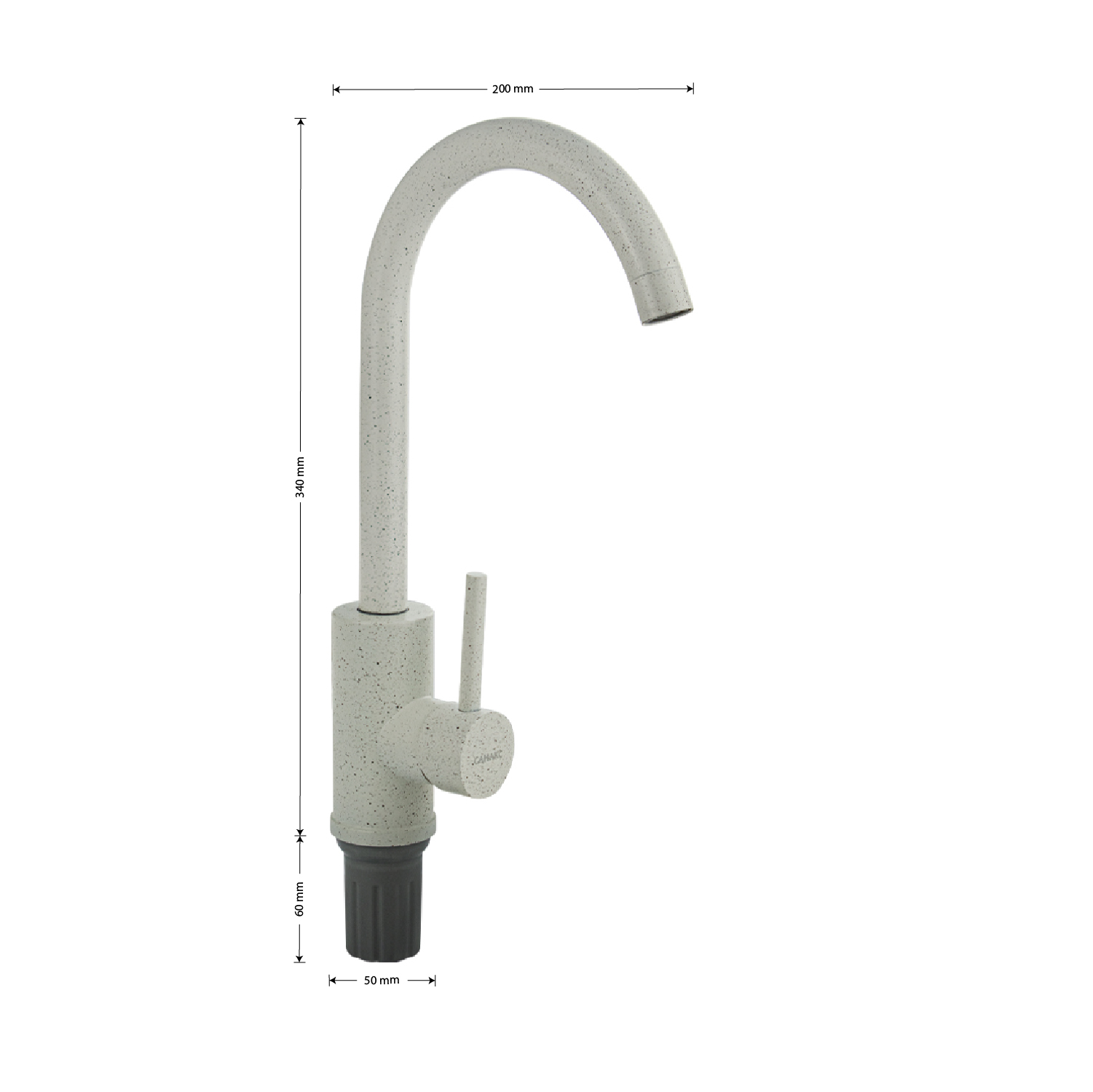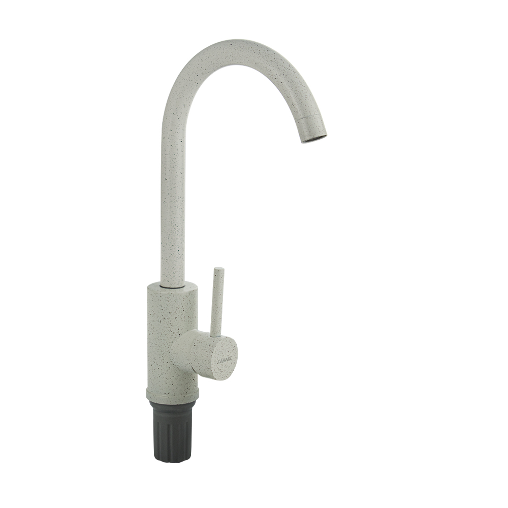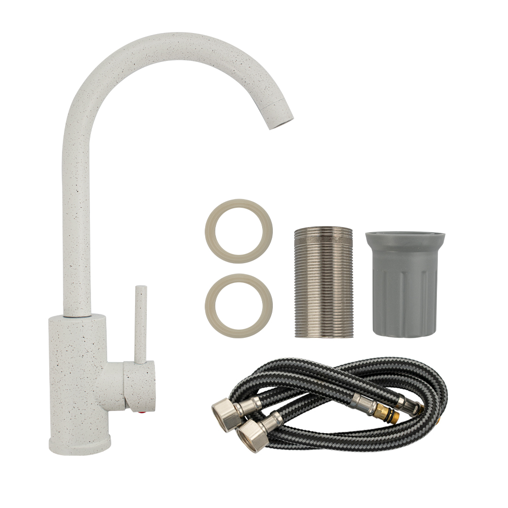Смеситель для кухонной мойки и раковин, литой матовый корпус, из нержавеющей стали и аллюминия, с высоким С-образным изливом, шаровый. Цвет белая эмаль с вкраплениями. Крепление резьба - гайка, картридж d = мм, ручка литая. Аэратор для экономии воды. Такая модель может использоваться на домашней кухне, на даче, в медицинских учреждениях и общественных местах. Габаритные размеры: высота 340 мм, длина 200 мм, диаметр посадочного седла 50 мм, длина резьбы 60 мм, длина подводки 430 мм. Вес - 0,98 кг, объём - 0,00528 м3. В комплекте паспорт, корпус с изливом, подводка 1/2, крепеж, набор прокладок.