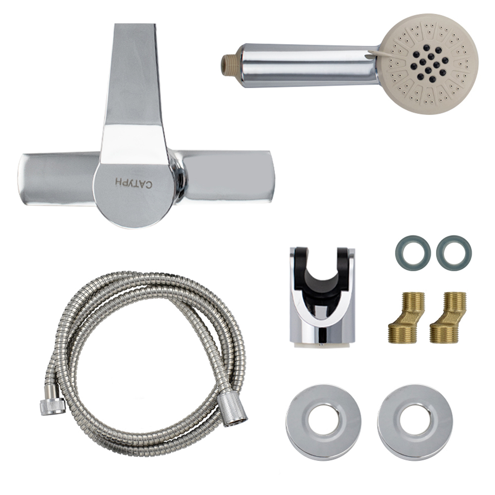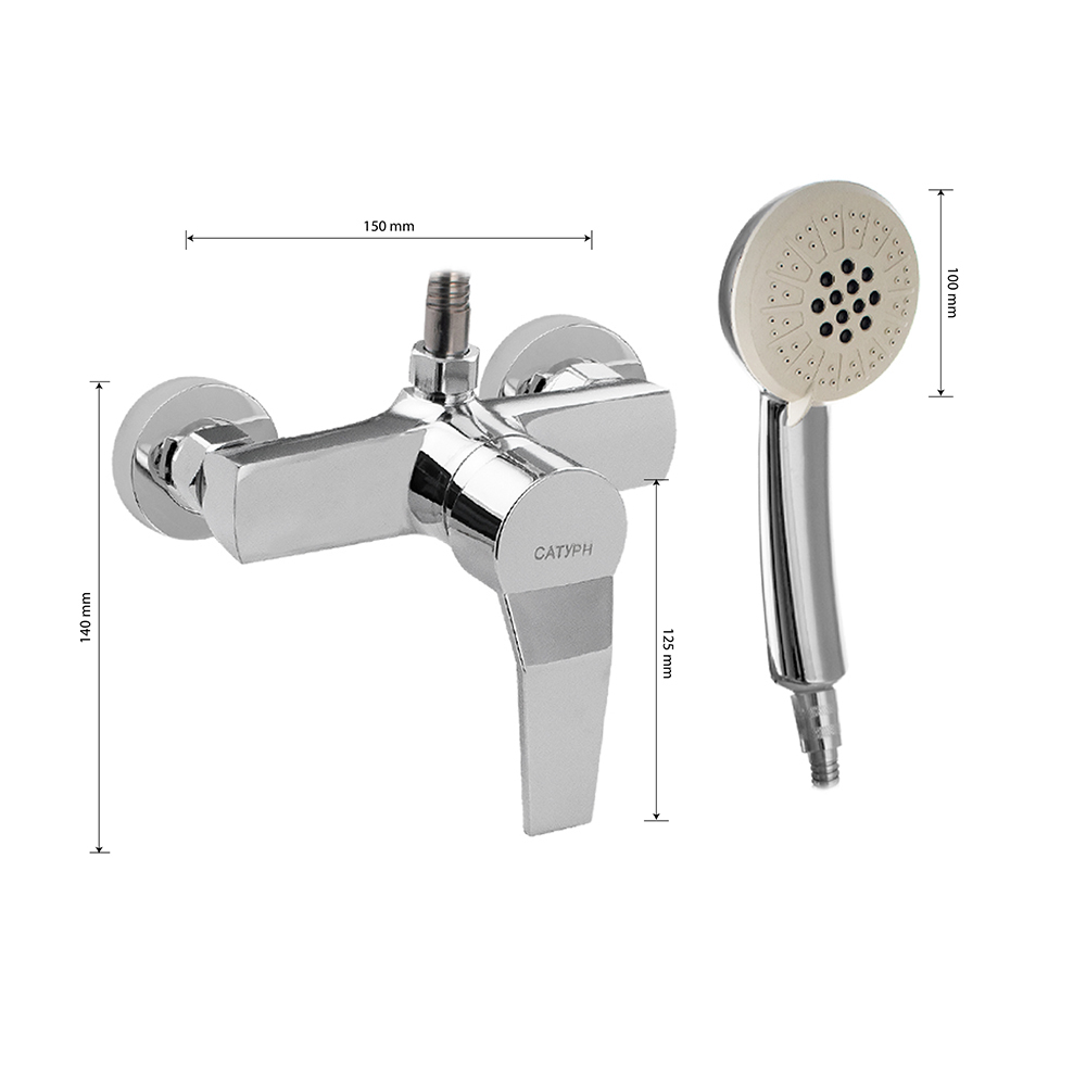 Смеситель хромированный в ванную / душевую комнату без излива, литой корпус, шаровый. Материал изготовления — ЦАМ (цинк-алюминий-медь). Картридж d = 40 мм, литая ручка, чашки и эксцентрики. Габаритные размеры: ширина 150 мм, высота корпуса 140 мм, двухрежимная душевая лейка d = 100 мм, шланг 150 см. Вес - 1,400 кг, объём - 0,00600 м3. В комплекте паспорт, корпус, душевая лейка, шланг, кронштейн, комплект крепежа и прокладок.