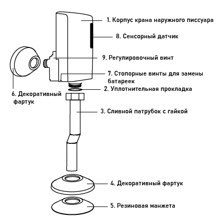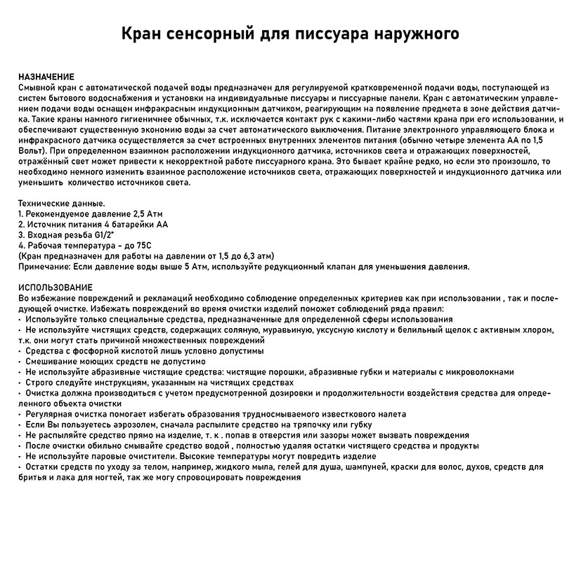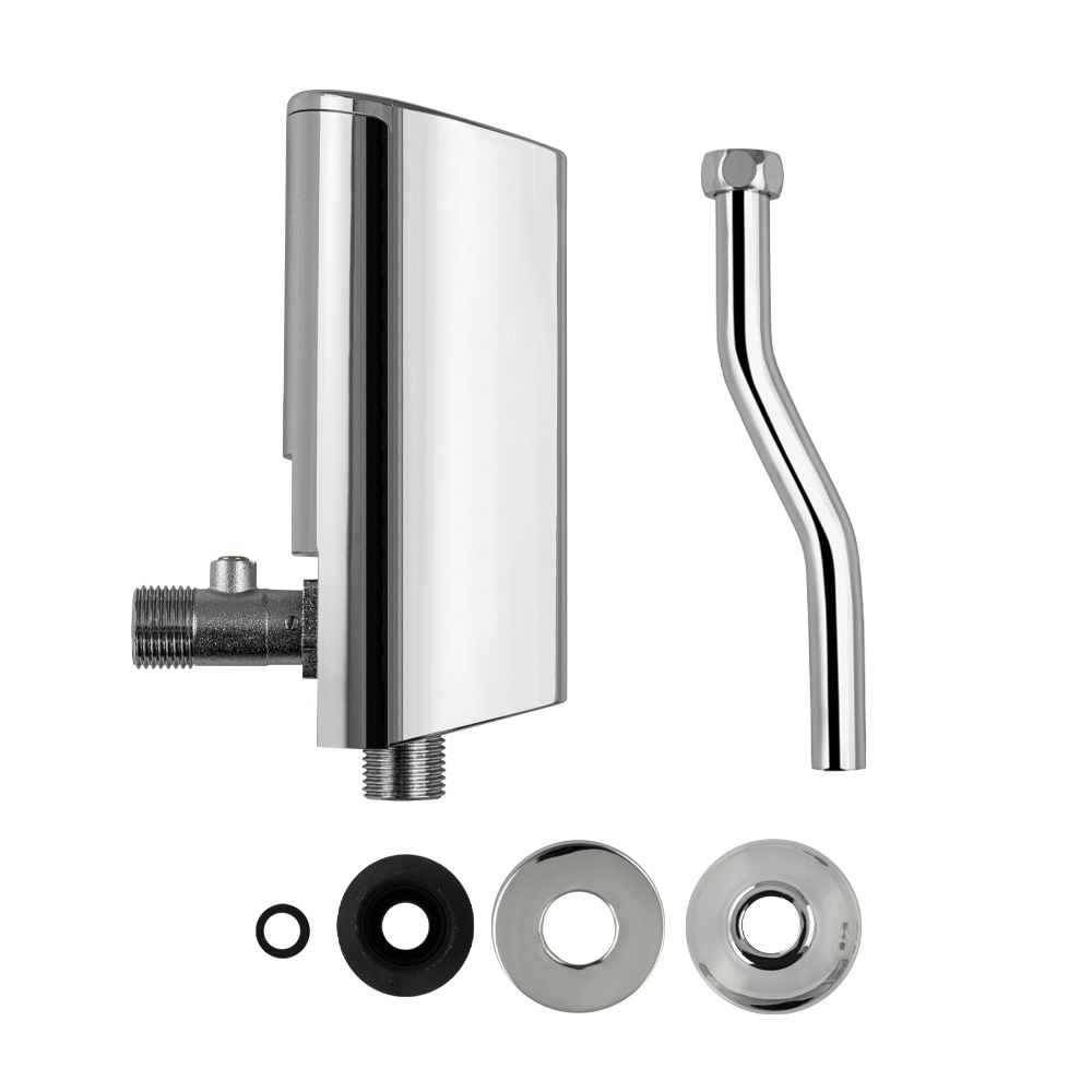 Кран для писсуара, сенсорный, с подключением на 1/2, корпус из высокопрочного АБС пластика. Смывное устройство подходит для писсуаров с внешним подводом воды. Модель с сенсорным включением практична в эксплуатации. Сенсор срабатывает плавно и мягко. Качественное хромированное покрытие гигиенично, за ним легко ухаживать, и оно не теряет блеска при длительном использовании. Благодаря стильному дизайну смывное устройство создаст идеальный комплект с писсуаром. Высота в сборе 365 мм, диаметр посадочного седла 55 мм, ширина 70 мм. Вес - 0,700 кг, объём - 0,00380 м3. В комплекте корпус, соединительная трубка, комплект прокладок, крепёж
