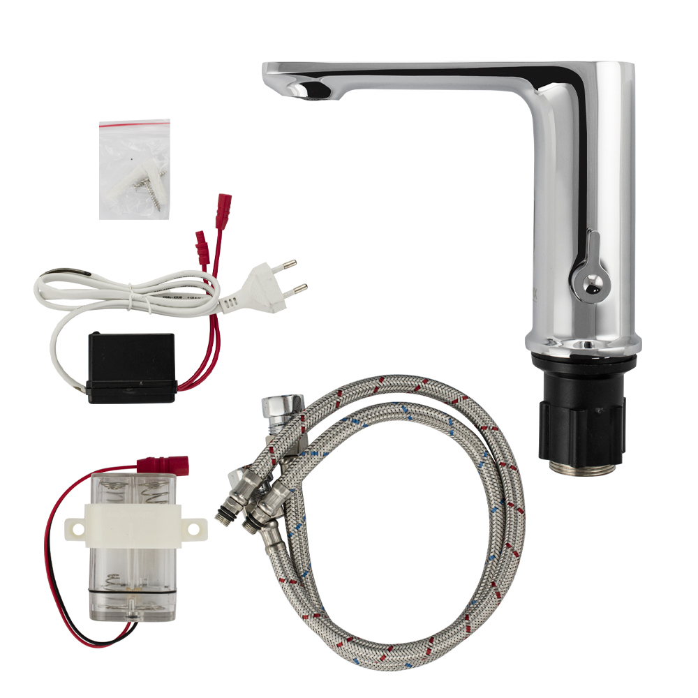 Сенсорный смеситель на раковину с регулировкой температуры воды на корпусе, предназначен для монтажа в жилых домах и общественных помещениях. Изделие выполнено в стиле хай-тек из высококачественного материала с хромовым покрытием, обеспечивающим устойчивость к механическим воздействиям. Кран смешивания горячей и холодной воды с возможностью регулировки размещается на корпусе. Кран включится, если поднести руки к изливу. Бесконтактный принцип работы гарантирует гигиеничность устройства. Устройство снабжено аэратором, позволяющей очистку без использования дополнительных средств. Он насыщает воду воздухом для создания струи, комфортной для гигиенических процедур, и сокращения расхода ценного ресурса. Сенсорный смеситель включает поток воды за счет фотоэлемента. Универсальное питание DC 6V (4 батареи типа "АА", в комплектацию не входят), AC/DC 6V AC 220V (50/60Hz). Габаритные размеры - диаметр посадочного седла 55 мм, высота 135 мм, длина излива 175 мм. Вес - 1,900 кг, объём - 0,0060 м3. В комплекте паспорт, кор