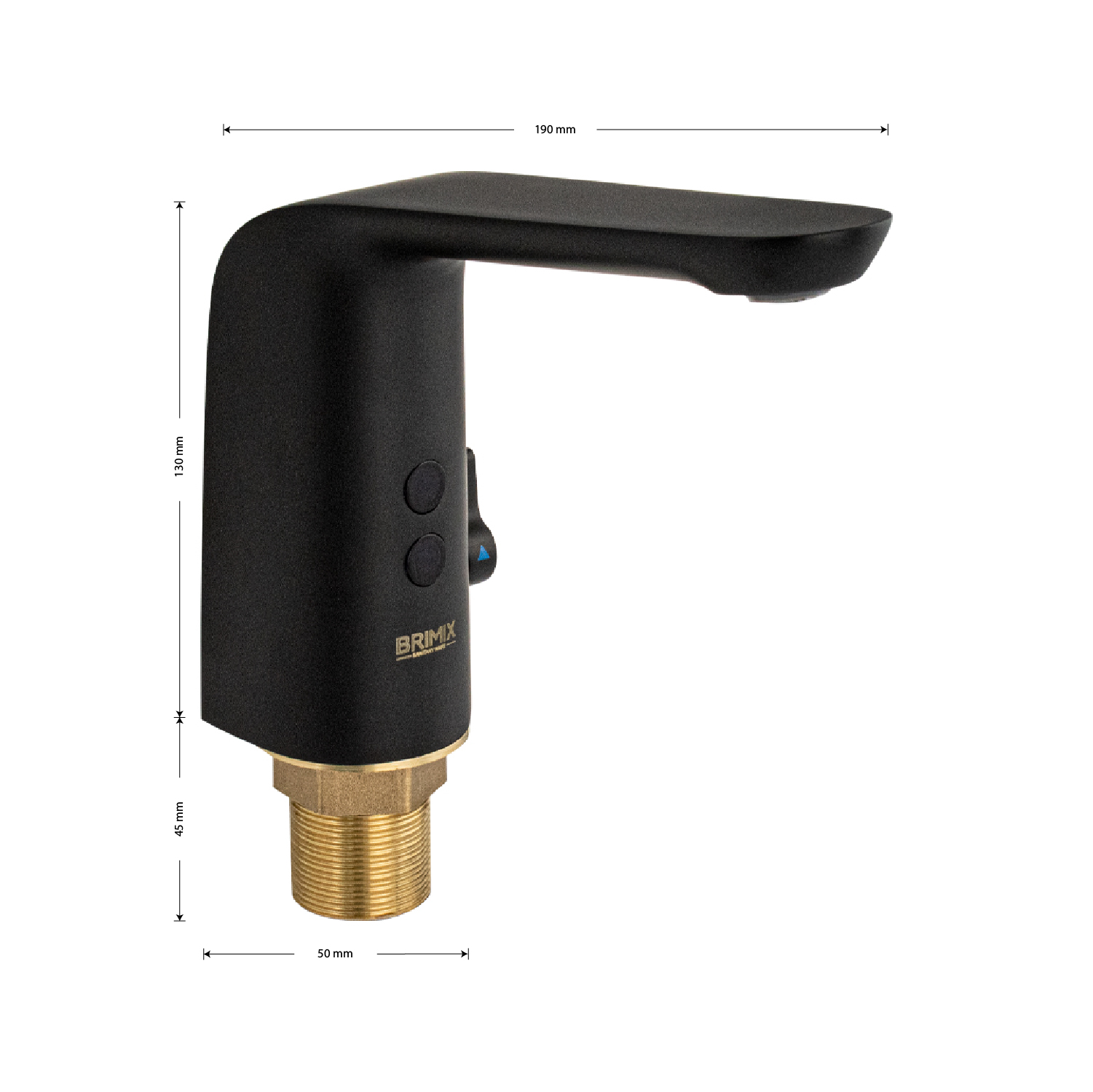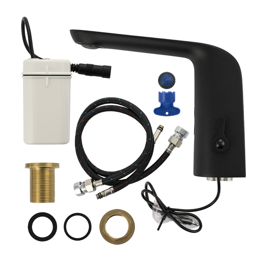 Смеситель сенсорный для раковины, цвет чёрный, с регулировкой температуры воды на корпусе. Изготовлен из высококачественной латуни. Предназначен для монтажа в жилых домах и общественных помещениях.. Кран смешивания горячей и холодной воды с возможностью регулировки размещается на корпусе. Бесконтактный принцип работы гарантирует гигиеничность устройства. Устройство снабжено аэратором, позволяющей очистку без использования дополнительных средств. Он насыщает воду воздухом для создания струи, комфортной для гигиенических процедур, и сокращения расхода ценного ресурса. Сенсорный смеситель включает поток воды за счет фотоэлемента. Универсальное питание DC 6V (4 батареи типа "АА", в комплектацию не входят), AC/DC 6V AC 220V (50/60Hz). Габаритные размеры: диаметр посадочного седла 50 мм, высота 130 мм, длина излива 190 мм. Вес - 1,900 кг, объём - 0,00700 м3. В комплекте: паспорт изделия, корпус, нижняя часть с программным управлением, монтажный комплект.
