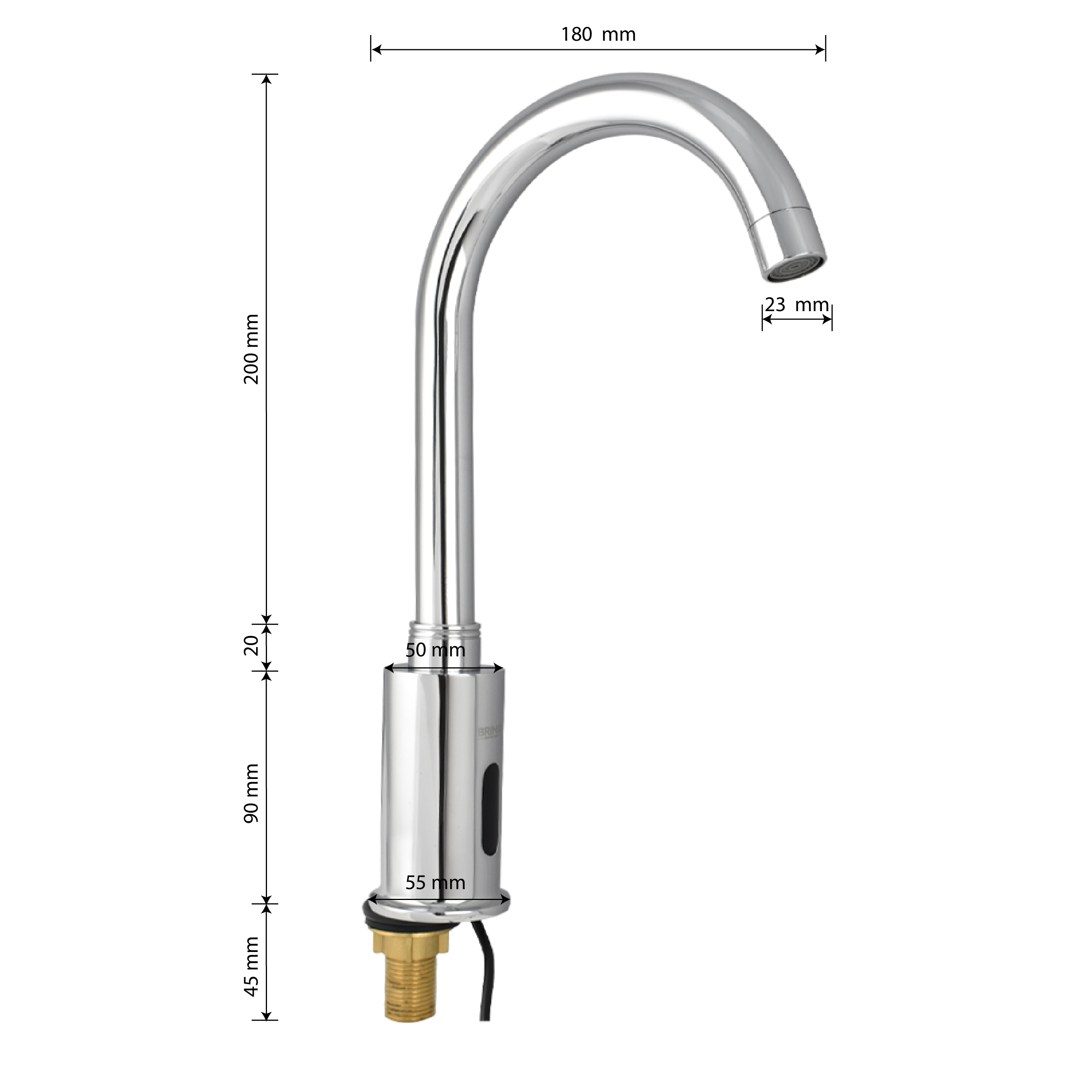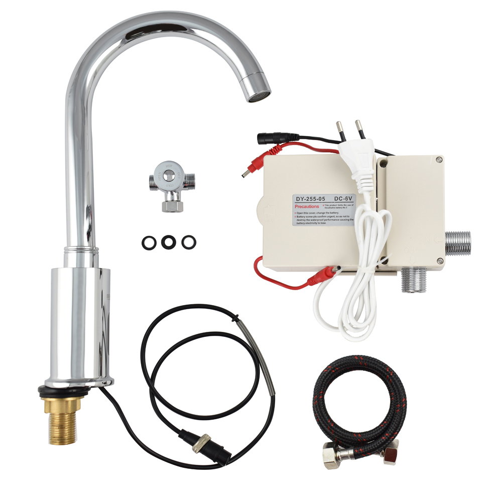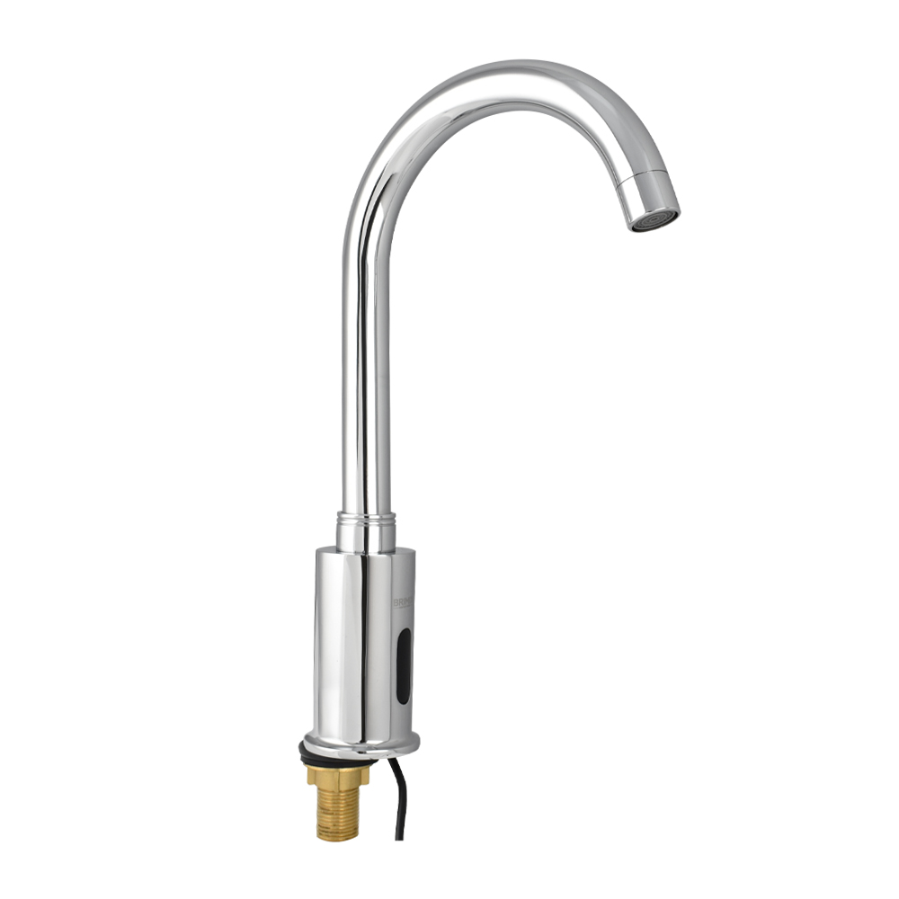 Сенсорный смеситель на раковину и мойку, высокий С-образный излив предназначен для монтажа в жилых домах и общественных помещениях. Изделие выполнено в стиле хай-тек из высококачественного материала с хромовым покрытием, обеспечивающим устойчивость к механическим воздействиям. Кран смешивания горячей и холодной воды с возможностью регулировки размещается под столешницей. Кран включится, если поднести руки к изливу. Бесконтактный принцип работы гарантирует гигиеничность устройства. Устройство снабжено аэратором, позволяющей очистку без использования дополнительных средств. Он насыщает воду воздухом для создания струи, комфортной для гигиенических процедур, и сокращения расхода ценного ресурса. Сенсорный смеситель включает поток воды за счет фотоэлемента. Универсальное питание DC 6V (4 батареи типа "АА", в комплектацию не входят), AC/DC 6V AC 220V (50/60Hz). Габаритные размеры: диаметр посадочного седла 55 мм, высота 310 мм, длина излива 180 мм. Вес - 1,800 кг, объём - 0,01134 м3. В комплекте паспорт, корпус,