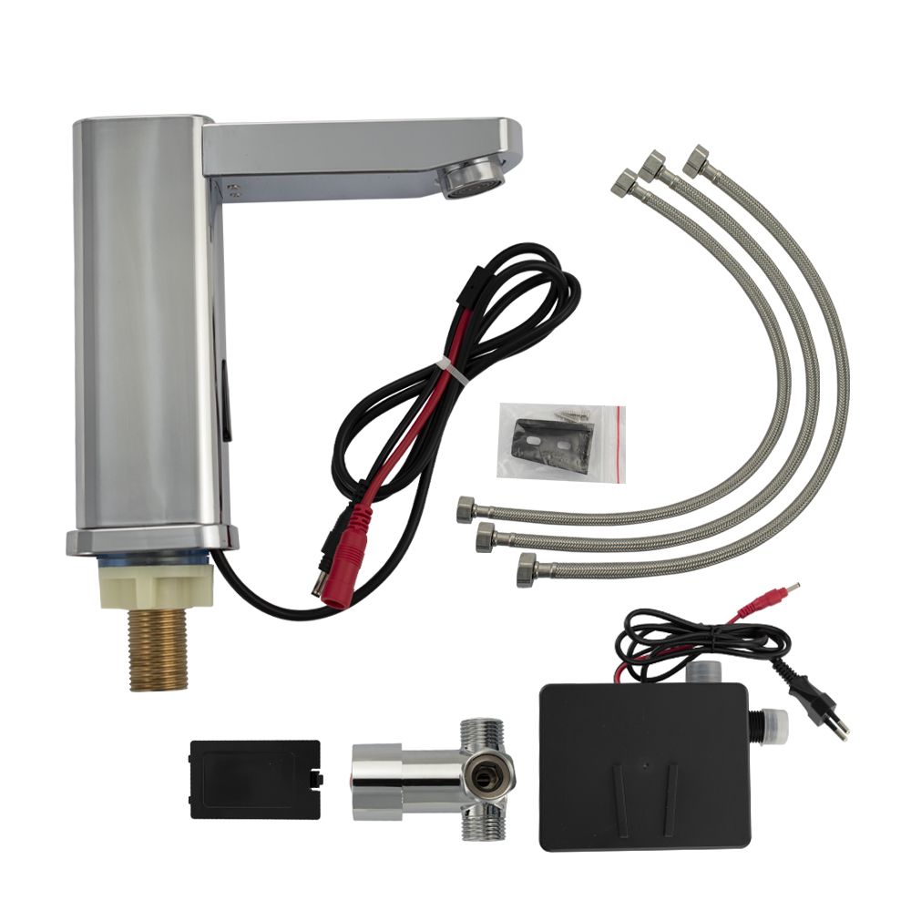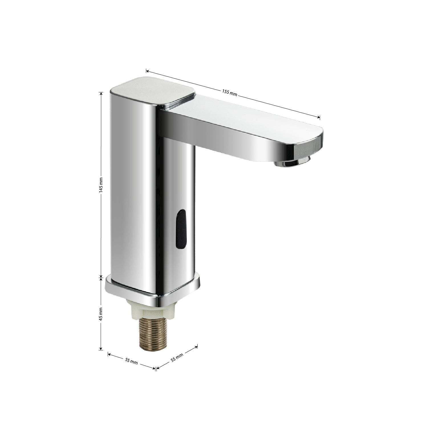 Сенсорный смеситель предназначен для монтажа в жилых домах и общественных помещениях. Изделие выполнено в стиле хай-тек из высококачественного материала, пластик АБС с хромированным покрытием, обеспечивающим устойчивость к механическим воздействиям. Кран смешивания горячей и холодной воды с возможностью регулировки размещается под столешницей. Кран включится, если поднести руки к изливу. Устройство снабжено аэратором, позволяющей очистку без использования дополнительных средств. Он насыщает воду воздухом для создания струи, комфортной для гигиенических процедур, и сокращения расхода ценного ресурса. Сенсорный смеситель включает поток воды за счет фотоэлемента. Универсальное питание DC 6V (4 батареи типа "АА", в комплектацию не входят), AC/DC 6V AC 220V (50/60Hz). Габаритные размеры: высота 145 мм, длина 155 мм, основание 55*55 мм, длина резьбы 45 мм. Вес - 1.52 кг, объём - 0.00638 м3. В комплекте паспорт, корпус, нижняя часть с программным управлением, крепёж.