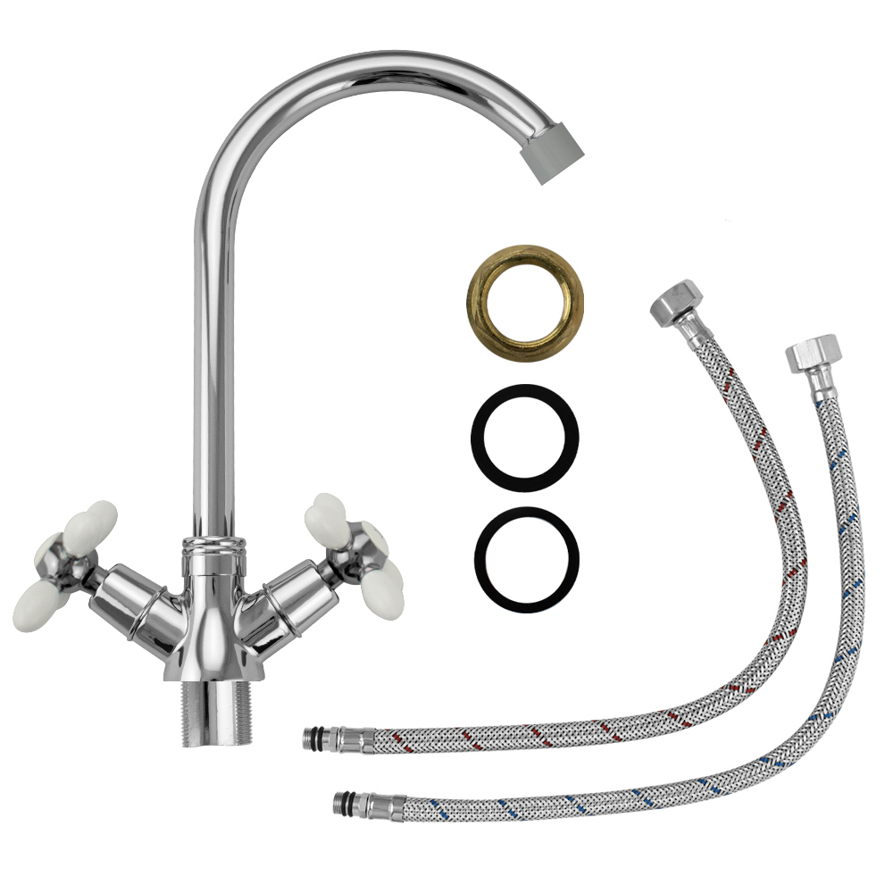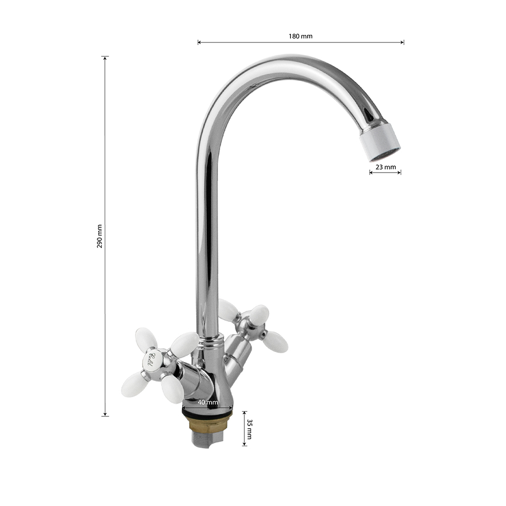 Смеситель для кухонной мойки и раковин, массивный корпус, хромированный, с высоким С-образным изливом. Материал изготовления — ЦАМ (цинк-алюминий-медь) + нержавеющая сталь. Крепление резьба - гайка. Аэратор для экономии воды. Кранбукса м/к 1/2, ручка крест, белые вставки на ручках и аэраторе, поворот на 90˚. Габаритные размеры: высота 290 мм, длина 180 мм, диаметр посадочного седла 40 мм, длина резьбы 35 мм, длина подводки 350 мм. Вес - 0,900 кг, объём - 0,00416 м3. В комплекте паспорт, корпус с изливом, подводка 1/2, крепеж, набор прокладок.