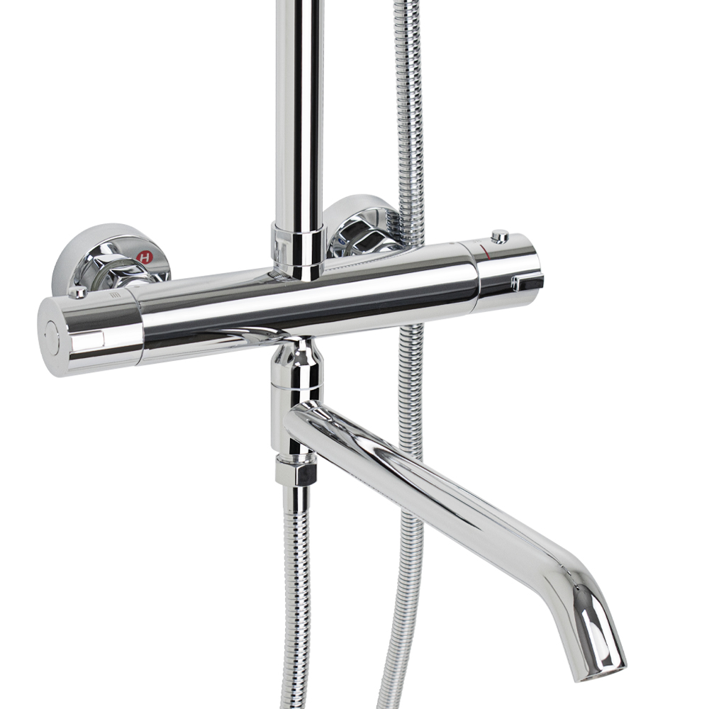 Смеситель с длинным изливом термостатический + стойка душевая телескопическая "тропический душ" – надежное сантехническое оборудование. Латунный, хромированный корпус с круглым коротким изливом, поворот которого является переключением подачи воды. Температура и напор воды устанавливаются поворотом двух удобных рукояток. Термостат поддерживает заданную температуру воды и может работать в системах низкого давления с газовыми проточными водонагревателями. Ограничитель температуры до 38 градусов спасает от возможного ожога при случайном повороте рукоятки. Встроенный аэратор формирует комфортный и приятный поток воды. Сеточка легко снимается для удаления налета. Аксессуар оснащен термостатическим картриджем с шумоподавлением и керамической кран-буксой, стойка с двумя квадратными хромированными лейками и шланг хромированный. Габаритные размеры: высота стойки 800-1200 мм, длина излива стойки 330 мм, лейка для душа 105*240 мм двухрежимная, лейка тропического душа 220*220 мм, длина гусака 300 мм, шланг 150 см. Вес -