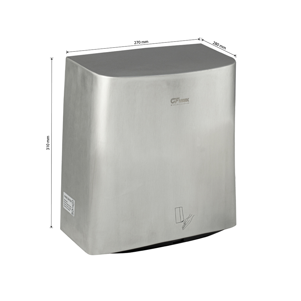 Электрическая сушилка для рук скоростная, ПРЕМИУМ, c направленным потоком воздуха из двух плоских сопел, расположенных под углом друг к другу, матовая, из нержавеющей стали, антивандальная, незаменима в местах с большой проходимостью людей (бизнес-центры, торговые центры, гостиницы, кинотеатры, рестораны). Корпус сушилки изготовлен из нержавеющей стали матового цвета, который выдерживает различные механические воздействия. Прибор отличается высокой мощностью и большой скоростью, что позволит использовать оборудование в различных помещениях с высоким электропотреблением. Для удобства эксплуатации в сушилке для рук предусмотрен инфракрасный датчик движения, который включает прибор без прикосновения к нему, при поднесении рук. Сушилка оснащена надёжным и долговечным двигателем. Прибор облачён в ударопрочный корпус. Параметры - 2000W, автоматическая, АС 220-230В 50/60Гц, сенсор включения 50 - 150 мм, скорость потока >15 м/c, температура воздуха >50°C, время сушки 10 - 12 секунд влагозащищенность IPX1 с фильтром