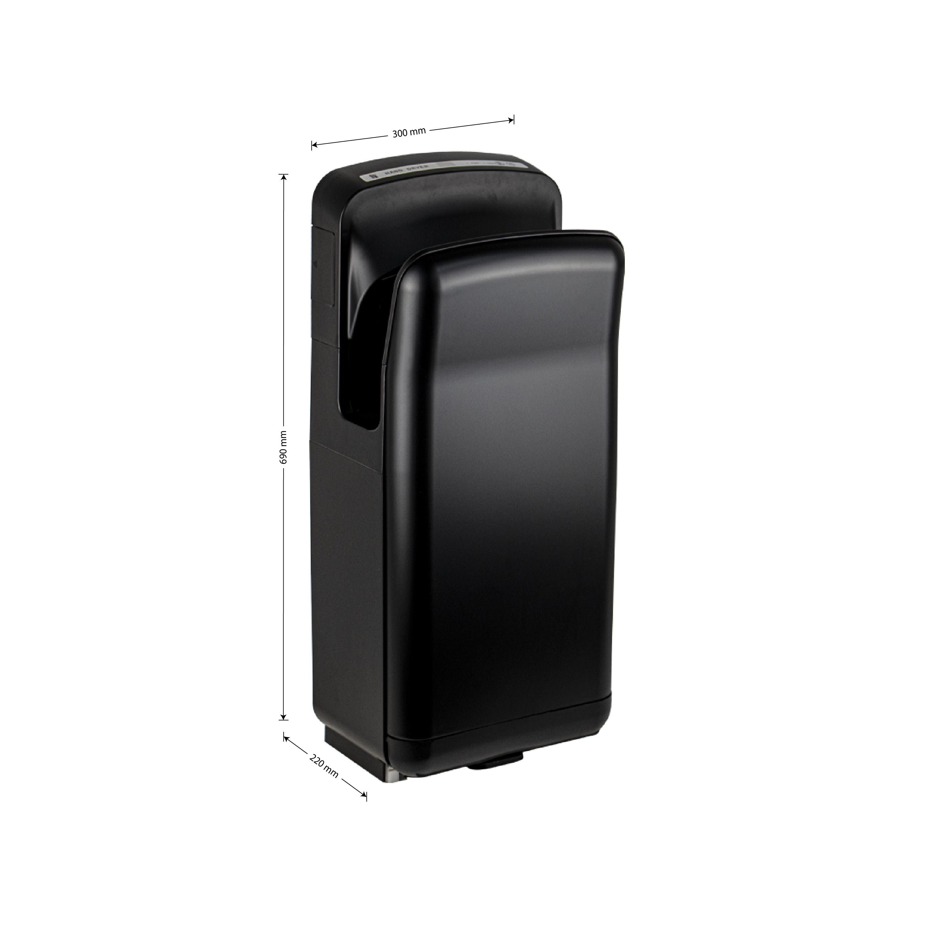 Сушилка для рук погружная, высокоскоростная, бизнес класса, корпус пластик АБС, цвет чёрный, с неоновой подсветкой. Питание-220 В / 50 Гц. Номинальная мощность - 2000 Вт. Класс водонепроницаемости - IPX4. Время сушки-7 сек. Габаритные размеры: высота 690 мм, ширина 300 мм, глубина 220 мм. Вес - 8.96 кг, объем - 0,07 м3. В комплекте сушилка, паспорт, крепёж.