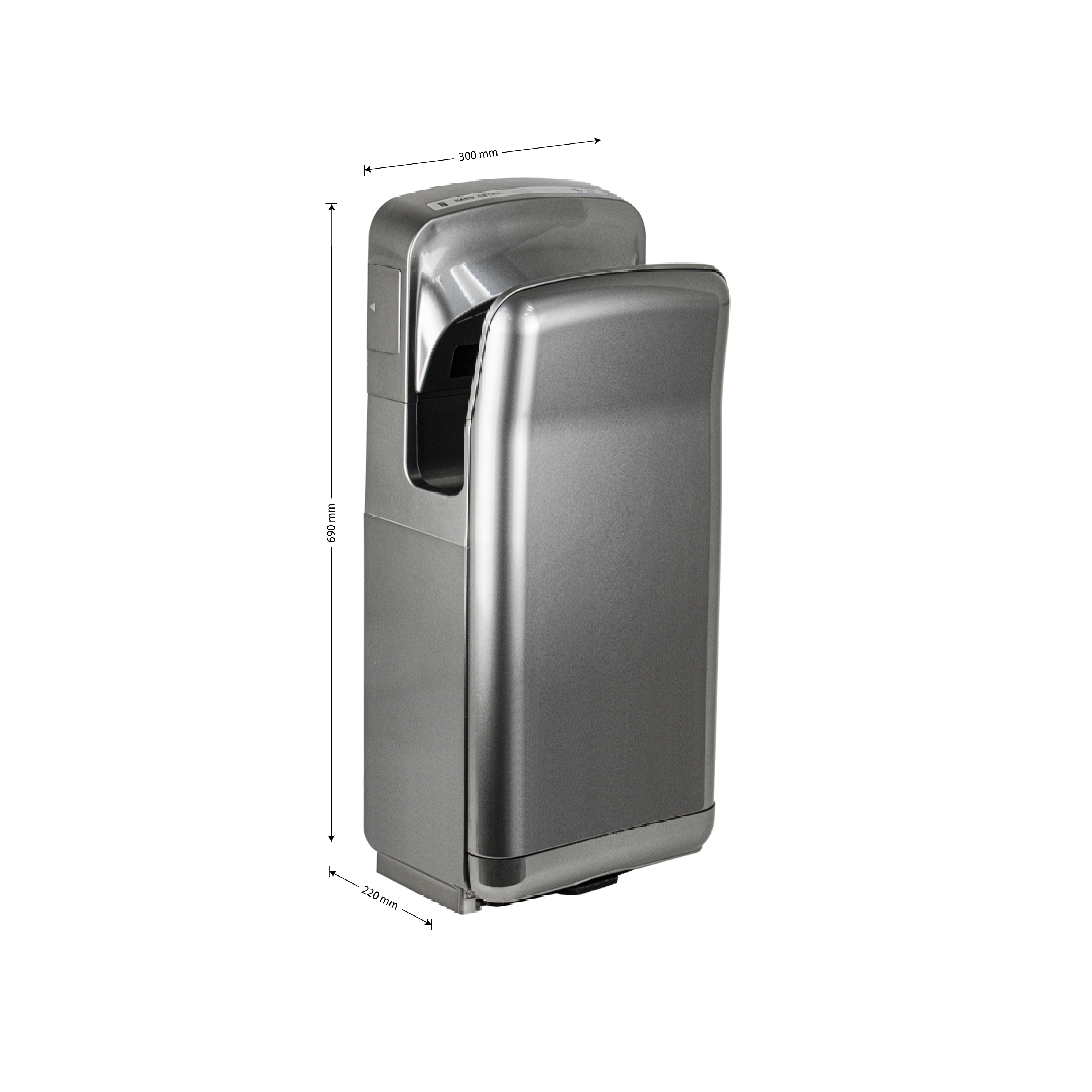 Сушилка для рук погружная, высокоскоростная, бизнес класса, корпус пластик АБС, цвет серый, с неоновой подсветкой. Питание-220 В / 50 Гц. Номинальная мощность - 2000 Вт. Класс водонепроницаемости - IPX4. Время сушки-7 сек. Габаритные размеры: высота 690 мм, ширина 300 мм, глубина 220 мм. Вес - 8.96 кг, объем - 0,07 м3. В комплекте сушилка, паспорт, крепёж.