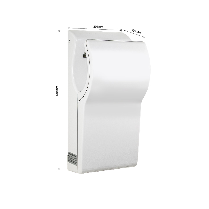 Сушилка для рук погружная, высокоскоростная, бизнесс класса, корпус пластик АБС, цвет белый, с неоновой подсветкой. Питание-220 В / 50 Гц. Номинальная мощность-1800 Вт. Класс водонепроницаемости - IPX1. Время сушки-7 сек. Габаритные размеры: высота 640 мм, ширина 300 мм, глубина 230 мм. Вес - 11,500 кг, объем - 0,09360 м3. В комплекте сушилка, паспорт, крепёж.