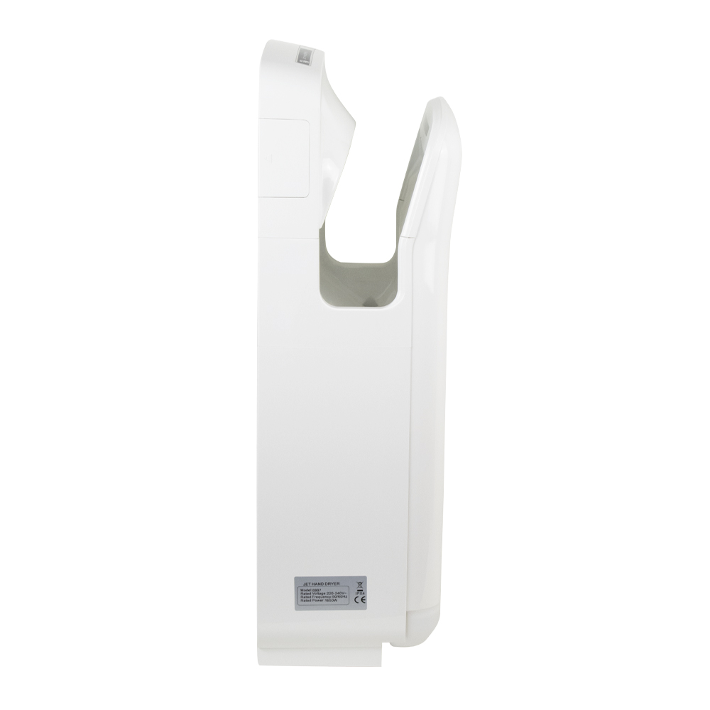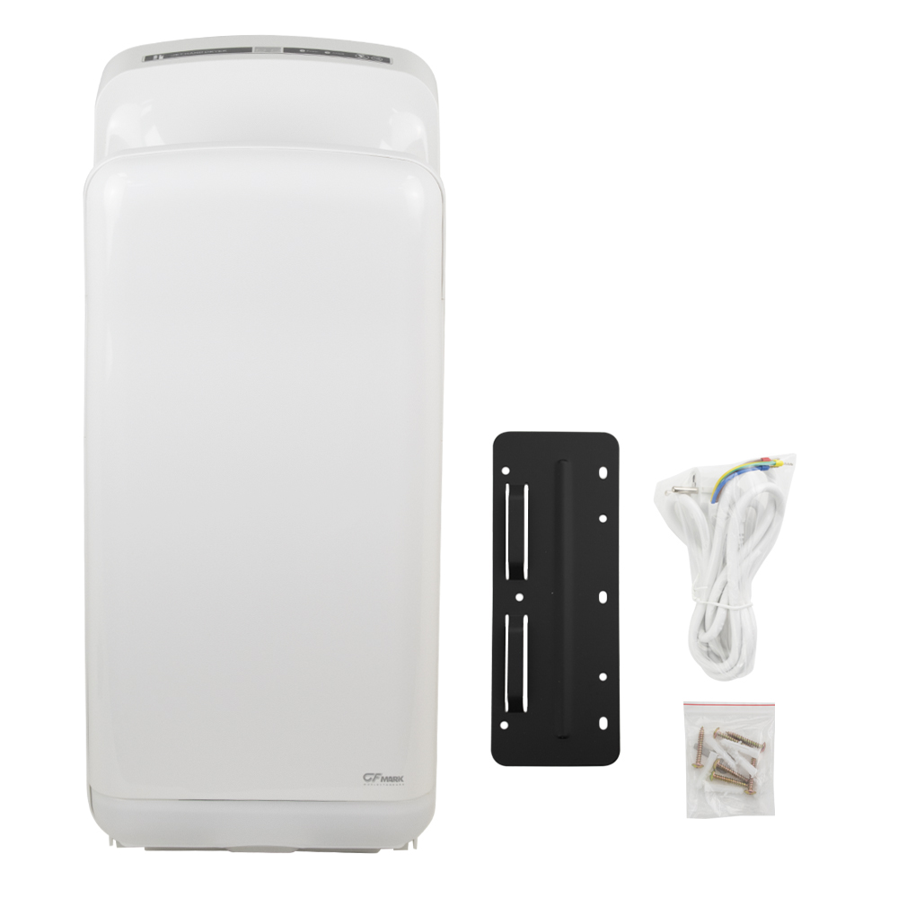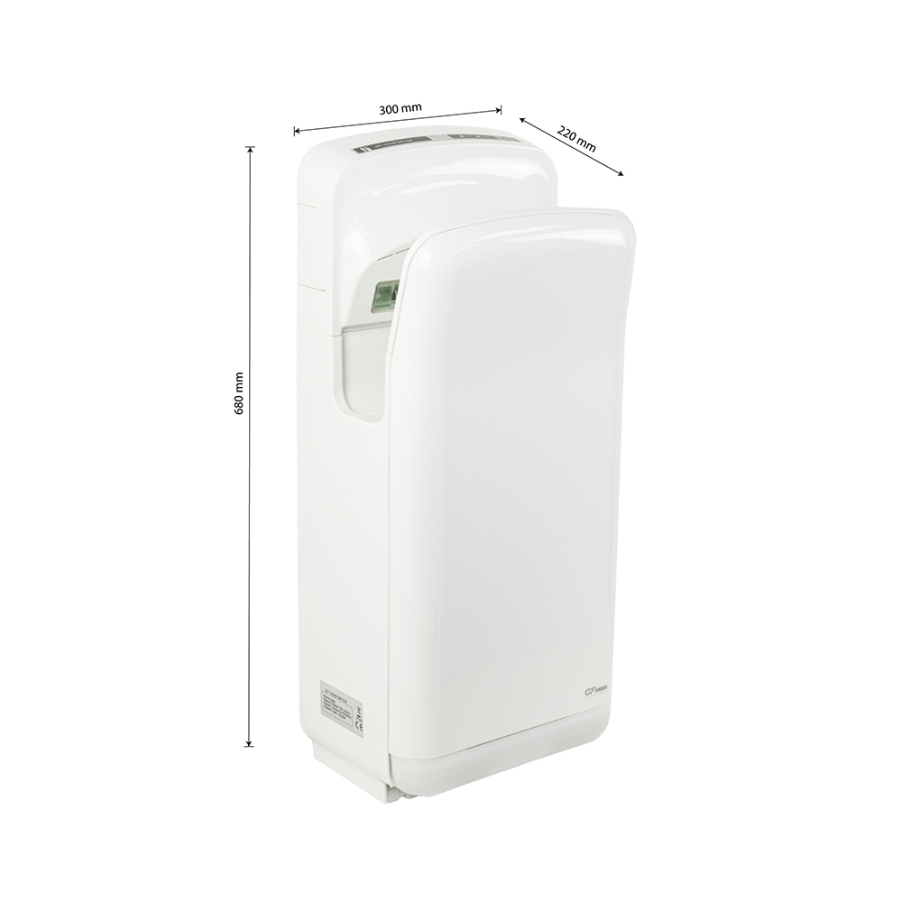 Сушилка для рук, скоростная, бизнес класса, цвет белый, погружная, пластик АБС, 1650 W, 220V, 50Hz, время сушки 5-7 секунд , обороты 24000 в минуту, защита IPX4, температура потока 65 +15-15 градусов С, из пластика АБС, воздушный фильтр и фильтр HEPA, щёточный мотор. Габаритные размеры: высота 680 мм, ширина 300 мм, глубина 220 мм. Вес - 9,5 кг, объем - 0,08500 м3