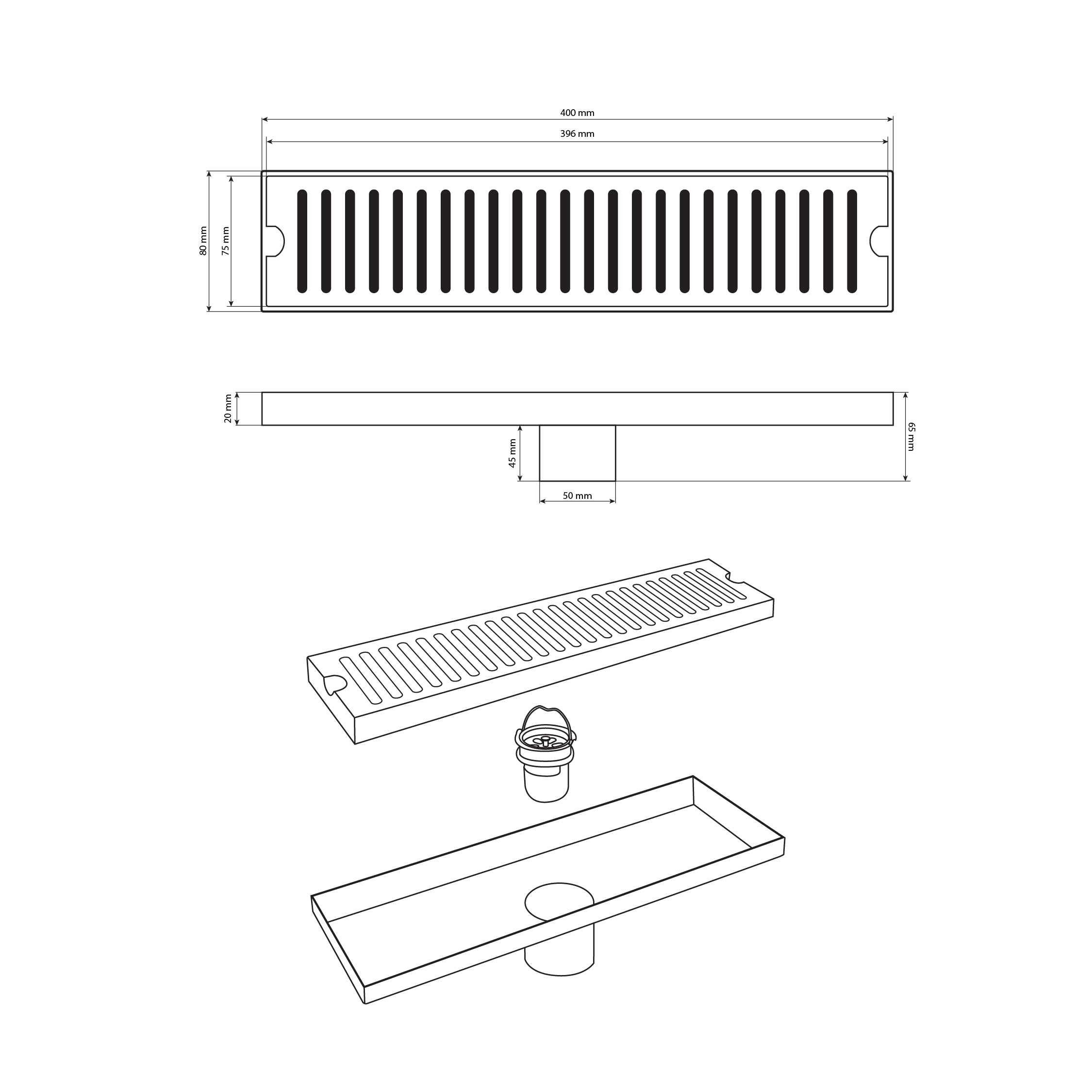 Душевой сливной трап из нержавеющей стали, матовый, линейный, вертикальный с гидрозатвором – это специальный элемент сантехнических коммуникаций, предназначенный для отвода воды в систему канализации. Как правило, душевые трапы устанавливаются непосредственно в пол. Благодаря небольшим габаритам и высоте душевые трапы идеальны для установки в душевых зонах. Это важно для организации пространства, где нет возможности установить классическую ванну: в малогабаритных квартирах, студиях, совмещенных санузлах и т.п. Габаритные размеры: высота 65 мм, ширина 80 мм, длина 400 мм, выход в канализацию 50 мм. Вес - кг, объём - м3.