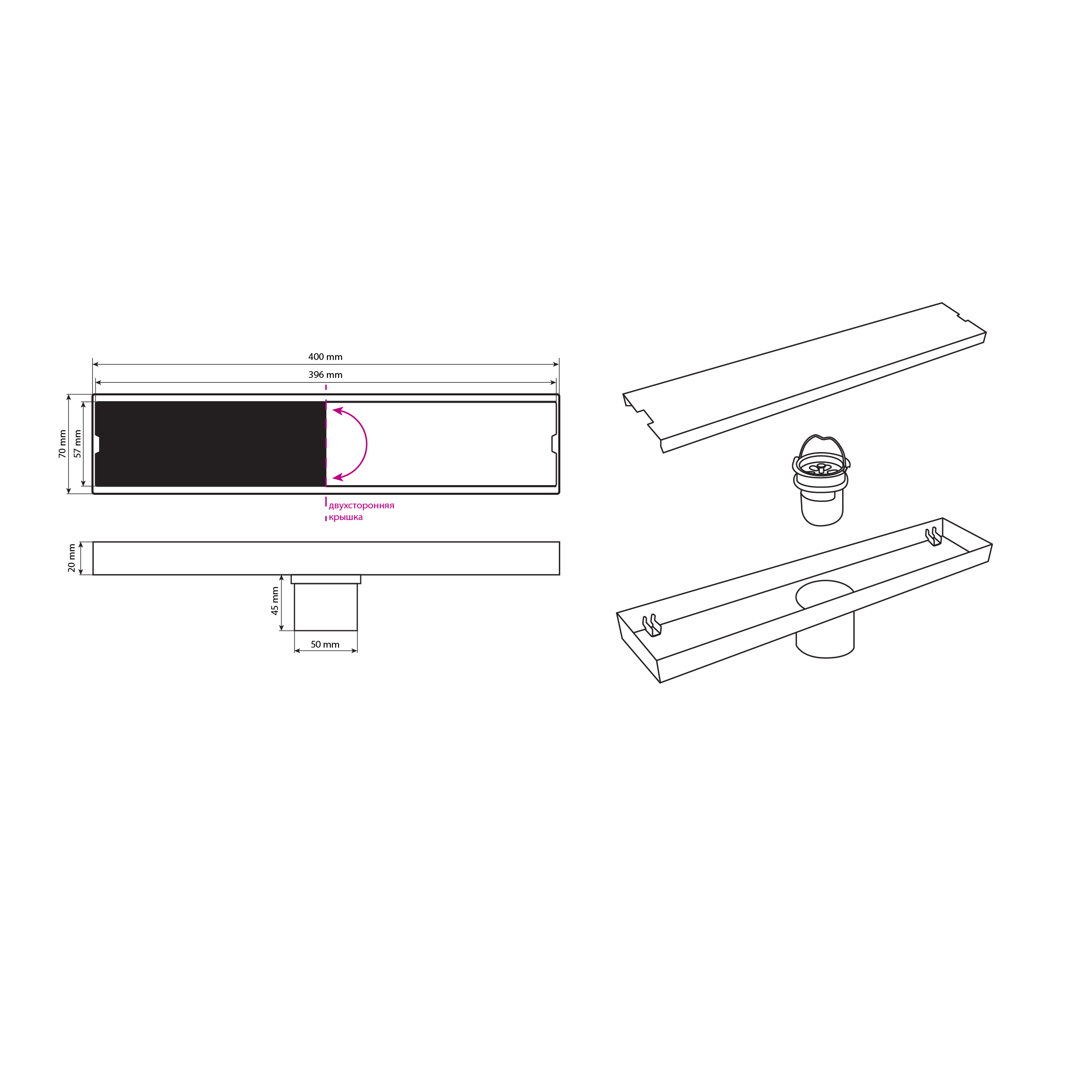 Душевой сливной трап из нержавеющей стали, линейный, вертикальный с гидрозатвором, крышка литая двухсторонняя, с возможностью вставки плитки– это специальный элемент сантехнических коммуникаций, предназначенный для отвода воды в систему канализации. Как правило, душевые трапы устанавливаются непосредственно в пол. Благодаря небольшим габаритам и высоте душевые трапы идеальны для установки в душевых зонах. Это важно для организации пространства, где нет возможности установить классическую ванну: в малогабаритных квартирах, студиях, совмещенных санузлах и т.п. Габаритные размеры: высота 70 мм, ширина 70 мм, длина 400 мм, выход в канализацию 50 мм. Вес - 1,000 кг, объём - 0,00250 м3.