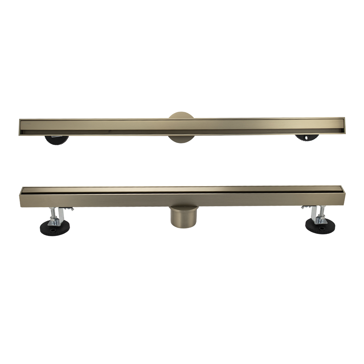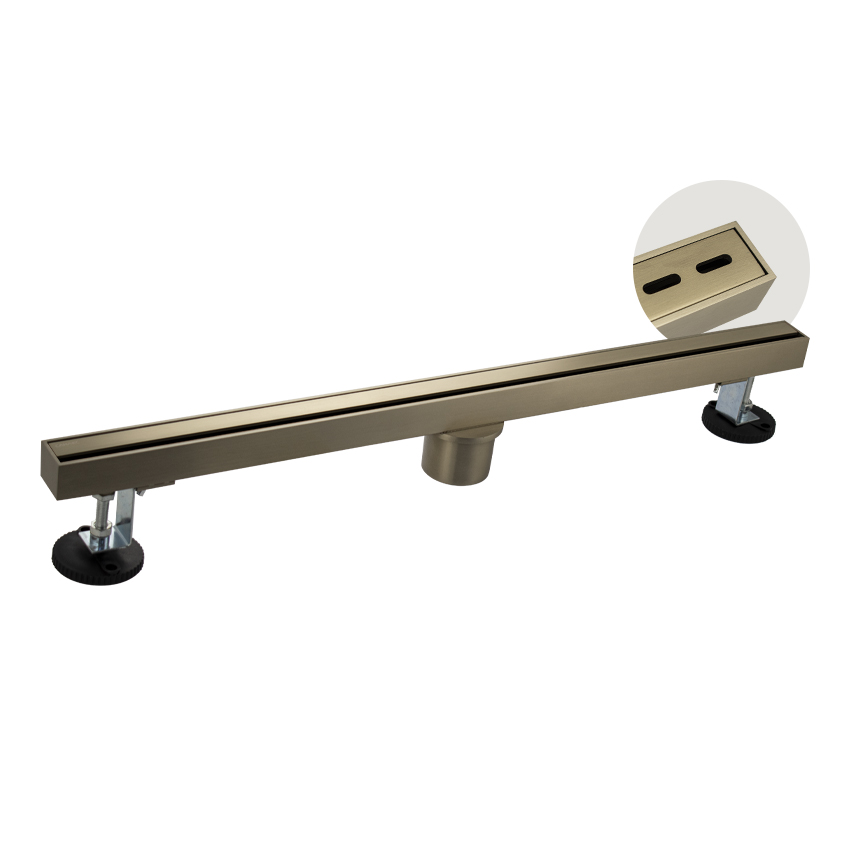 Душевой сливной трап из нержавеющей стали, линейный, вертикальный с сухим затвором, крышка двухсторонняя щелевая или с отверстиями по всей длине, цвет матовое золото. Это специальный элемент сантехнических коммуникаций, предназначенный для отвода воды в систему канализации. Как правило, душевые трапы устанавливаются непосредственно в пол. Благодаря небольшим габаритам и высоте душевые трапы идеальны для установки в душевых зонах. Это важно для организации пространства, где нет возможности установить классическую ванну: в малогабаритных квартирах, студиях, совмещенных санузлах и т.п. Габаритные размеры: ширина 32 мм, длина 600 мм, высота до 100 мм, выход в канализацию 50 мм. Вес - 2,4 кг, объём - 0,006 м3.
