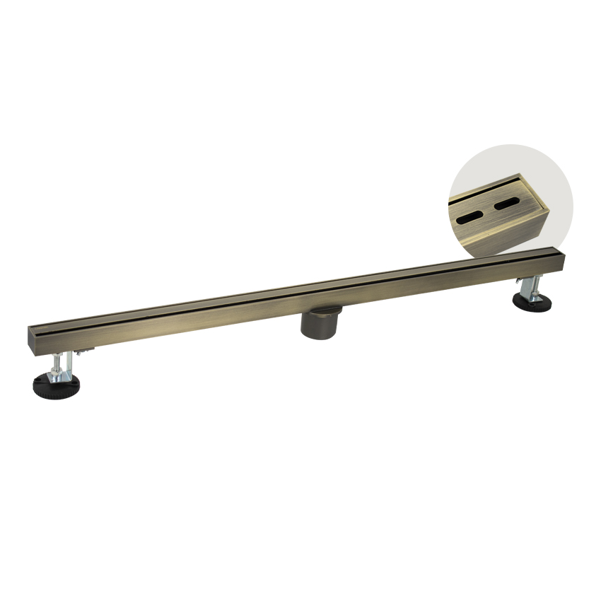 Душевой сливной трап из нержавеющей стали, линейный, вертикальный с сухим затвором, крышка двухсторонняя щелевая или с отверстиями по всей длине, цвет бронза. Это специальный элемент сантехнических коммуникаций, предназначенный для отвода воды в систему канализации. Как правило, душевые трапы устанавливаются непосредственно в пол. Благодаря небольшим габаритам и высоте душевые трапы идеальны для установки в душевых зонах. Это важно для организации пространства, где нет возможности установить классическую ванну: в малогабаритных квартирах, студиях, совмещенных санузлах и т.п. Габаритные размеры: ширина 32 мм, длина 800 мм, высота до 100 мм, выход в канализацию 50 мм. Вес - 3,1 кг, объём - 0,007 м3.