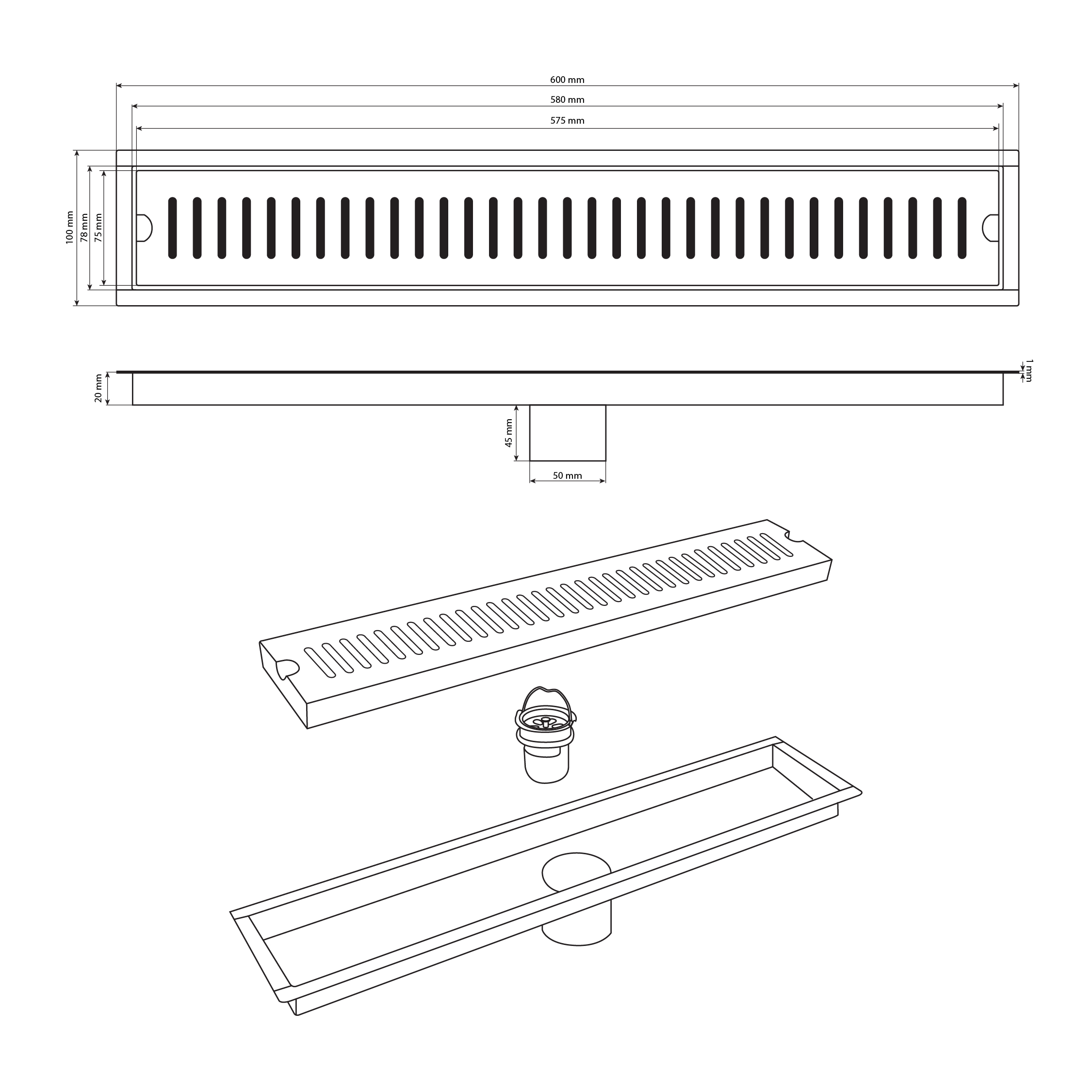 Душевой сливной трап из нержавеющей стали, линейный, вертикальный с гидрозатвором – это специальный элемент сантехнических коммуникаций, предназначенный для отвода воды в систему канализации. Как правило, душевые трапы устанавливаются непосредственно в пол. Благодаря небольшим габаритам и высоте душевые трапы идеальны для установки в душевых зонах. Это важно для организации пространства, где нет возможности установить классическую ванну: в малогабаритных квартирах, студиях, совмещенных санузлах и т.п. Габаритные размеры: высота 70 мм, ширина 100 мм, длина 600 мм, выход в канализацию 50 мм. Вес - 1,300 кг, объём - 0,00610 м3.