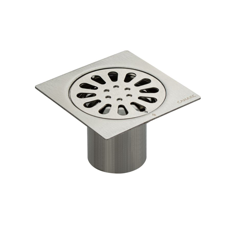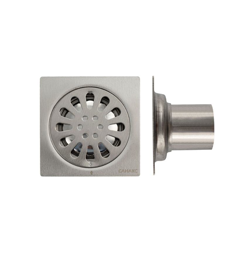 Трап 100 х 100 мм, выход 50 мм вертикальный, перфорированная крышка, из нержавеющей стали, с гидрозатвором, цвет САТИН.