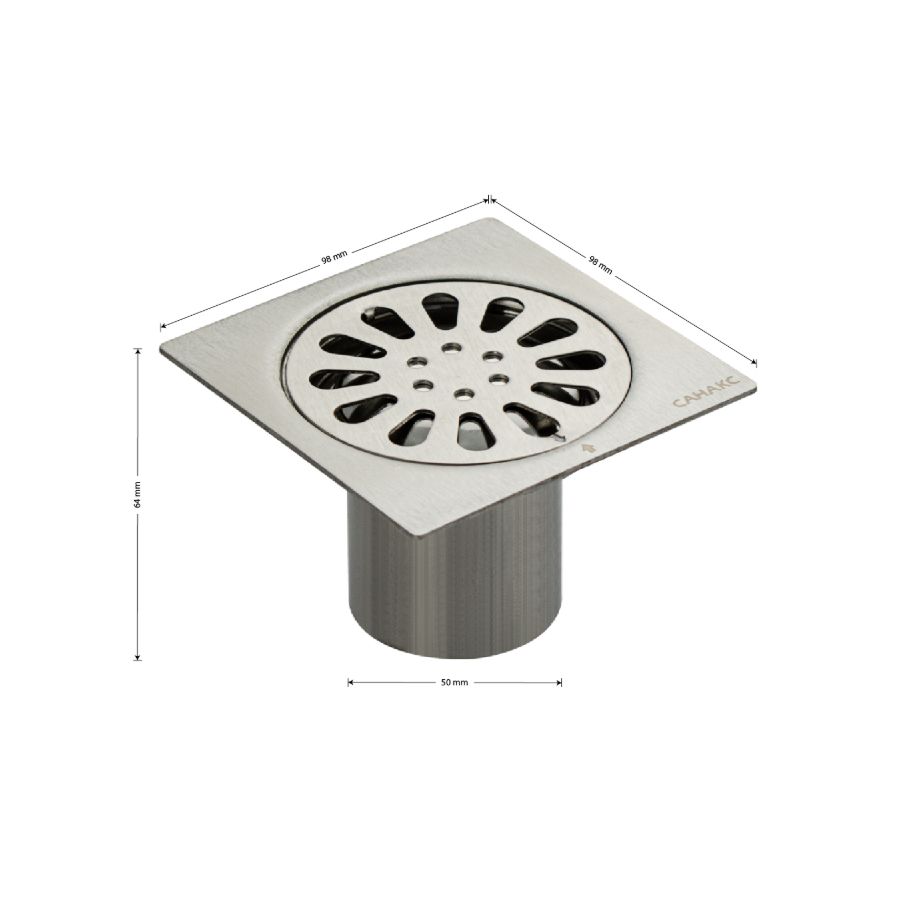 Душевой сливной трап из нержавеющей стали, вертикальный с гидрозатвором  – это специальный элемент сантехнических коммуникаций, предназначенный для отвода воды в систему канализации. Как правило, душевые трапы устанавливаются непосредственно в пол. Благодаря небольшим габаритам и высоте душевые трапы идеальны для установки в душевых зонах. Это важно для организации пространства, где нет возможности установить классическую ванну: в малогабаритных квартирах, студиях, совмещенных санузлах и т.п. Габаритные размеры: высота 64 мм, ширина 98 мм, длина 98 мм, выход в канализацию 50 мм. Вес - 0,25 кг, объём - 0,00112 м3.