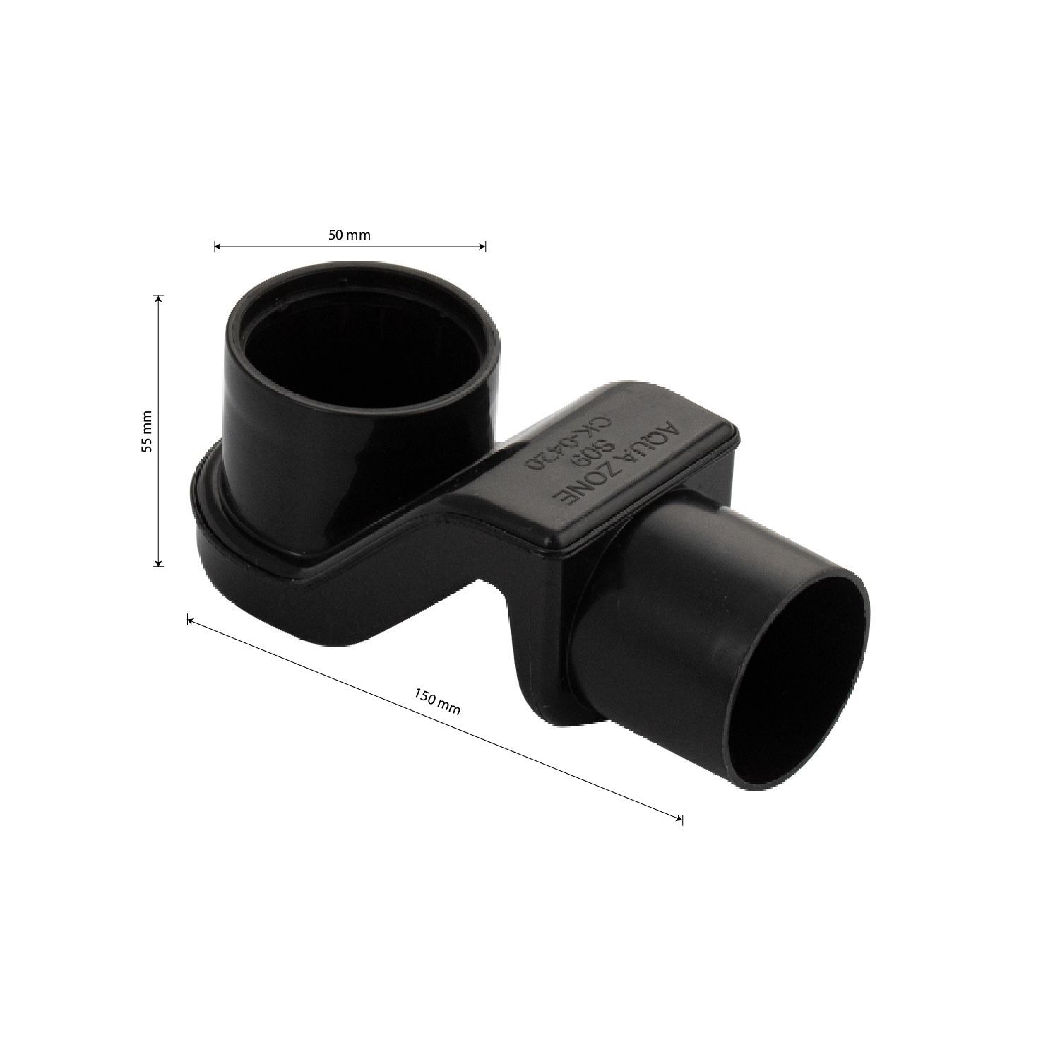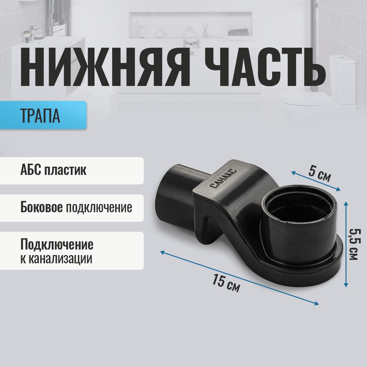 Нижняя часть трапа, пластиковая, для бокового подключения к канализации, с втулкой. Габаритные размеры: высота 55 мм, длина 150 мм, диаметр 50 мм. Вес - 0,060 кг, объем - 0,00060 м3.
