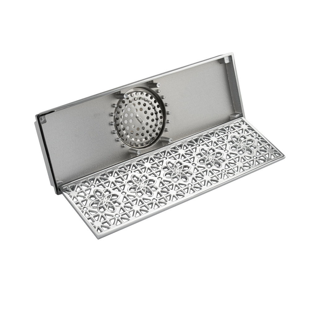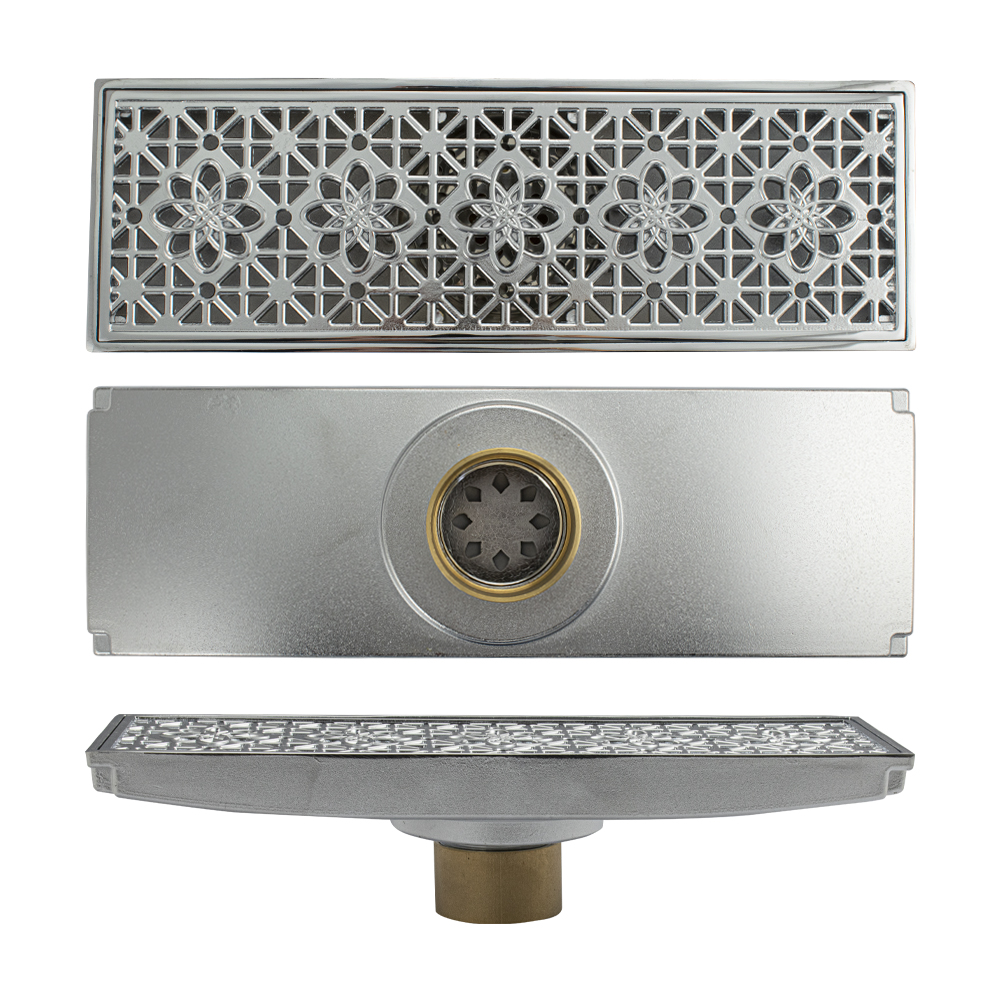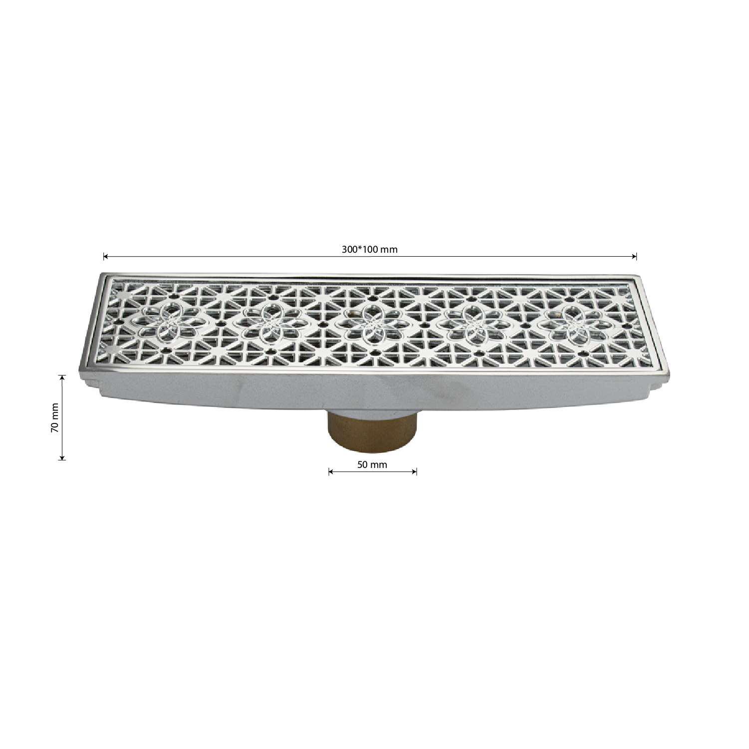 Душевой сливной трап из латуни с хромированной крышкой с декором, вертикальный с сухим затвором воды – это специальный элемент сантехнических коммуникаций, предназначенный для отвода воды в систему канализации. Как правило, душевые трапы устанавливаются непосредственно в пол. Благодаря небольшим габаритам и высоте душевые трапы идеальны для установки в душевых зонах. Это важно для организации пространства, где нет возможности установить классическую ванну: в малогабаритных квартирах, студиях, совмещенных санузлах и т.п. Габаритные размеры: высота 70 мм, ширина 100 мм, длина 300 мм, выход в канализацию 50 мм. Вес - 1,500 кг, объём - 0,00239 м3.