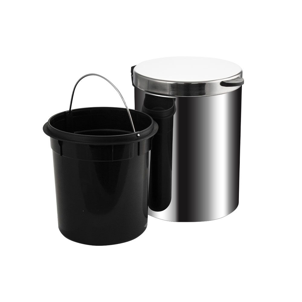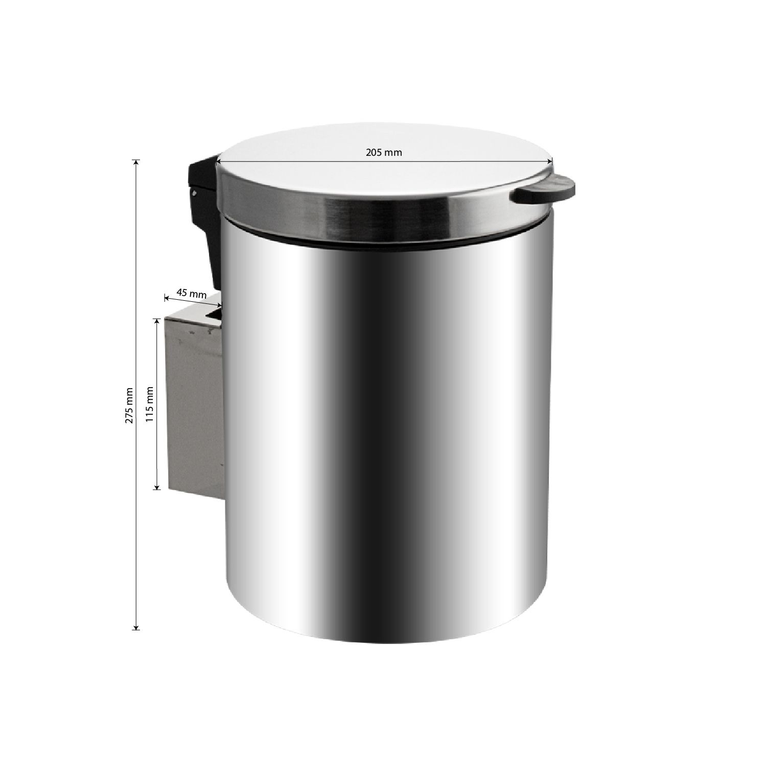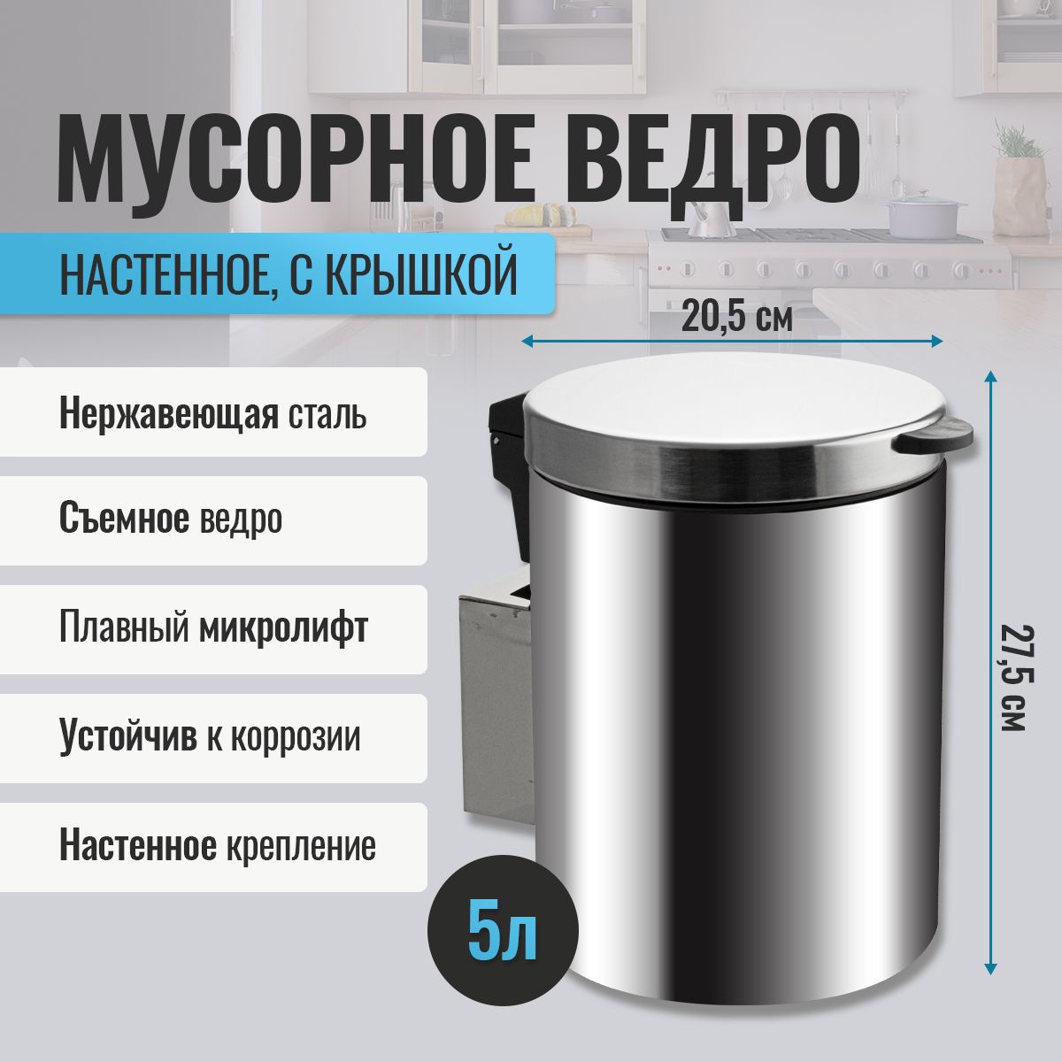 Круглое хромированное ведро с ситемой закрывания крышки - микролифт, с настенным креплением, для хранения мусора с откидной крышкой прекрасно подойдет для ванной комнаты, туалета или кухни и офиса. Нержавеющая сталь SUS 410. Ведро оснащено пластиковым гигиеническим контейнером с металлической ручкой для переноса и плавным механизмом поднятия - опускание крышки. Объём ведра 5 литров. Отличное решение для утилизации мелкого бытового мусора. Наличие крышки обеспечивает защиту от неприятных запахов и распространения бактерий. Благодаря современному дизайну ведро впишется в интерьер любой кухни и ванной комнаты. Преимущества ведра для мусора с педалью - удобно устанавливается - изготовлено из устойчивой к коррозии нержавеющей стали с хромированным покрытием - пользоваться изделием удобно и гигиенично благодаря пластиковой ручке в крышке. Габаритные размеры: высота 275 мм, диаметр 205 мм. Вес - 1,000 кг, объём - 0,01640 м3.