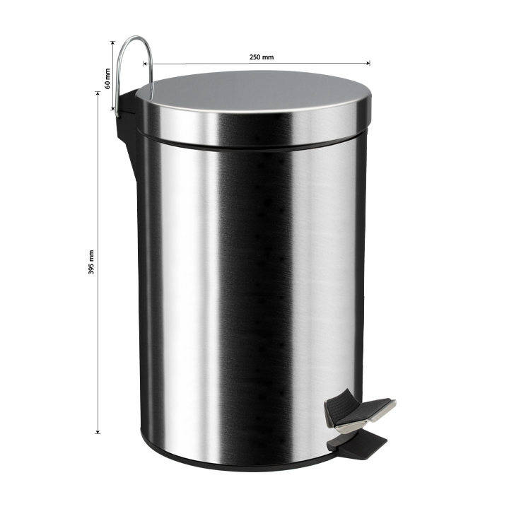 Круглое хромированное ведро для хранения мусора, с педалью и откидной крышкой, прекрасно подойдет для ванной комнаты, туалета или кухни и офиса. Ведро оснащено пластиковым гигиеническим контейнером с металлической ручкой для переноса и механизмом поднятия крышки, при помощи нажатия на педаль. Объём ведра 12 литров. Отличное решение для утилизации мелкого бытового мусора. Наличие крышки обеспечивает защиту от неприятных запахов и распространения бактерий, а педальная система открывания позволяет не прикасаться к баку руками. Благодаря современному дизайну ведро впишется в интерьер любой кухни и ванной комнаты. Преимущества ведра для мусора с педалью: удобно устанавливается и перемещается на любое место; изготовлено из устойчивой к коррозии нержавеющей стали с хромированным покрытием; пользоваться изделием удобно и гигиенично благодаря педали в нижней части корпуса. Нескользящая пластиковая основа ведра предотвращает повреждение пола. Габаритные размеры: высота 395 мм, диаметр 250 мм. Вес - 1,700 кг, объём - 0