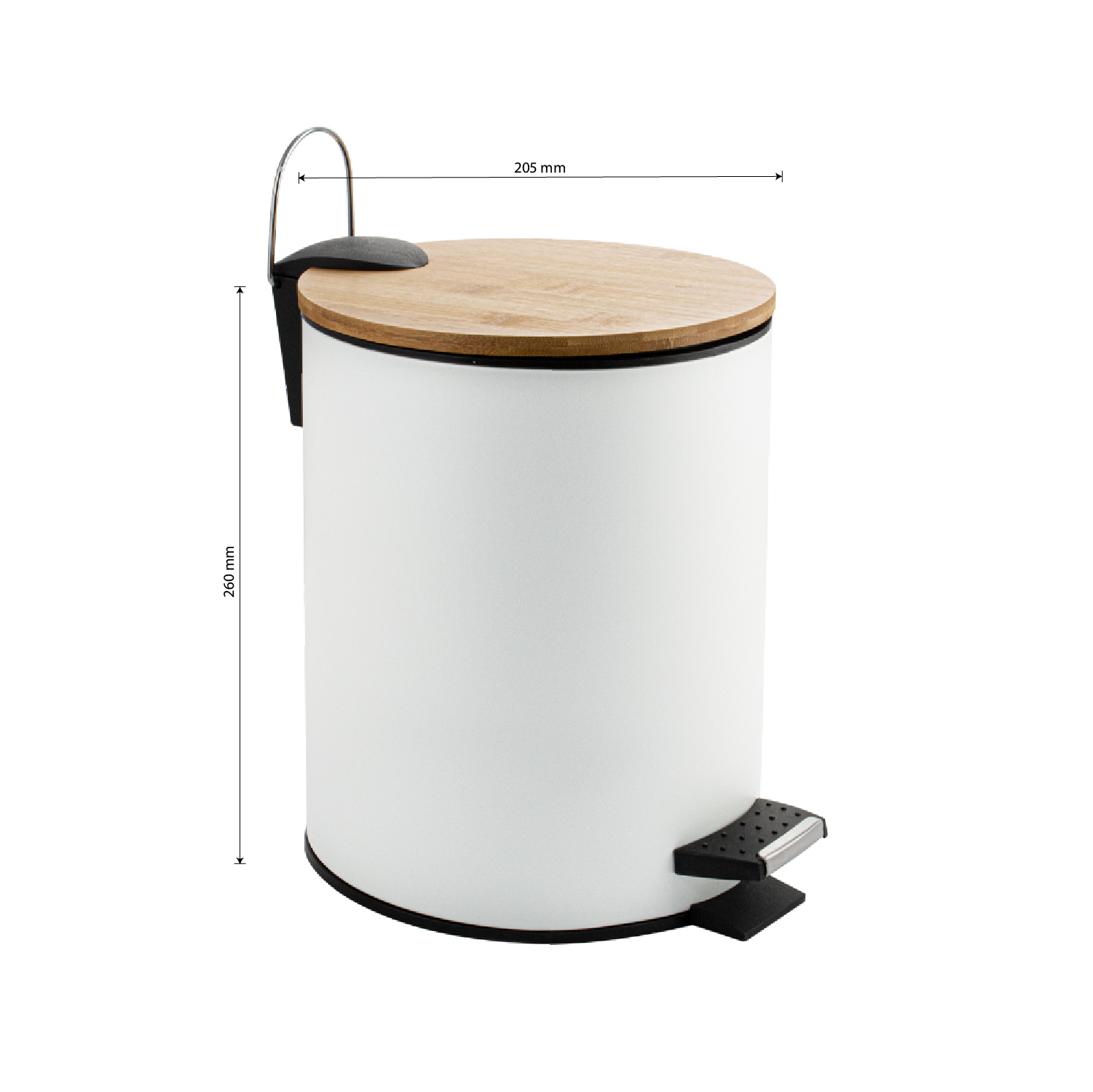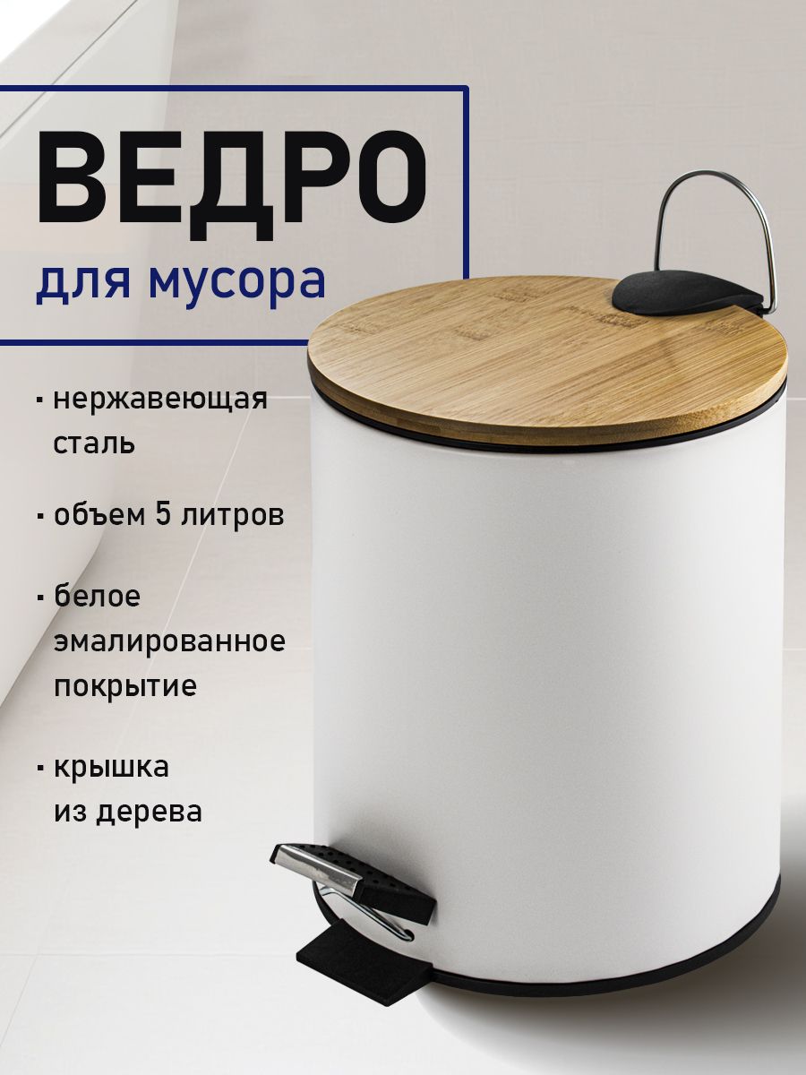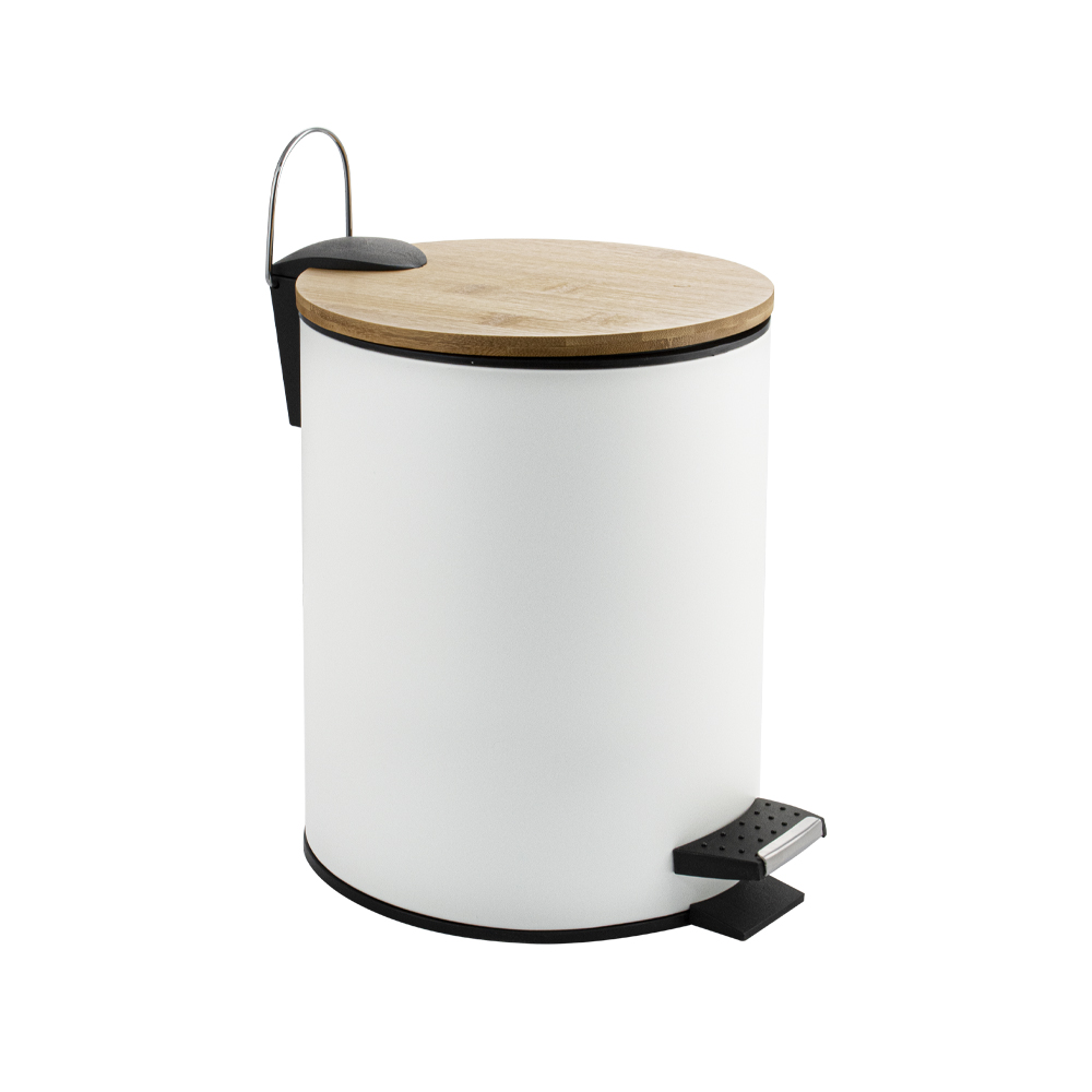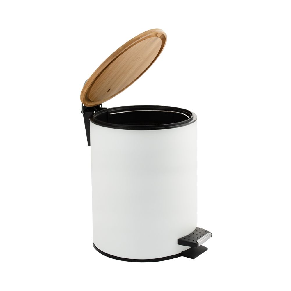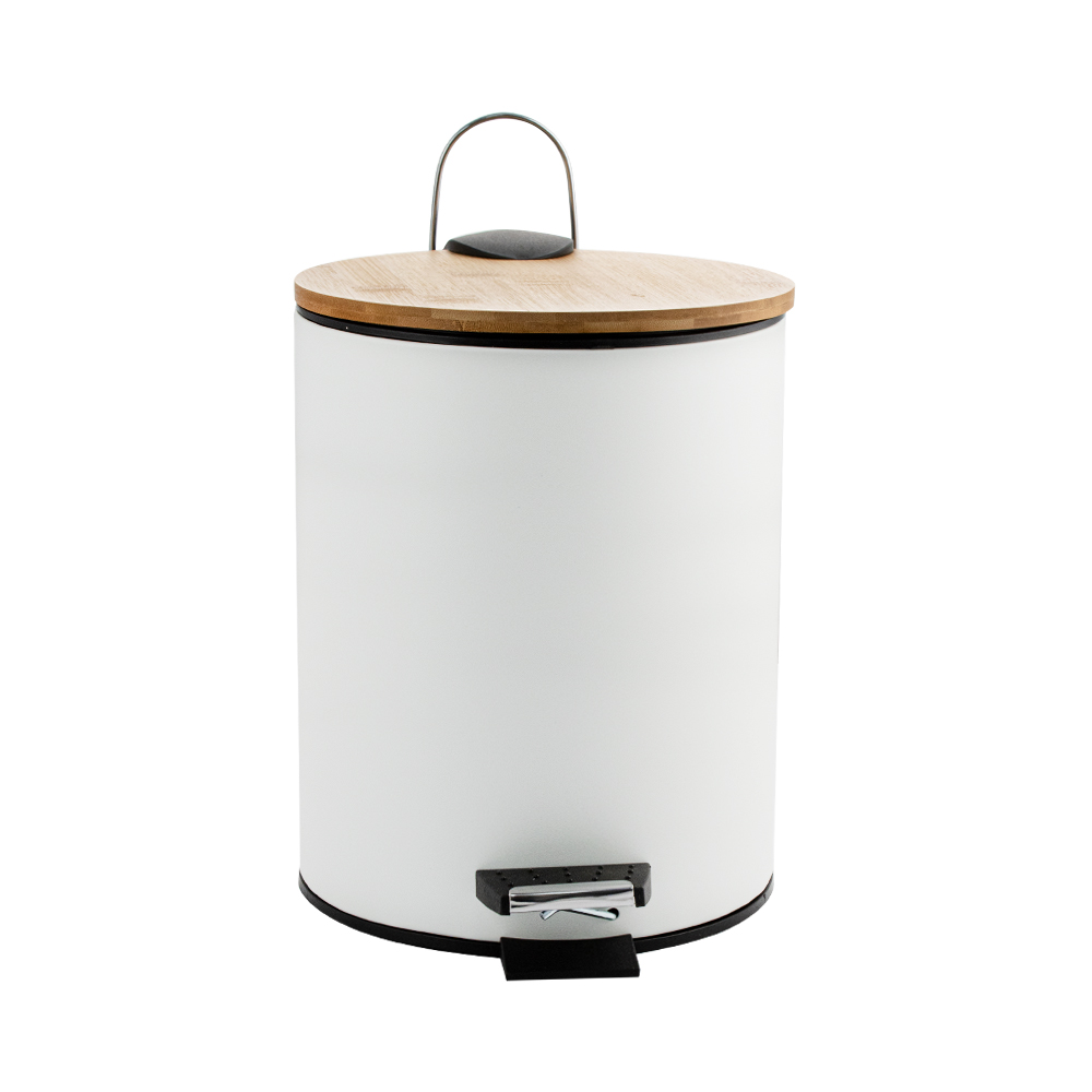Круглое ведро белое с крышкой из натурального бамбука, для хранения мусора, с педалью и откидной крышкой, прекрасно подойдет для ванной комнаты, туалета или кухни и офиса. Ведро оснащено пластиковым гигиеническим контейнером с металлической ручкой для переноса и механизмом поднятия крышки, при помощи нажатия на педаль. Объём ведра 5 литров. Отличное решение для утилизации мелкого бытового мусора. Наличие крышки обеспечивает защиту от неприятных запахов и распространения бактерий, а педальная система открывания позволяет не прикасаться к баку руками. Благодаря современному дизайну ведро впишется в интерьер любой кухни и ванной комнаты. Преимущества ведра для мусора с педалью: удобно устанавливается и перемещается на любое место; изготовлено из устойчивой к коррозии нержавеющей стали с белым эмалированным покрытием; пользоваться изделием удобно и гигиенично благодаря педали в нижней части корпуса. Нескользящая пластиковая основа ведра предотвращает повреждение пола. Габаритные размеры: высота 260 мм, диаметр 20