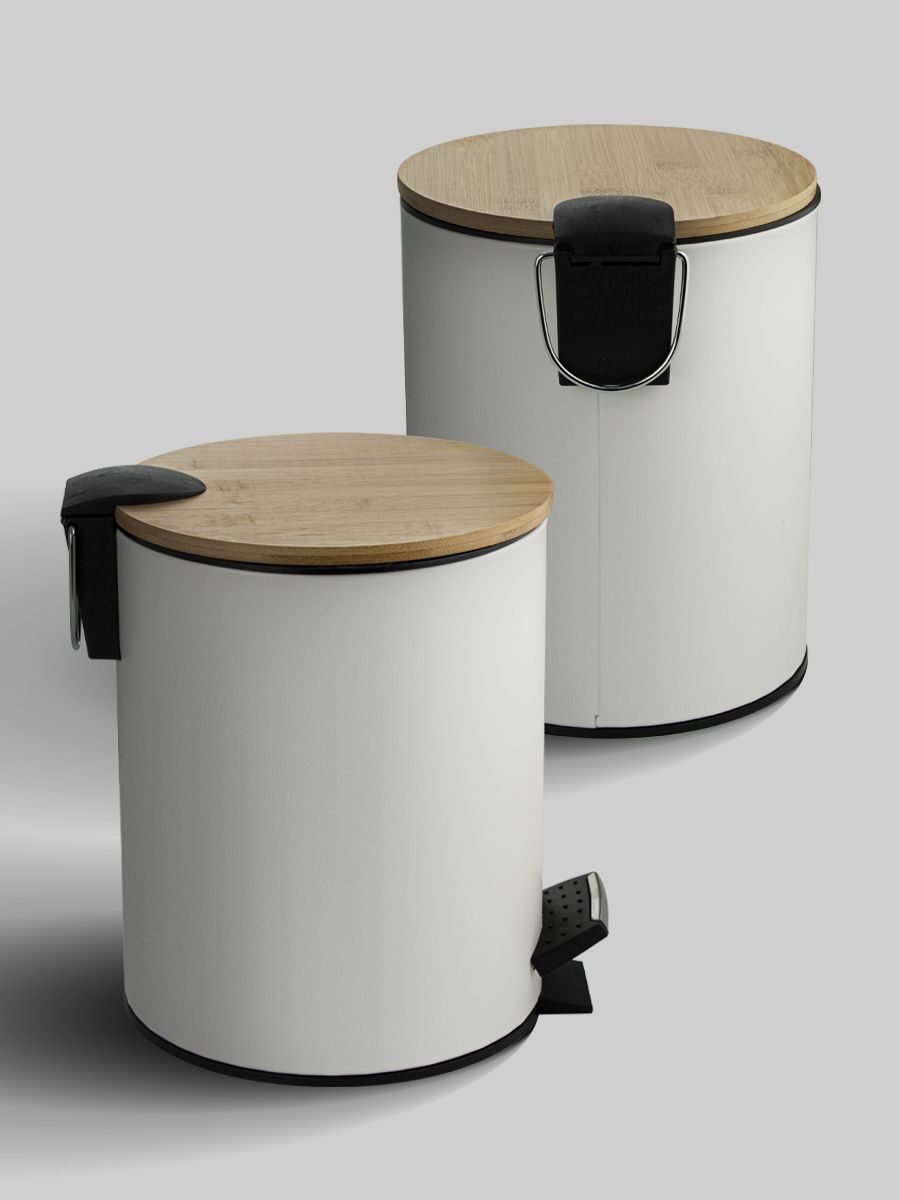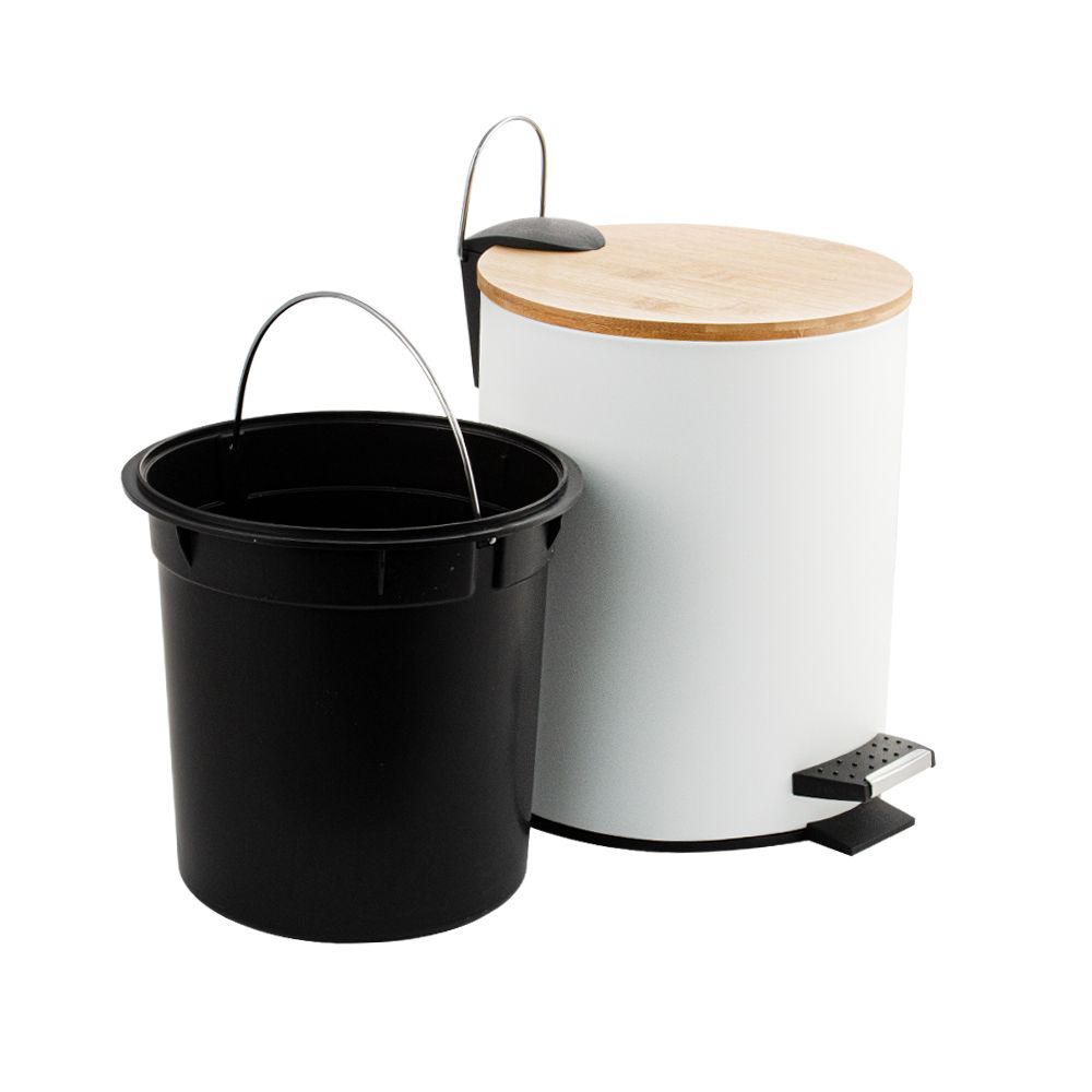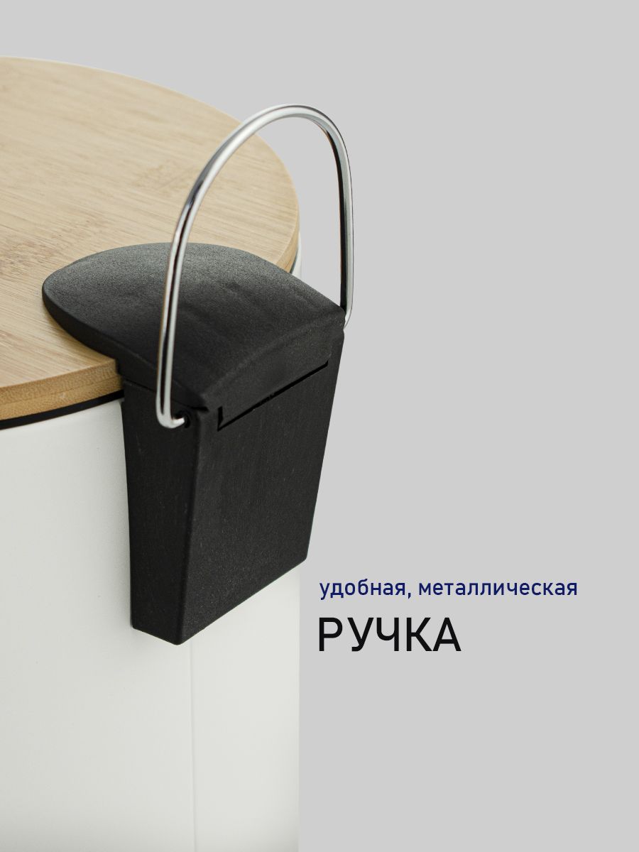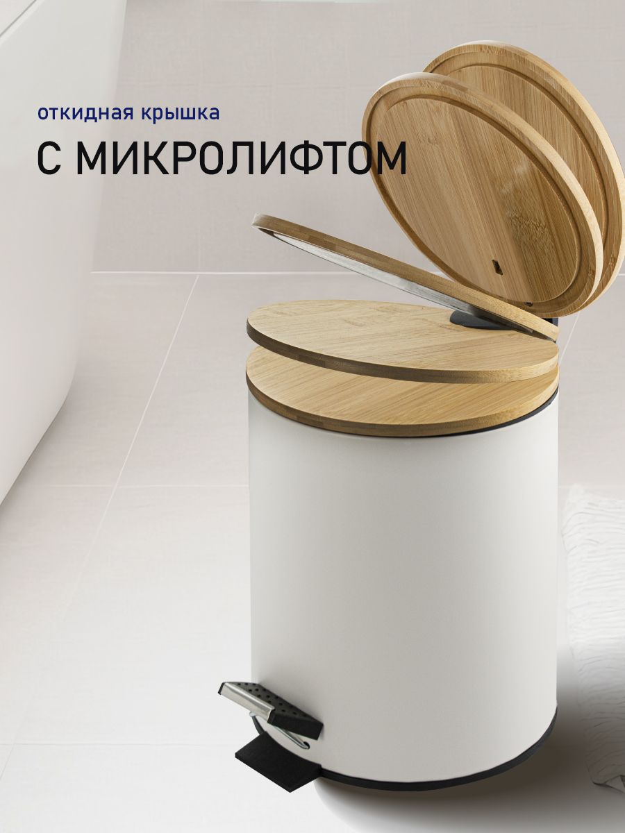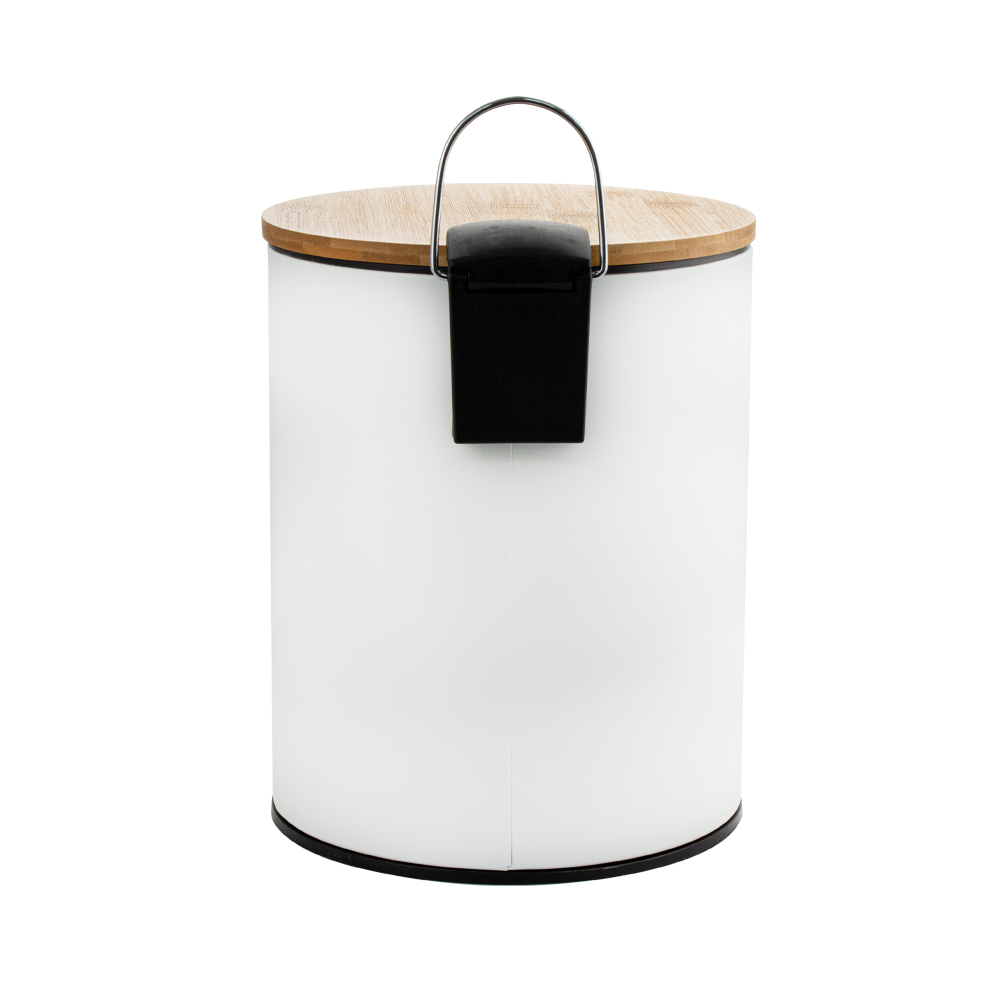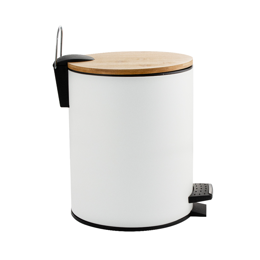 Круглое ведро белое с крышкой из натурального бамбука, для хранения мусора, с педалью и откидной крышкой, прекрасно подойдет для ванной комнаты, туалета или кухни и офиса. Ведро оснащено пластиковым гигиеническим контейнером с металлической ручкой для переноса и механизмом поднятия крышки, при помощи нажатия на педаль. Объём ведра 5 литров. Отличное решение для утилизации мелкого бытового мусора. Наличие крышки обеспечивает защиту от неприятных запахов и распространения бактерий, а педальная система открывания позволяет не прикасаться к баку руками. Благодаря современному дизайну ведро впишется в интерьер любой кухни и ванной комнаты. Преимущества ведра для мусора с педалью: удобно устанавливается и перемещается на любое место; изготовлено из устойчивой к коррозии нержавеющей стали с белым эмалированным покрытием; пользоваться изделием удобно и гигиенично благодаря педали в нижней части корпуса. Нескользящая пластиковая основа ведра предотвращает повреждение пола. Габаритные размеры: высота 260 мм, диаметр 20