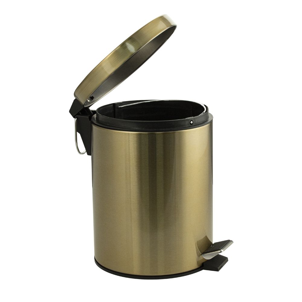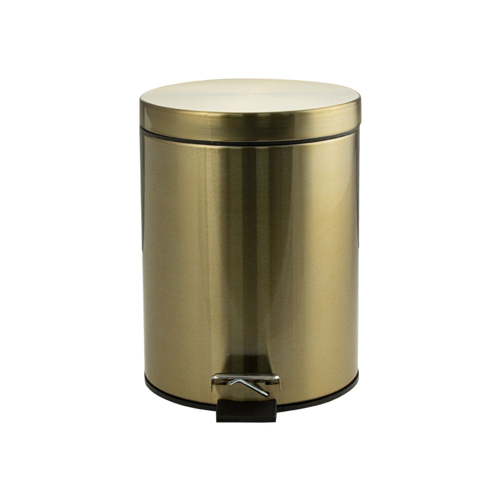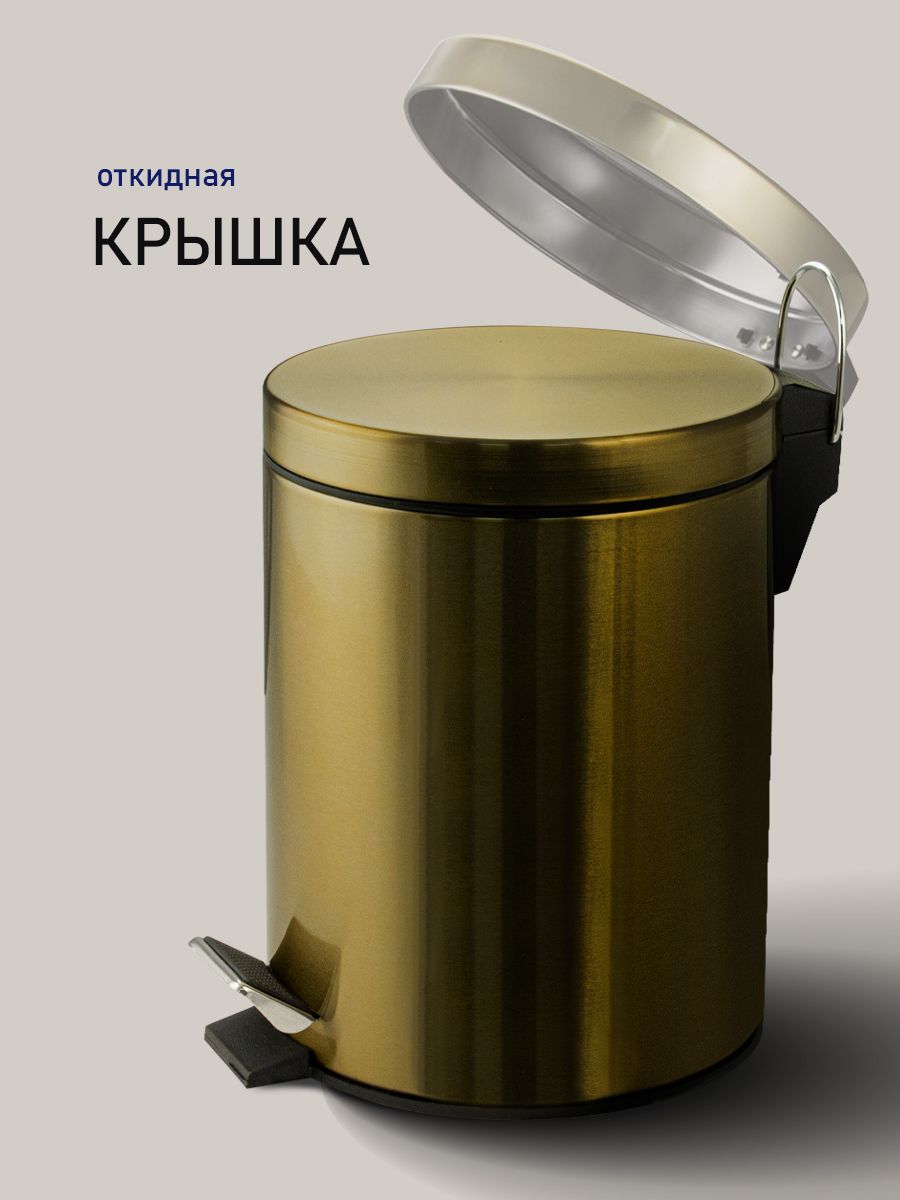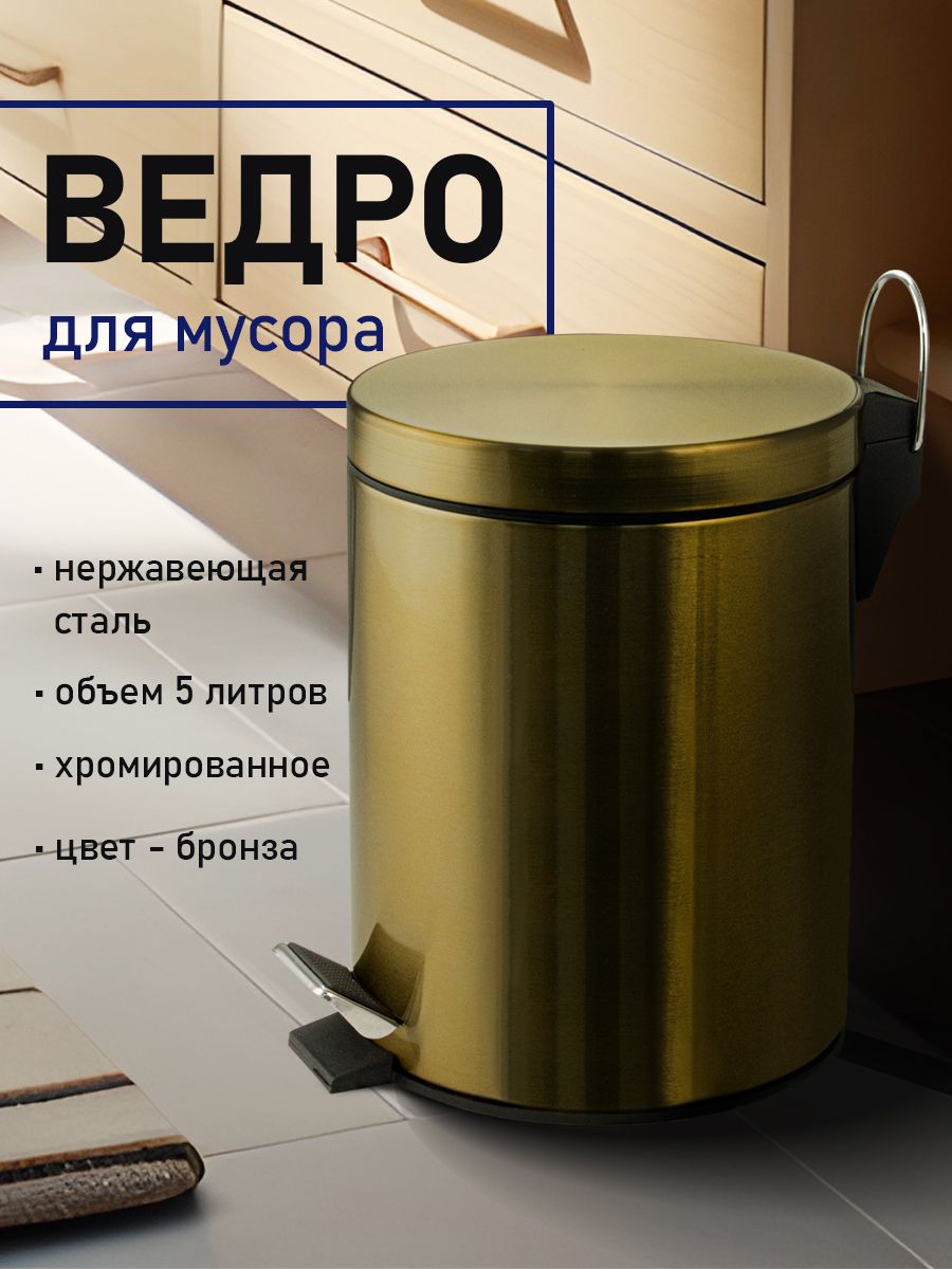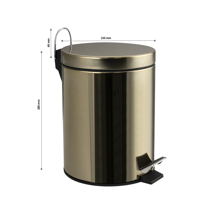 Круглое ведро, цвет бронза, для хранения мусора с педалью и откидной крышкой прекрасно подойдет для ванной комнаты, туалета или кухни и офиса. Ведро оснащено пластиковым гигиеническим контейнером с металлической ручкой для переноса и механизмом поднятия крышки, при помощи нажатия на педаль. Объём ведра 5 литров. Отличное решение для утилизации мелкого бытового мусора. Наличие крышки обеспечивает защиту от неприятных запахов и распространения бактерий, а педальная система открывания позволяет не прикасаться к баку руками. Благодаря современному дизайну ведро впишется в интерьер любой кухни и ванной комнаты. Преимущества ведра для мусора с педалью: удобно устанавливается и перемещается на любое место; изготовлено из устойчивой к коррозии нержавеющей стали с покрытием под состаренную бронзу, глянцевое; пользоваться изделием удобно и гигиенично благодаря педали в нижней части корпуса. Нескользящая пластиковая основа ведра предотвращает повреждение пола. Габаритные размеры: высота 280 мм, диаметр 205 мм. Вес - 1,