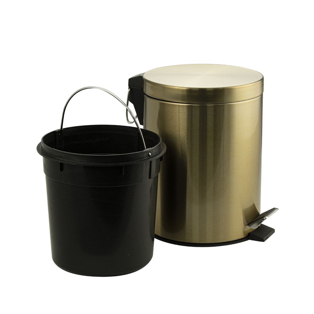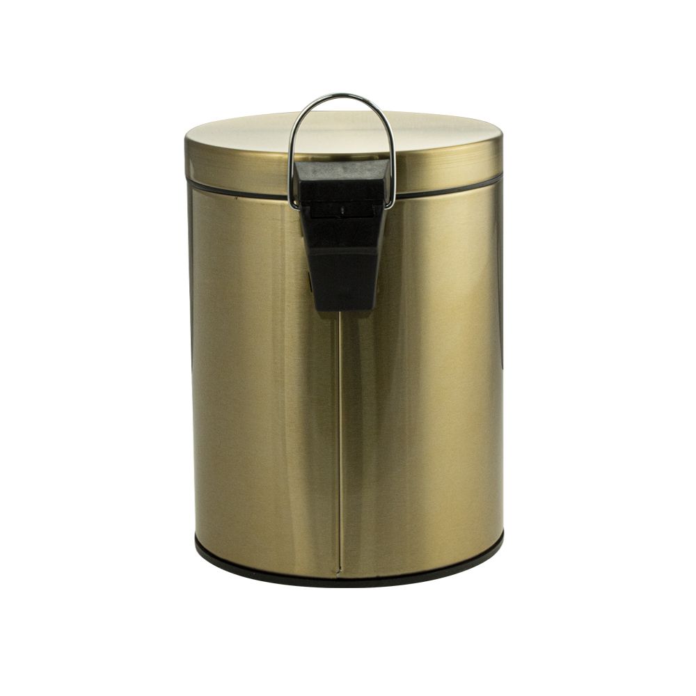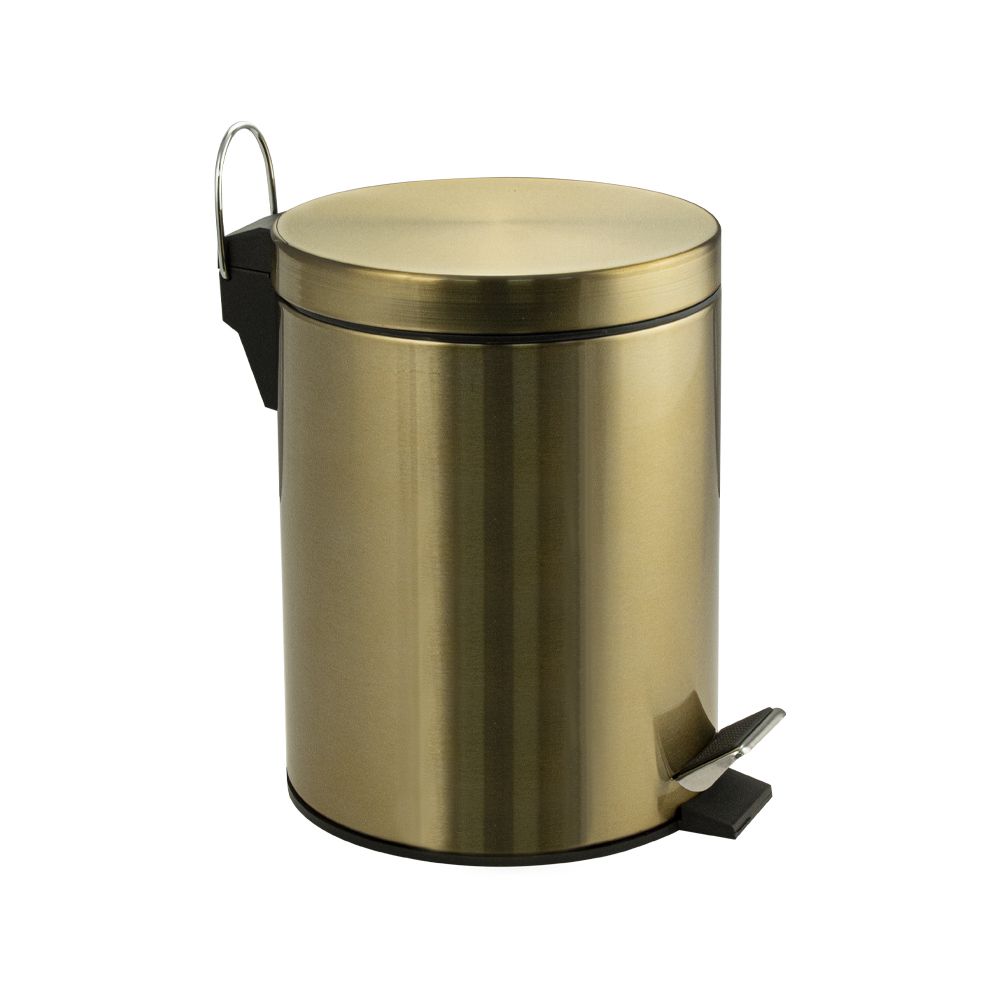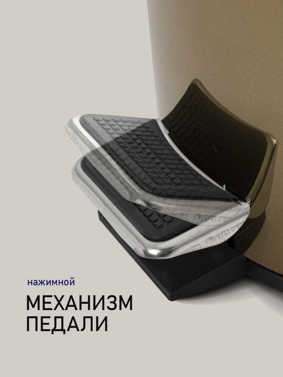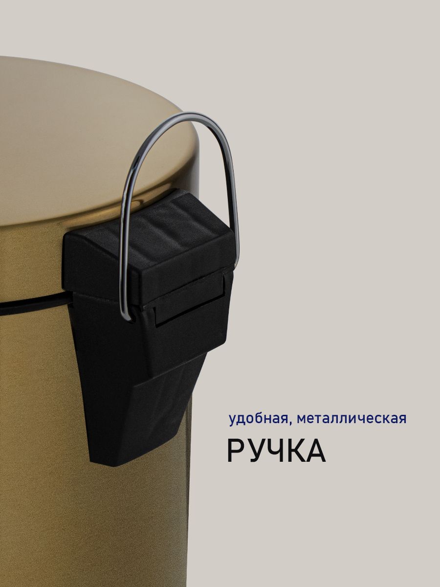 Круглое ведро, цвет бронза, для хранения мусора с педалью и откидной крышкой прекрасно подойдет для ванной комнаты, туалета или кухни и офиса. Ведро оснащено пластиковым гигиеническим контейнером с металлической ручкой для переноса и механизмом поднятия крышки, при помощи нажатия на педаль. Объём ведра 5 литров. Отличное решение для утилизации мелкого бытового мусора. Наличие крышки обеспечивает защиту от неприятных запахов и распространения бактерий, а педальная система открывания позволяет не прикасаться к баку руками. Благодаря современному дизайну ведро впишется в интерьер любой кухни и ванной комнаты. Преимущества ведра для мусора с педалью: удобно устанавливается и перемещается на любое место; изготовлено из устойчивой к коррозии нержавеющей стали с покрытием под состаренную бронзу, глянцевое; пользоваться изделием удобно и гигиенично благодаря педали в нижней части корпуса. Нескользящая пластиковая основа ведра предотвращает повреждение пола. Габаритные размеры: высота 280 мм, диаметр 205 мм. Вес - 1,