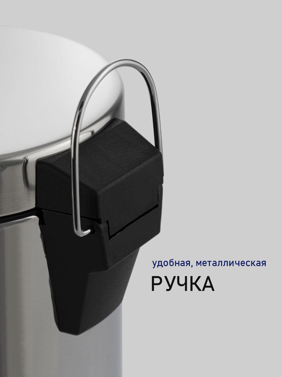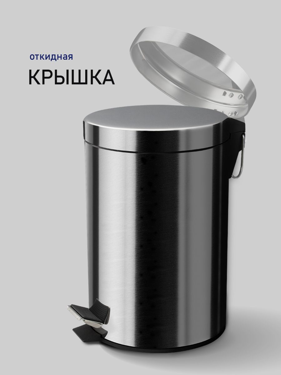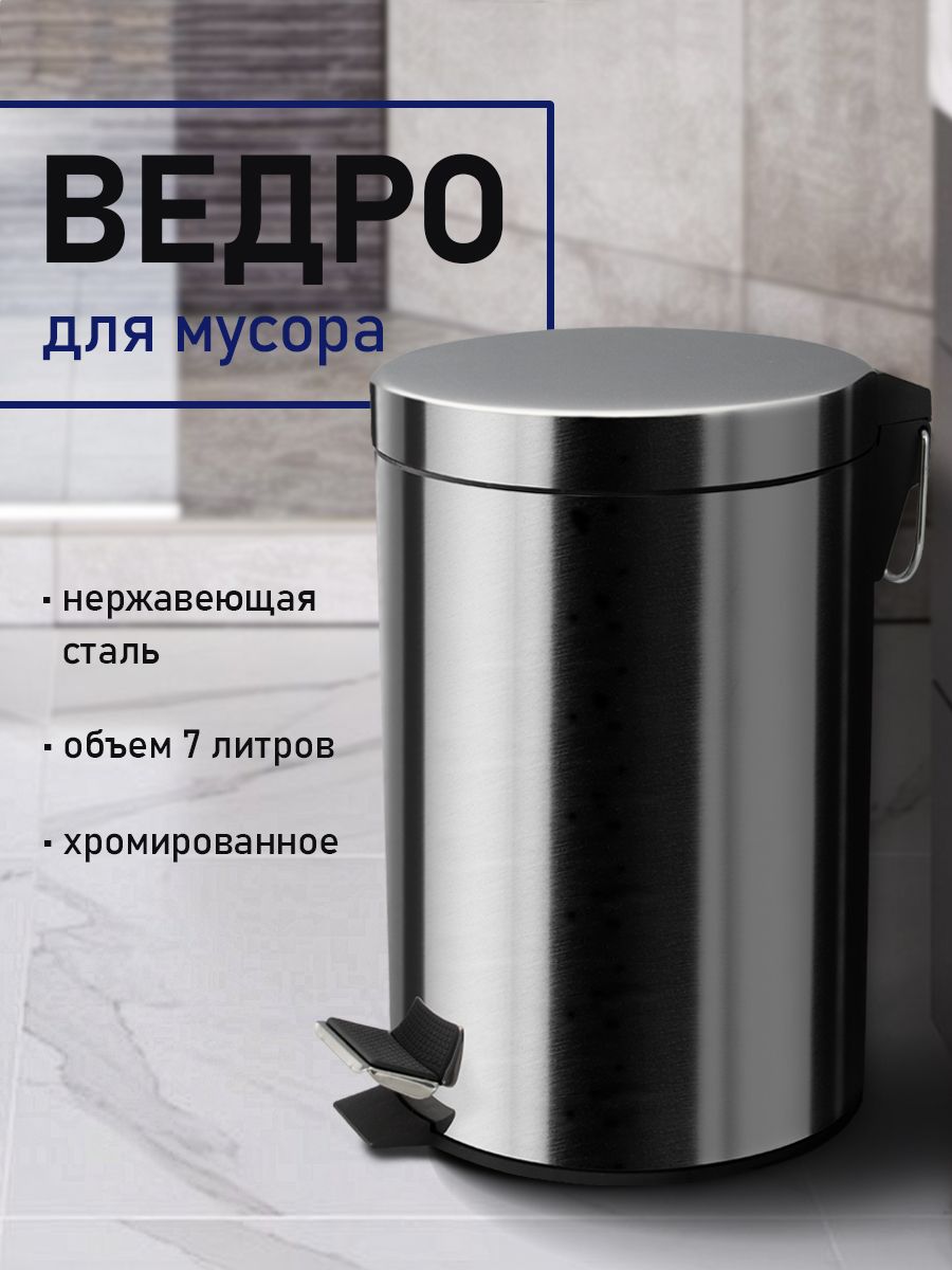 Круглое хромированное ведро для хранения мусора с педалью и откидной крышкой, прекрасно подойдет для ванной комнаты, туалета или кухни и офиса. Нержавеющая сталь SUS 410. Ведро оснащено пластиковым гигиеническим контейнером с металлической ручкой для переноса и механизмом поднятия крышки, при помощи нажатия на педаль. Объём ведра 7 литров. Отличное решение для утилизации мелкого бытового мусора. Наличие крышки обеспечивает защиту от неприятных запахов и распространения бактерий, а педальная система открывания позволяет не прикасаться к баку руками. Благодаря современному дизайну ведро впишется в интерьер любой кухни и ванной комнаты. Преимущества ведра для мусора с педалью: удобно устанавливается и перемещается на любое место; изготовлено из устойчивой к коррозии нержавеющей стали с хромированным покрытием; пользоваться изделием удобно и гигиенично благодаря педали в нижней части корпуса. Нескользящая пластиковая основа ведра предотвращает повреждение пола. Габаритные размеры: высота 310 мм, диаметр 205 мм.