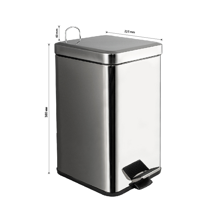 Квадратное хромированное ведро для хранения мусора, с педалью и откидной крышкой, прекрасно подойдет для ванной комнаты, туалета или кухни и офиса, нержавеющая сталь SUS 410. Ведро оснащено пластиковым гигиеническим контейнером с металлической ручкой для переноса и механизмом поднятия крышки, при помощи нажатия на педаль. Объём ведра 12 литров. Отличное решение для утилизации мелкого бытового мусора. Наличие крышки обеспечивает защиту от неприятных запахов и распространения бактерий, а педальная система открывания позволяет не прикасаться к баку руками. Благодаря современному дизайну ведро впишется в интерьер любой кухни и ванной комнаты. Преимущества ведра для мусора с педалью: удобно устанавливается и перемещается на любое место; изготовлено из устойчивой к коррозии нержавеющей стали с хромированным покрытием; пользоваться изделием удобно и гигиенично благодаря педали в нижней части корпуса. Нескользящая пластиковая основа ведра предотвращает повреждение пола. Габаритные размеры: высота 380 мм, ширина 225 м