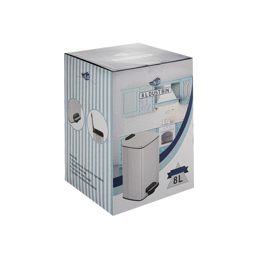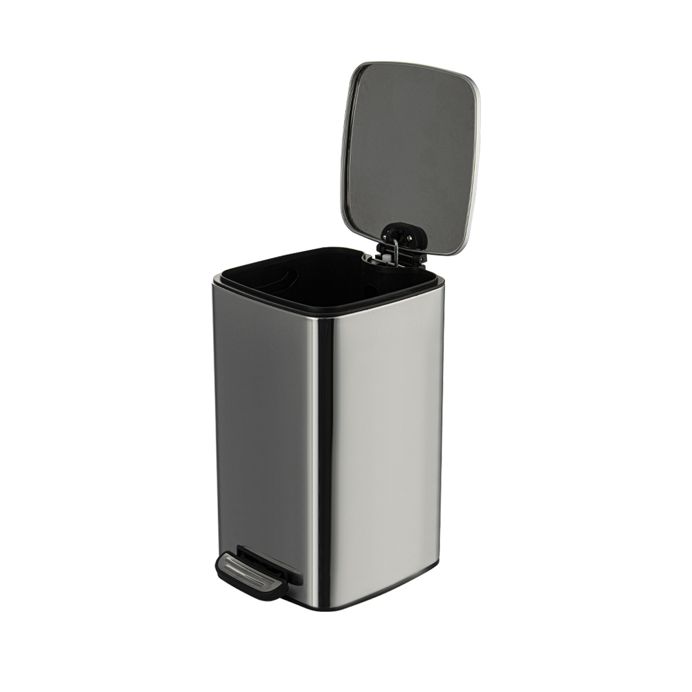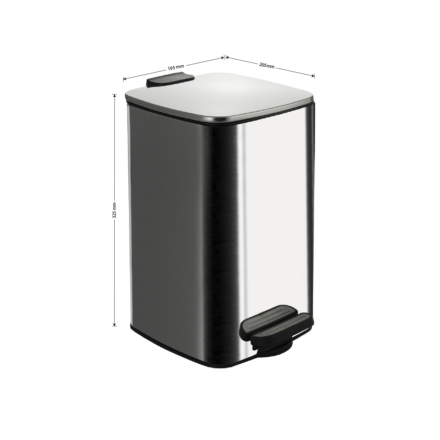 Ведро для мусора с педалью и откидной крышкой с функцией микролифт, прекрасно подойдет для ванной комнаты, туалета или кухни и офиса. Нержавеющая сталь SUS 410. Ведро оснащено пластиковым гигиеническим контейнером с металлической ручкой для переноса и механизмом поднятия крышки, при помощи нажатия на педаль. Объём ведра 8 литров. Отличное решение для утилизации мелкого бытового мусора. Наличие крышки обеспечивает защиту от неприятных запахов и распространения бактерий, а педальная система открывания позволяет не прикасаться к баку руками. Благодаря современному дизайну ведро впишется в интерьер любой кухни и ванной комнаты. Преимущества ведра для мусора с педалью: удобно устанавливается и перемещается на любое место; изготовлено из устойчивой к коррозии нержавеющей стали хромированного цвета; пользоваться изделием удобно и гигиенично благодаря педали в нижней части корпуса. Нескользящая пластиковая основа ведра предотвращает повреждение пола. Габаритные размеры: высота 325 мм, ширина 195 мм, длина 205 мм. Вес