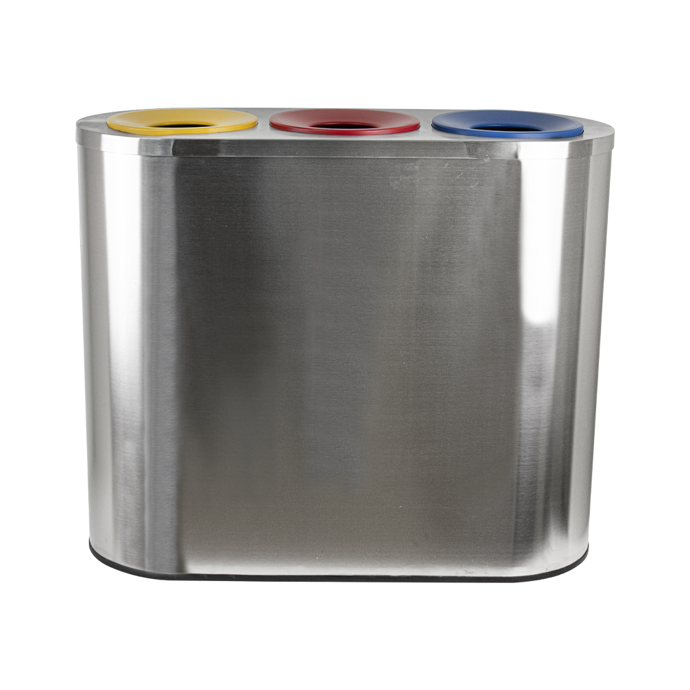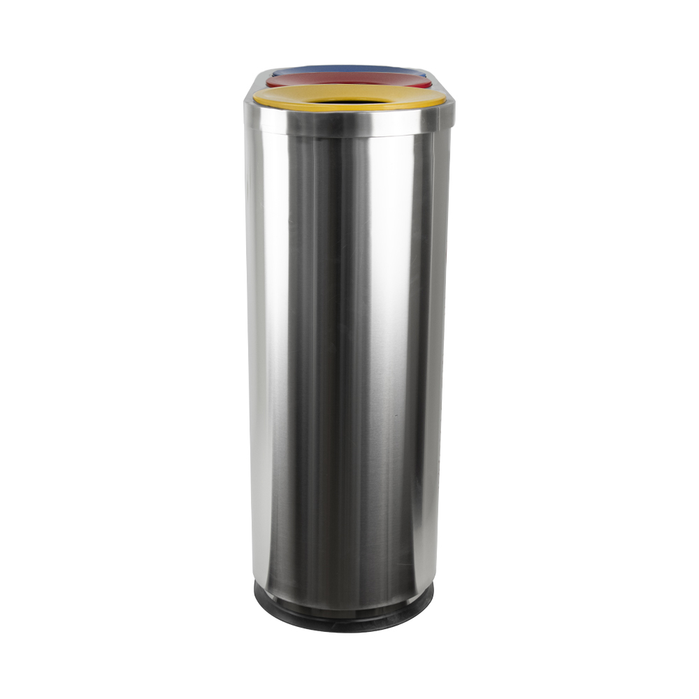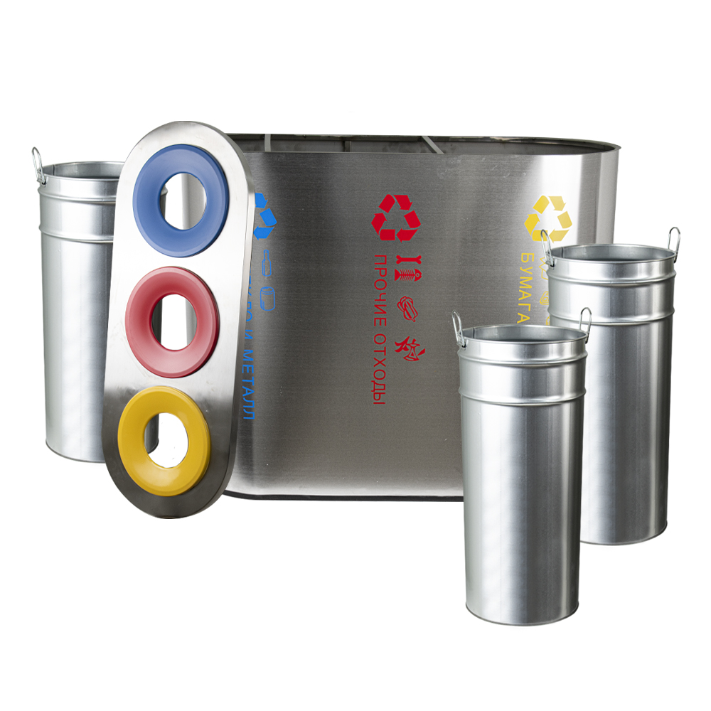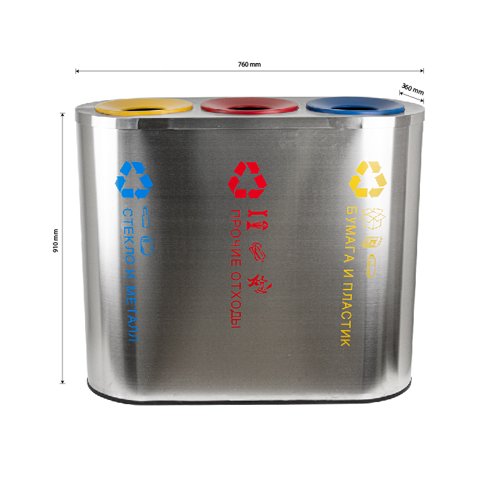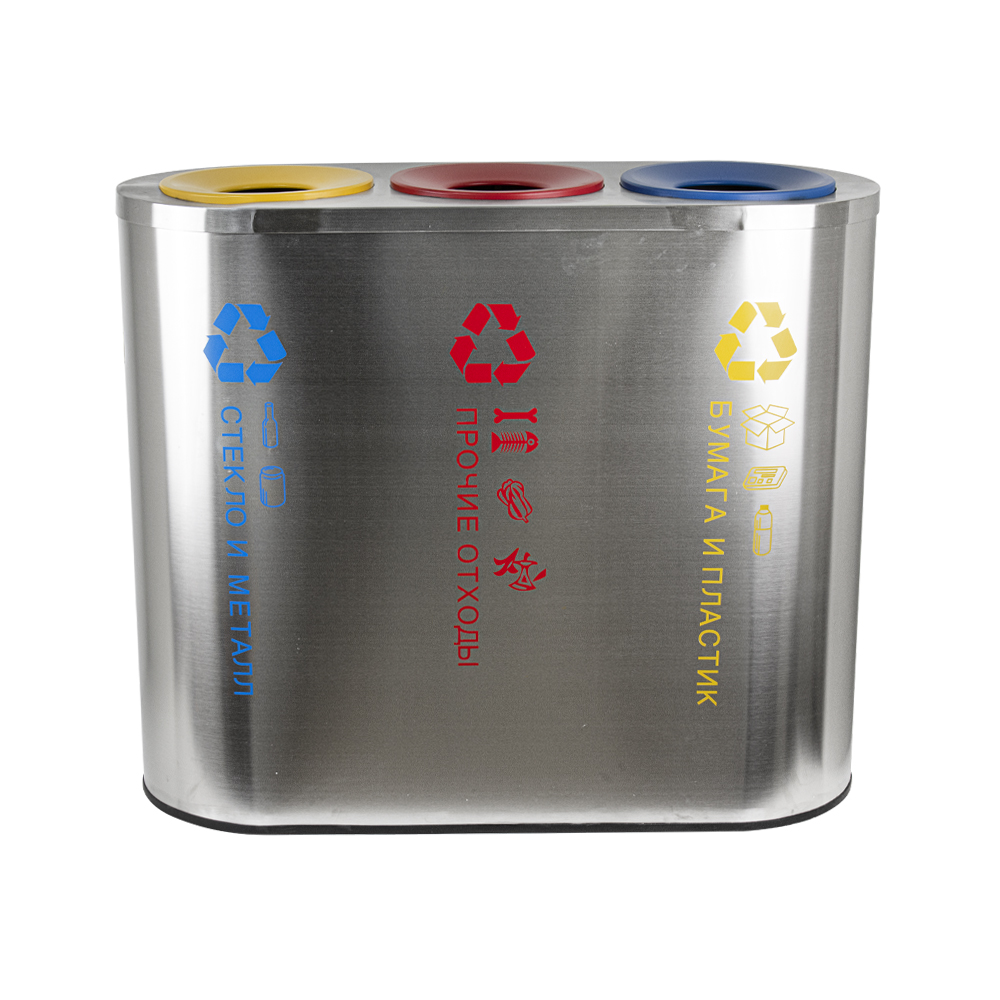 Урна для раздельного сбора мусора - 3 секции, оснащена оцинкованным гигиеническим контейнером - 3 шт, с металлической ручкой для переноса. Отличное решение для утилизации мелкого бытового мусора, изготовлено из устойчивой к коррозии, из нержавеющей стали марки SUS 410. Толщина металла 0,8 мм, объем 230 л. Габаритный размер: высота 910 мм, ширина 760 мм, глубина 360 мм. Нескользящая пластиковая основа ведра предотвращает повреждение пола. Вес - 21,000 кг, объём - 0,33750 м3.