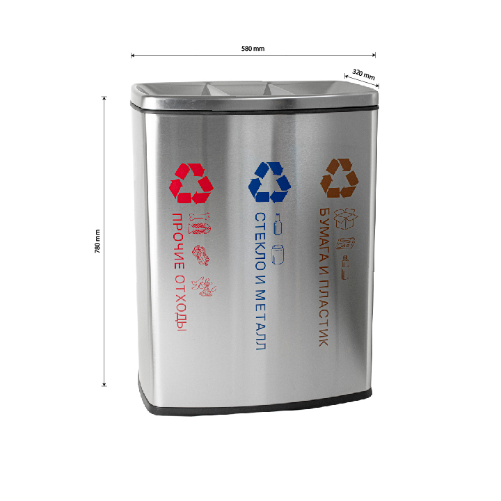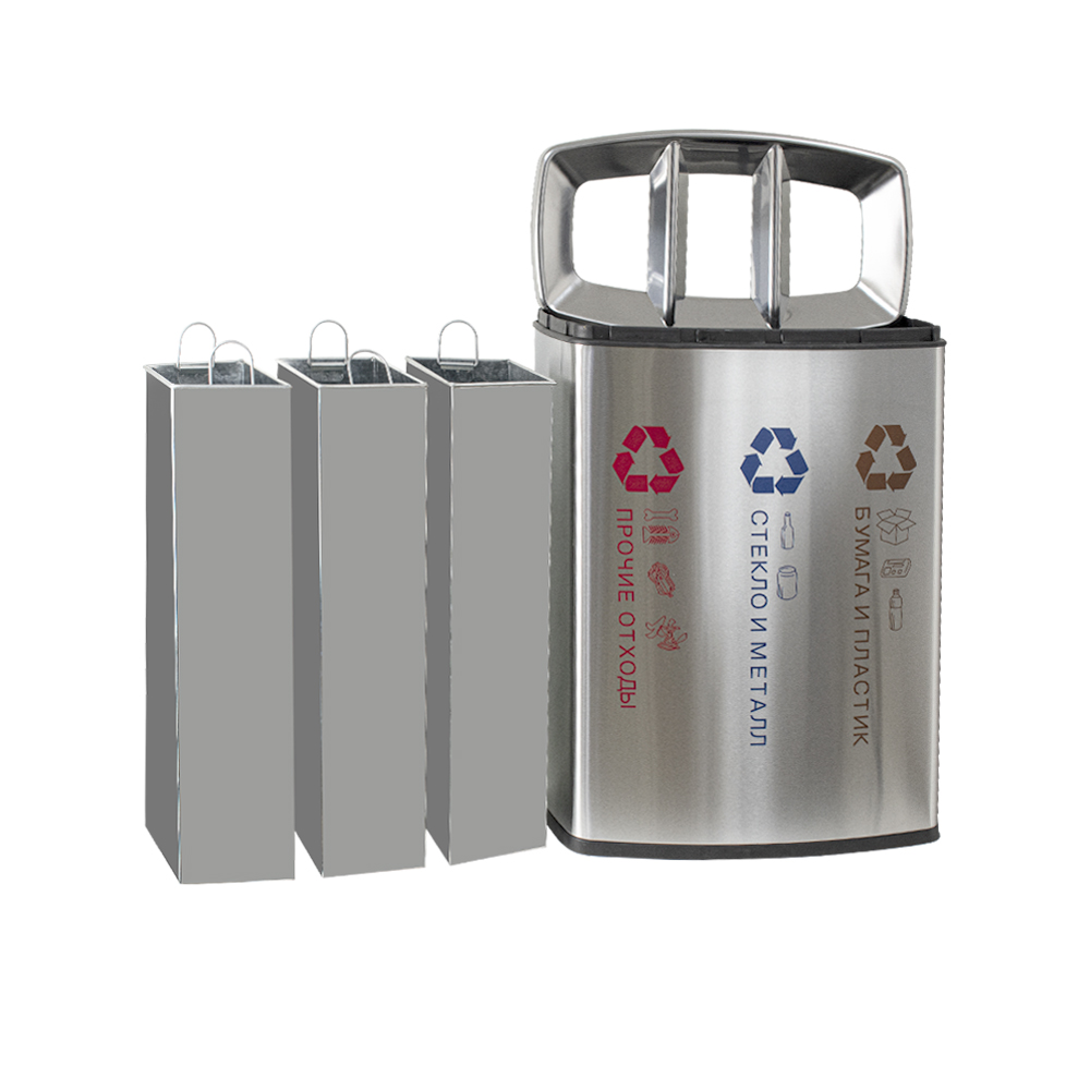 Урна для раздельного сбора мусора, 3 секции, оснащена оцинкованным гигиеническим контейнером - 3 шт, с металлической ручкой для переноса. Отличное решение для утилизации мелкого бытового мусора, изготовлено из устойчивой к коррозии, из нержавеющей стали марки SUS 410. Толщина металла 0,8 мм, объем 140 л. Габаритный размер: высота 780 мм, ширина 580 мм, глубина 320 мм. Нескользящая пластиковая основа ведра предотвращает повреждение пола. Вес - 15,500 кг, объём - 0,18000 м3.