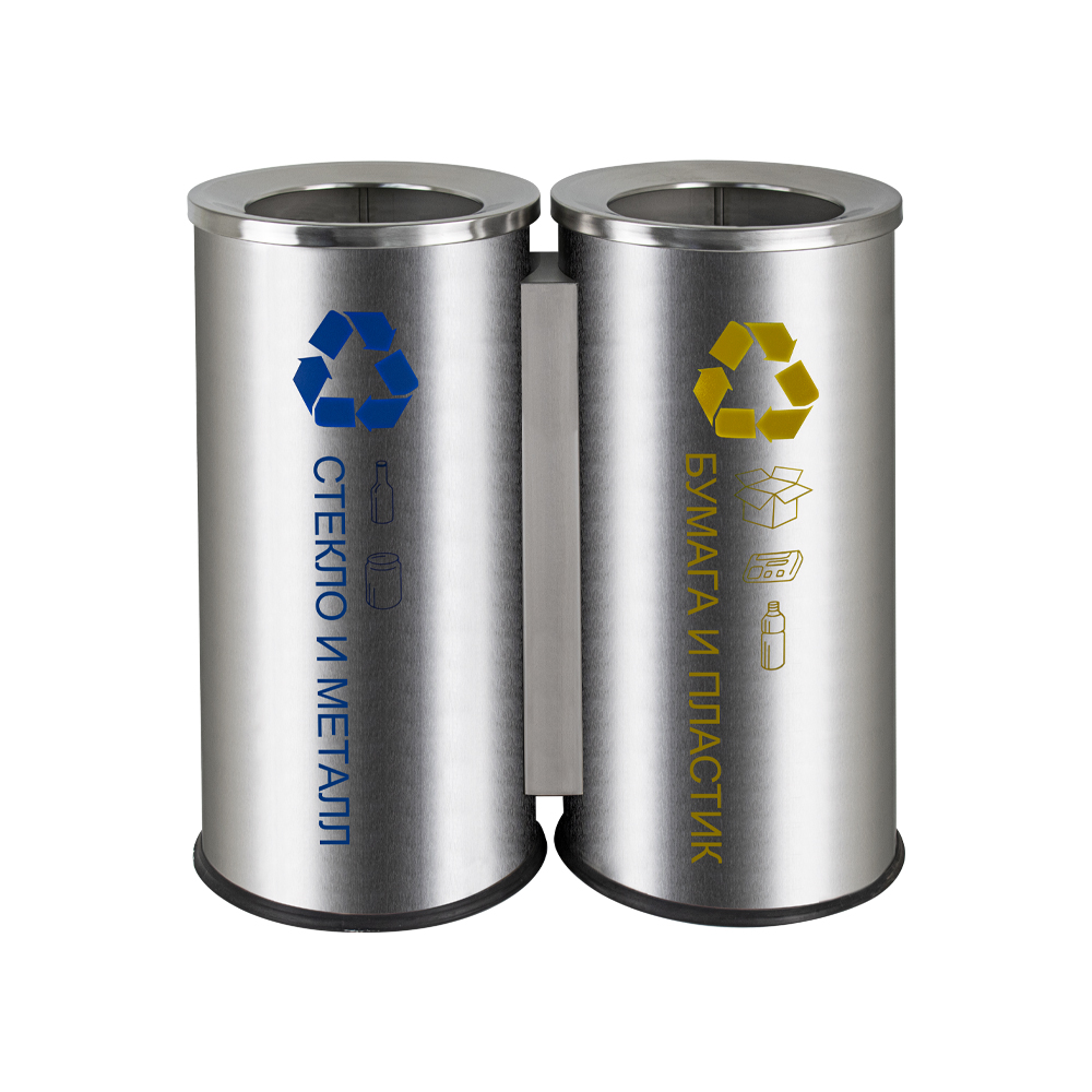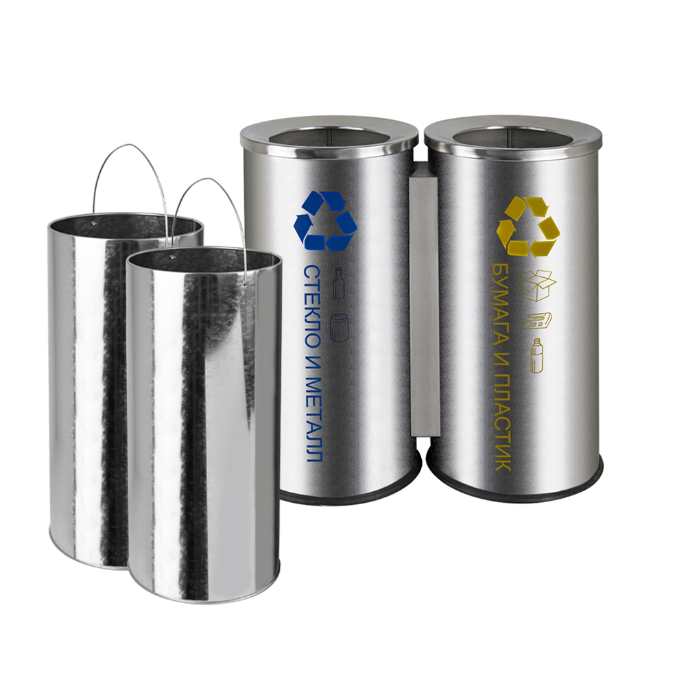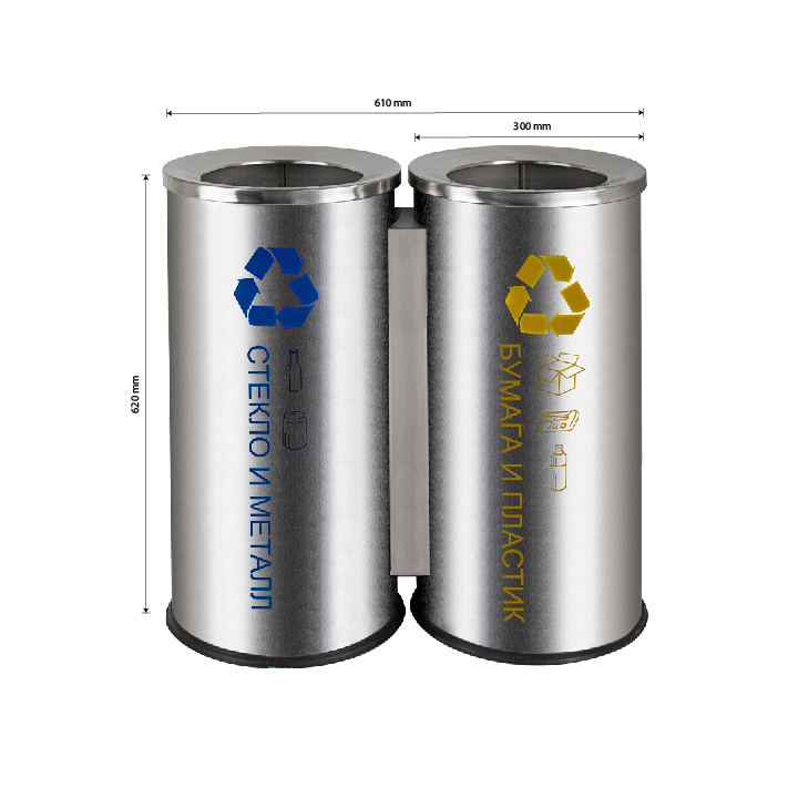 Урна для раздельного сбора мусора - 2 секции, оснащена оцинкованным гигиеническим контейнером - 2 шт, с металлической ручкой для переноса. Отличное решение для утилизации мелкого бытового мусора, изготовлено из устойчивой к коррозии, из нержавеющей стали марки SUS 410. Толщина металла 0,7 мм, объем 100 л. Габаритный размер: высота 620 мм, ширина 610 мм, диаметр одного отсека 300 мм. Нескользящая пластиковая основа ведра предотвращает повреждение пола. Вес - 11,800 кг, объём - 0,17000 м3.