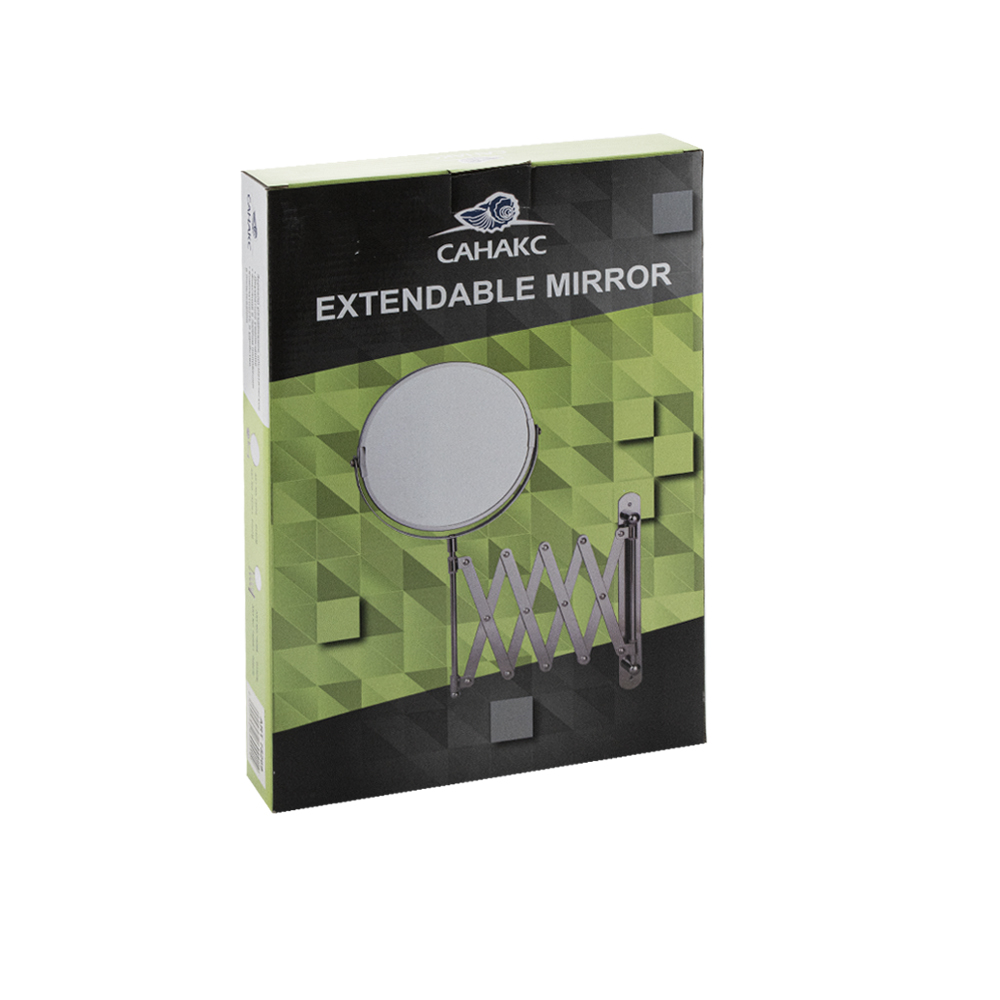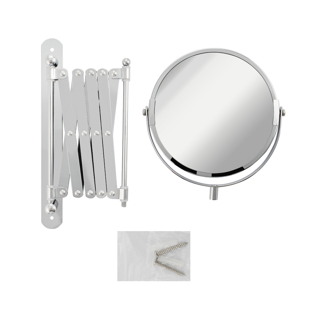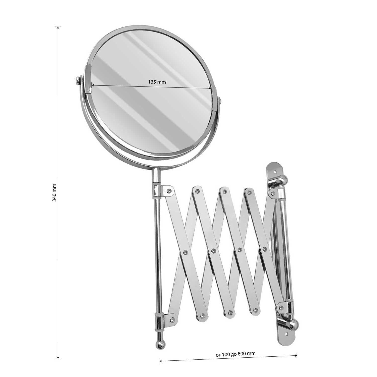 Зеркало настенное, косметическое, раздвижное, двустороннее, с увеличительным эффектом. Изготовлено из прочной нержавеющей стали с хромированным покрытием, которое придает безупречный стильный вид и долговечность. Хромированное покрытие очень стойко переносит истирания и обеспечивает зеркальный блеск изделия. Установлено на металлический хромированный держатель, позволяющий поворачиваться вокруг своей оси и регулировать угол наклона модели. Снабжено механизмом «гармошка», которое позволяет зеркалу выдвигаться на требуемое расстояние и компактно складываться. Одна из сторон зеркала имеет 3х-кратное увеличение удобное для косметических процедур, нанесения макияжа и бритья. Монтируется к стене при помощи крепления, входящего в комплект. Габаритные размеры: диаметр 135 мм, высота 340 мм, длина от 100 до 600 мм. Вес - 0,800 кг, объём - 0,00320 м3.
