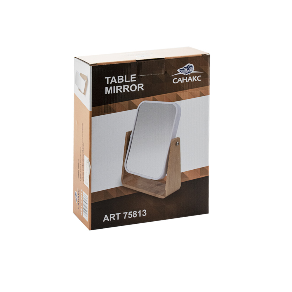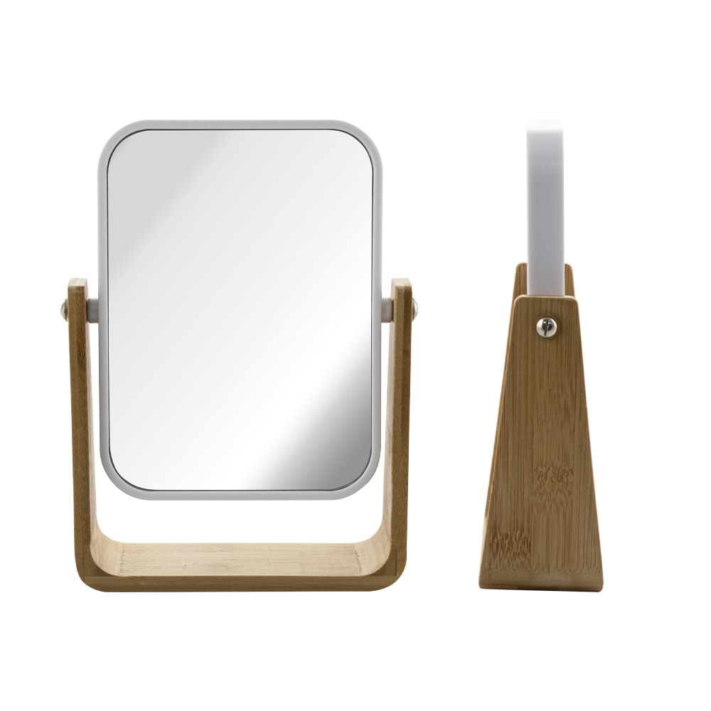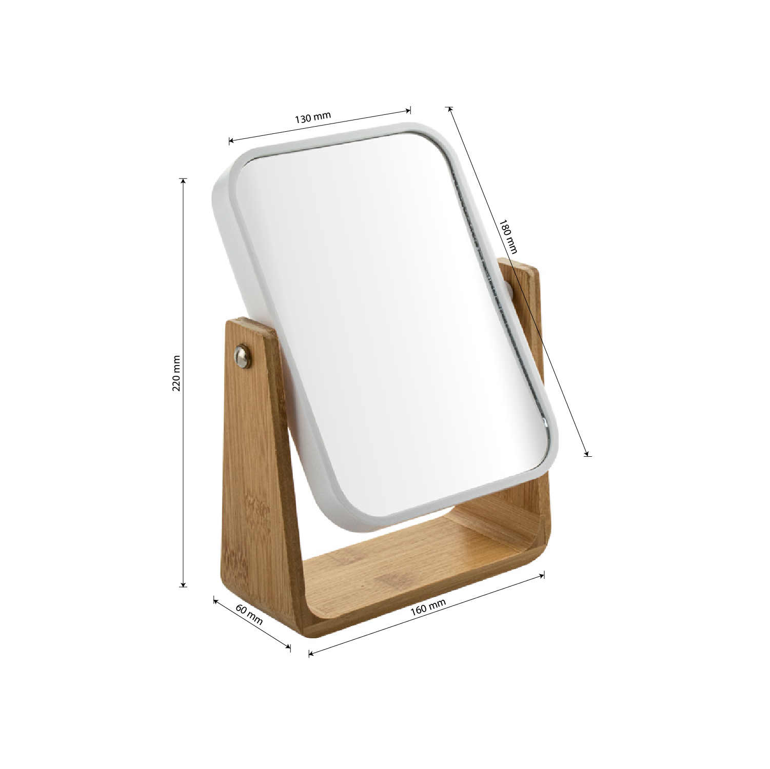 Зеркало настольное, косметическое, двустороннее, с увеличительным эффектом, основание из бамбука. Установлено на металлический держатель, позволяющий поворачиваться вокруг своей оси и регулировать угол наклона модели. Одна из сторон зеркала имеет 3х-кратное увеличение удобное для косметических процедур, нанесения макияжа и бритья. Устанавливается на любую поверхность. Габаритные размеры: высота 220 мм, зеркало 130 х 180 мм, низ бамбуковой подставки 160 х 60 мм. Вес - 0,500 кг, объём - 0,00224 м3.