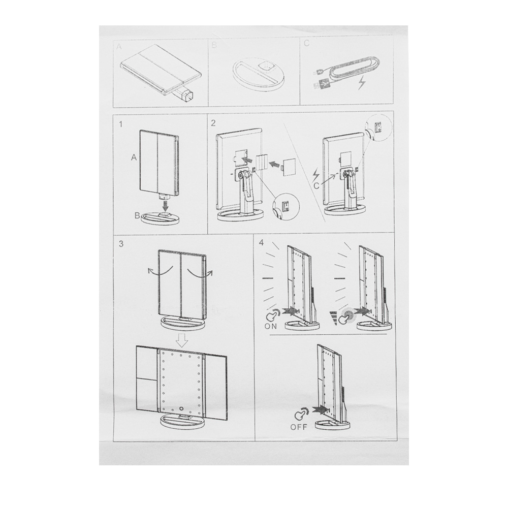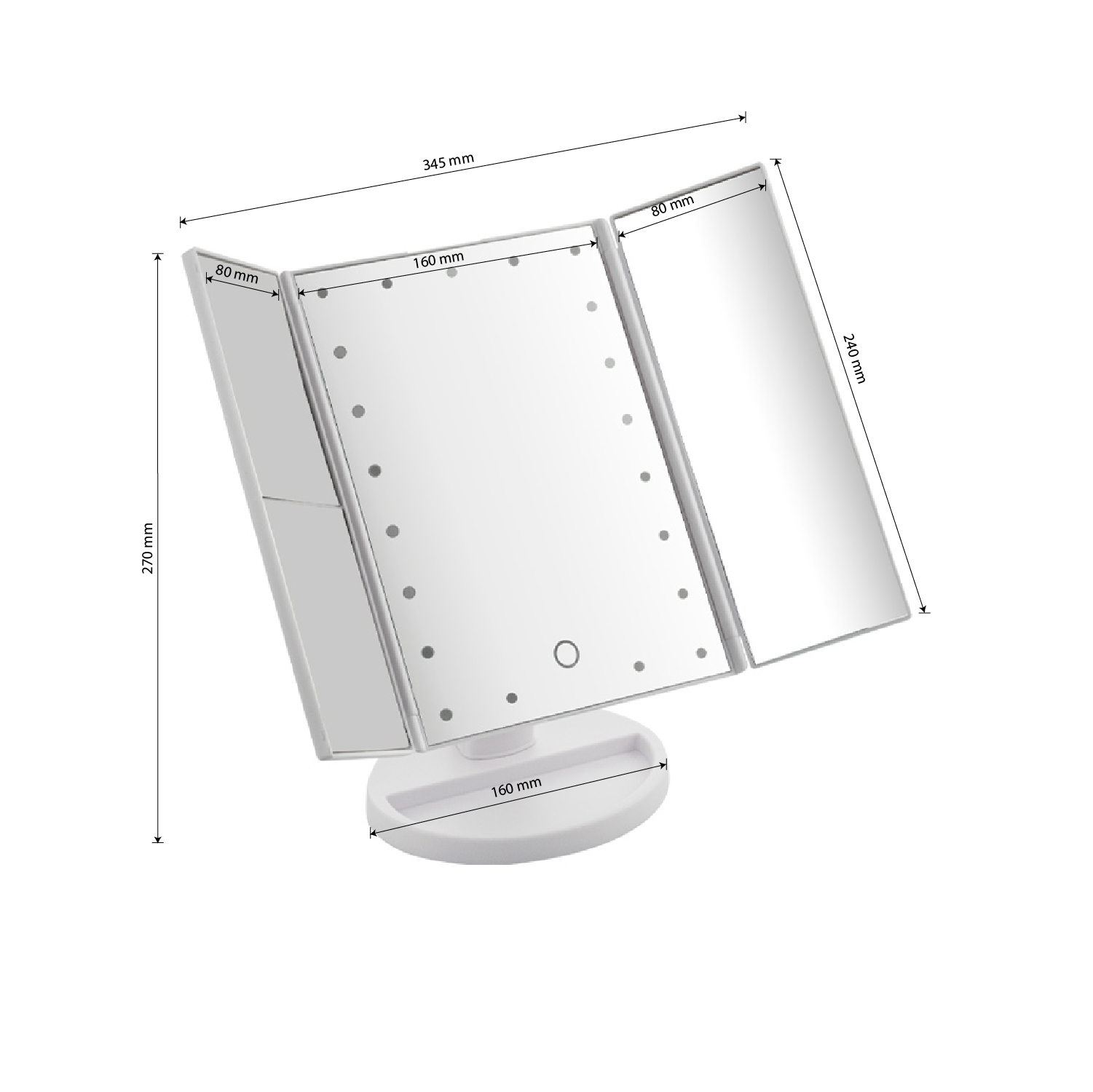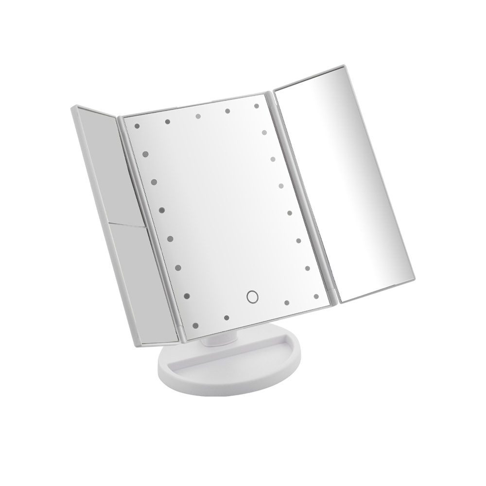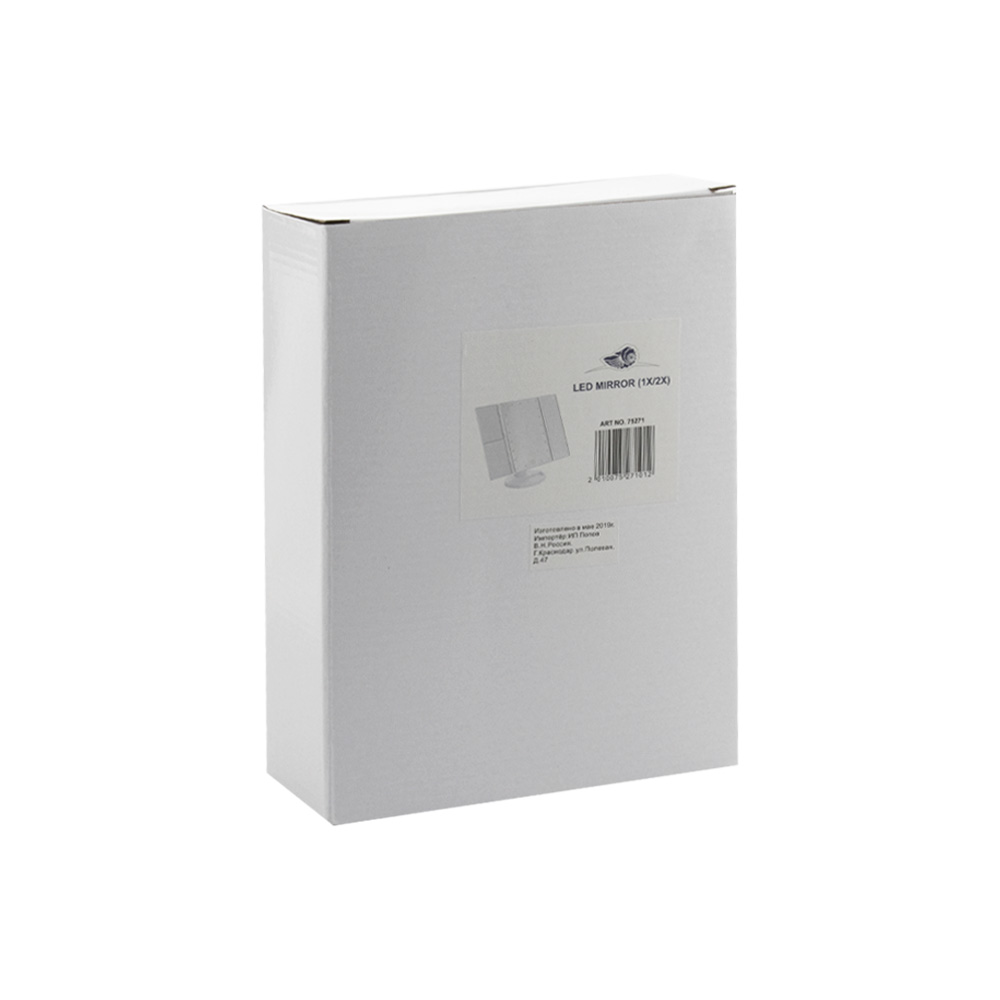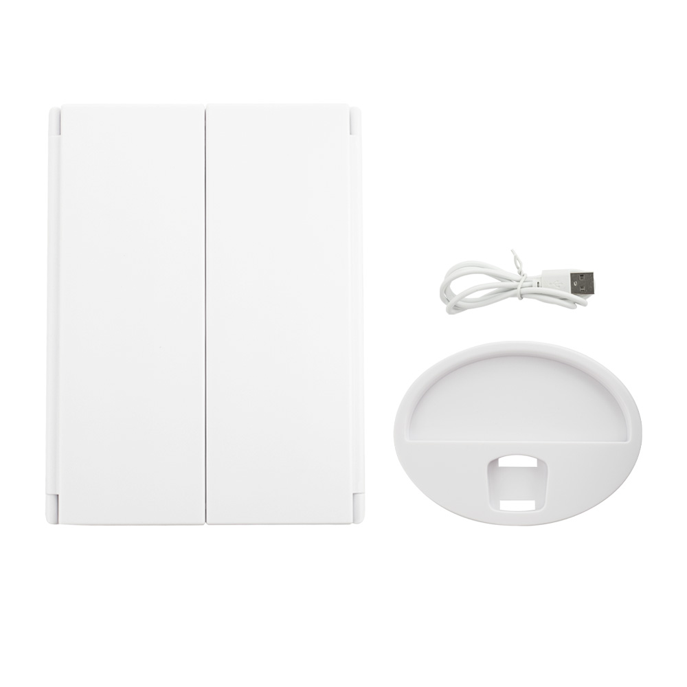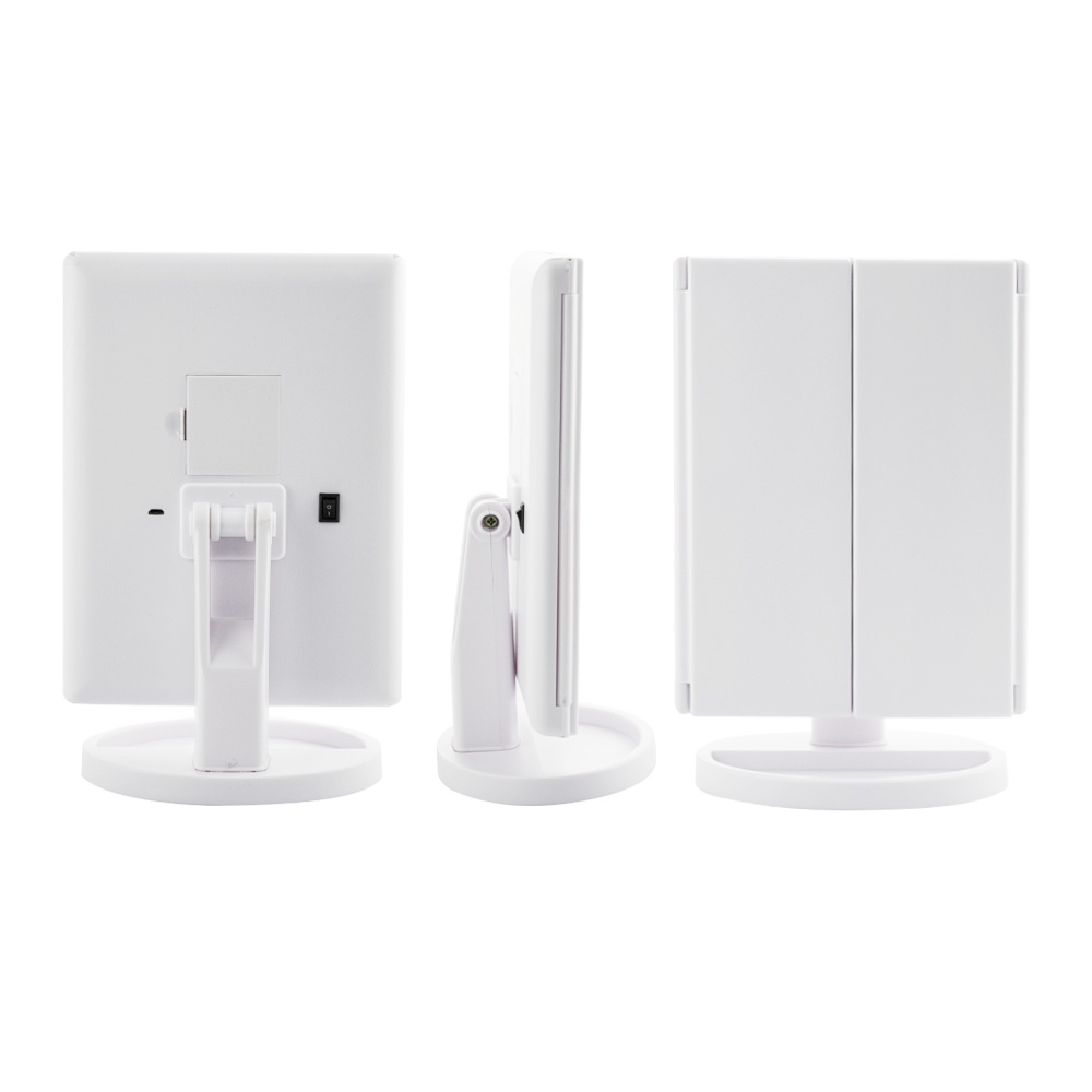 Зеркало косметическое, настольное, белое, со светодиодной подсветкой, раскладное, сенсорное, с подставкой для макияжных принадлежностей. Изготовлено из прочного пластика АБС, удобное для косметических процедур, нанесения макияжа и бритья, имеет вставки зеркал с двойным и тройным увеличением. Устанавливается на любую поверхность. Габаритные размеры: ширина 345 мм, высота 270, высота зеркал 240, ширина зеркал 80 мм и 160 мм и 80 мм, основание 160 мм. Вес - 0,900 кг, объём - 0,00395 м3.